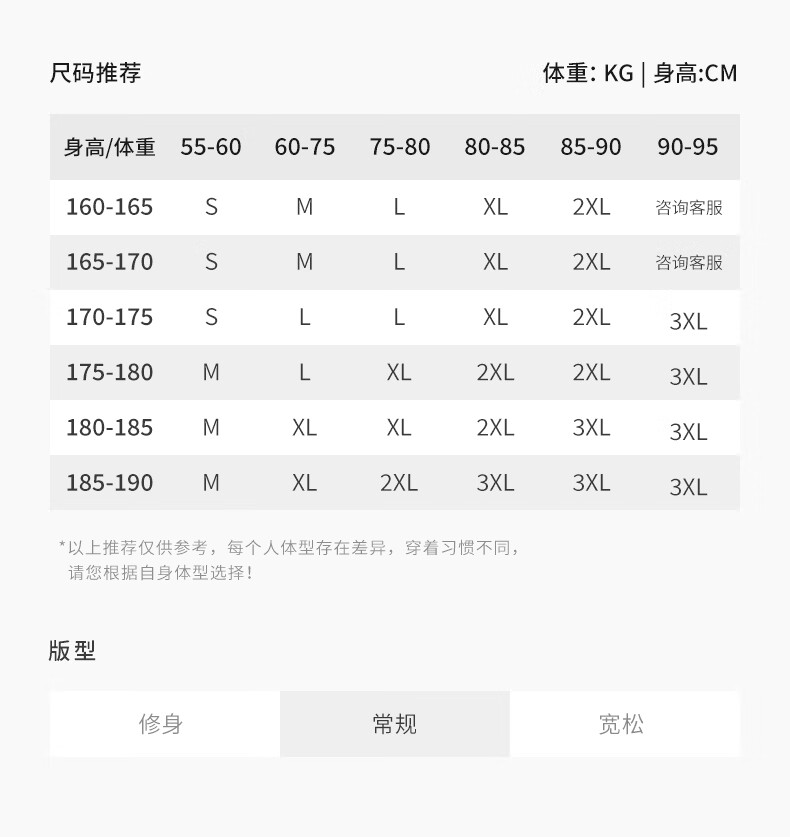 China (cm) 165 / 88-90 170 / 96-98 175 / 108-110 180 / 118-122 185 / 126-130