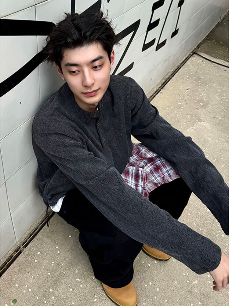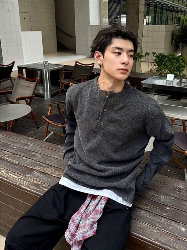 7 excellent products Henry collar long-sleeved T-shirt for men, autumn and winter American retro polo bottoming shirt, loose casual top for men ZSFZ-38033 dark gray M