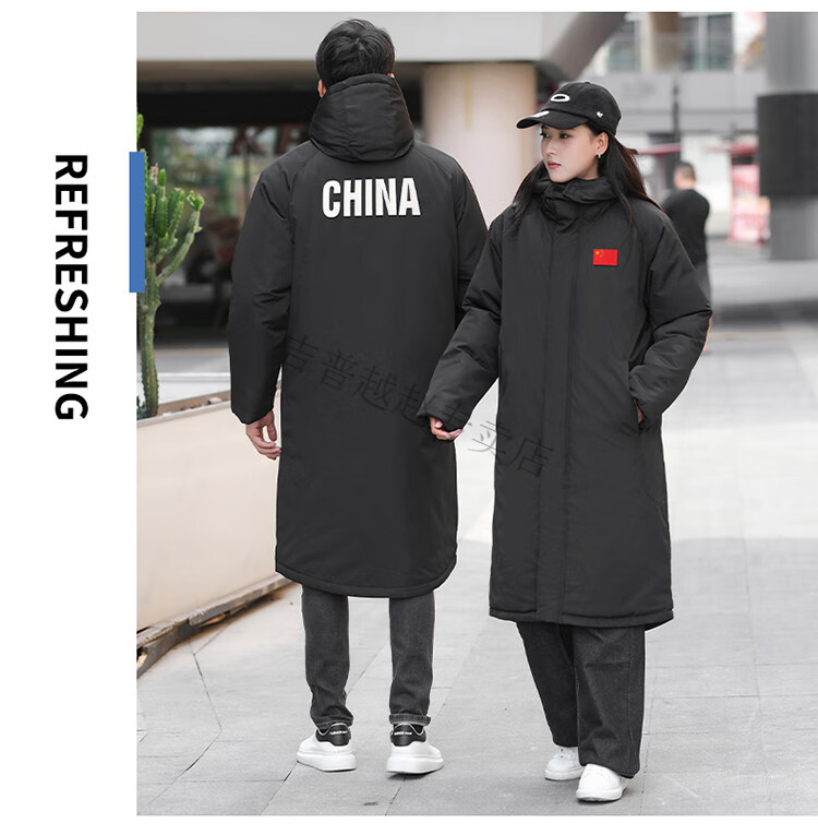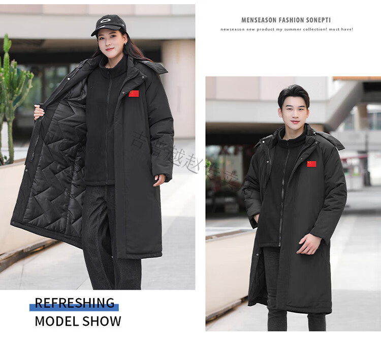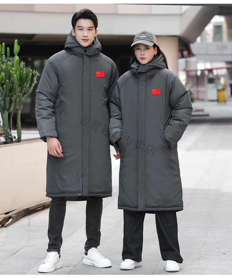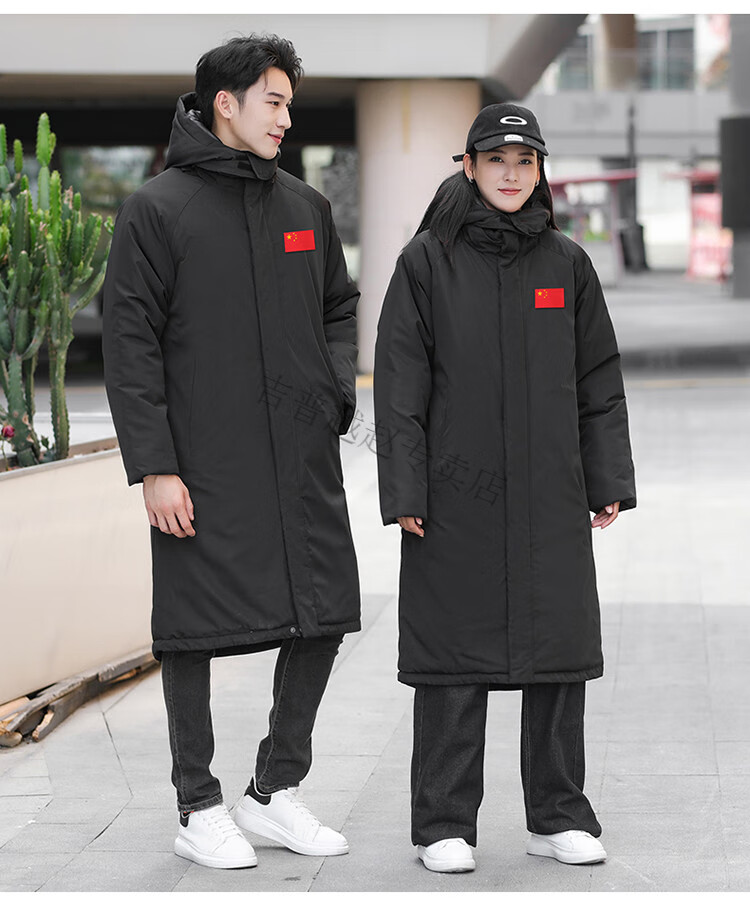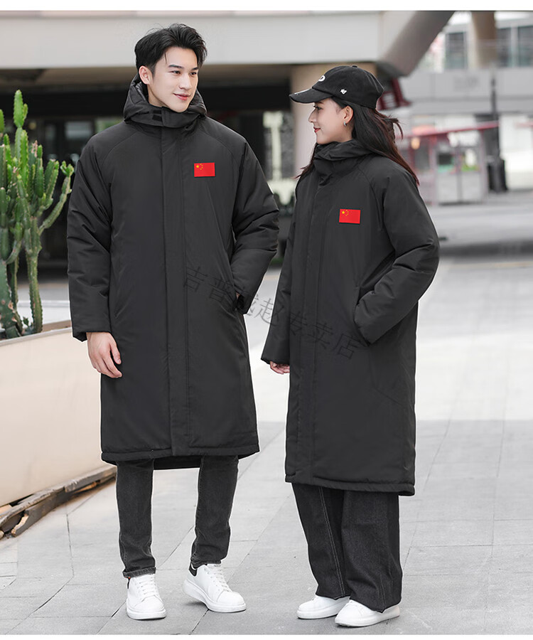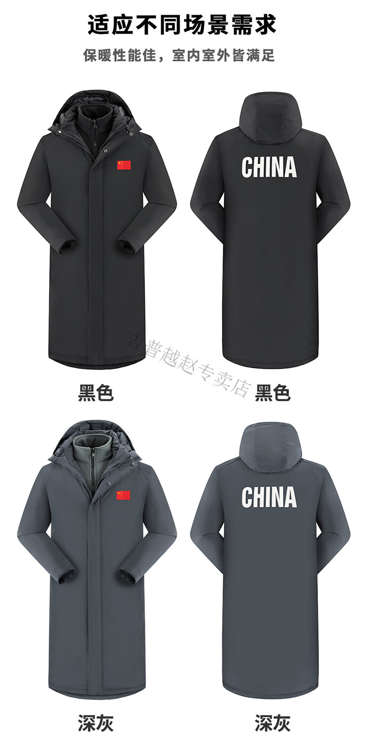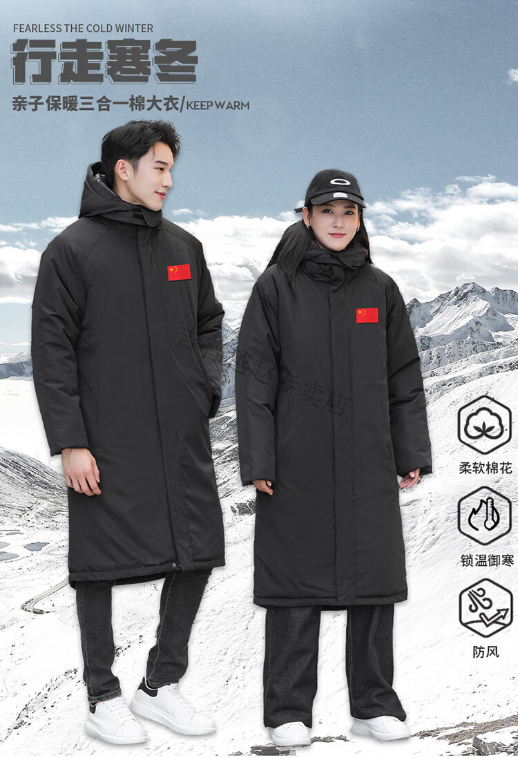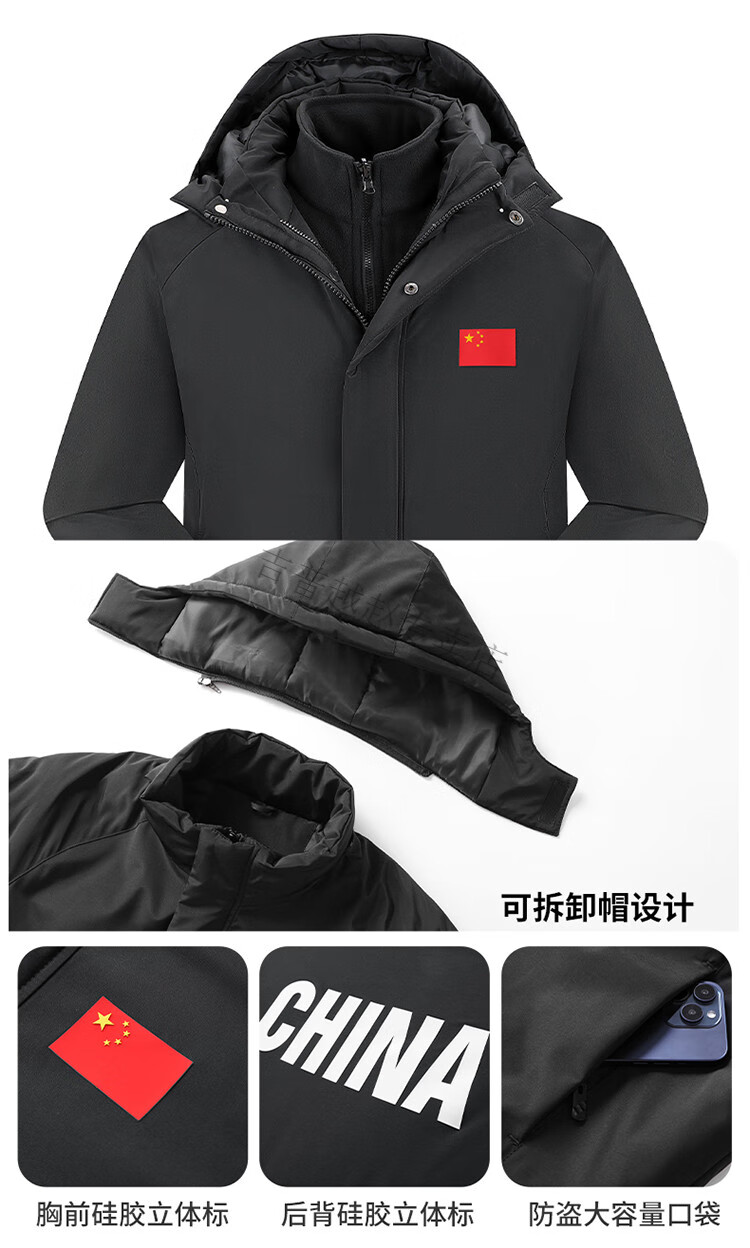JEEP SPIRIT National Team Three-in-One Charge Cotton Coat Detachable Men's and Women's Thickened Over-the-Knee Long Winter Training Cotton Clothes for Sports Students S7 Flag CHINA Black Polar Fleece Liner S