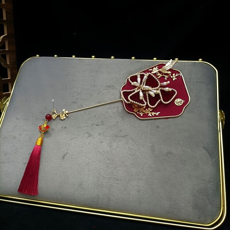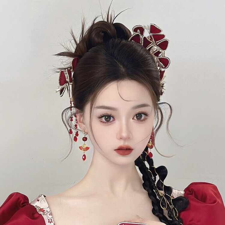 New super fairy bride's dressing gown toasting headdress new Chinese style dressing gown headdress red high-end velvet flower set wedding dress dressing gown hair fork set
