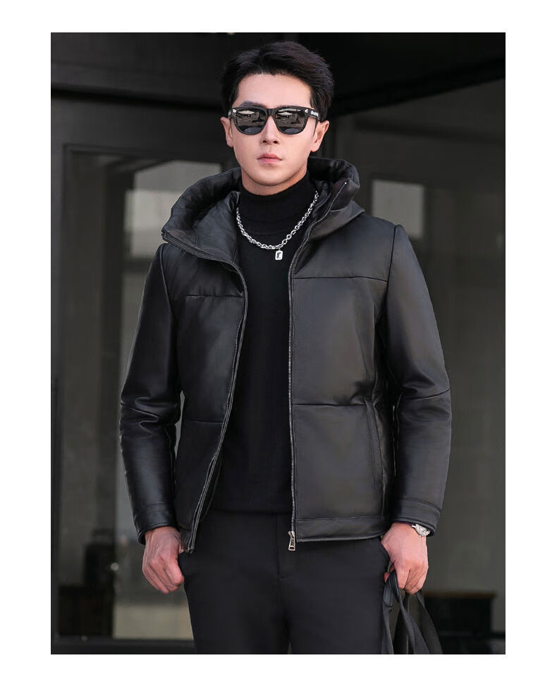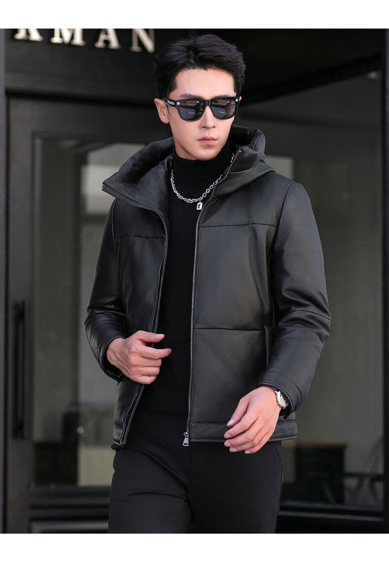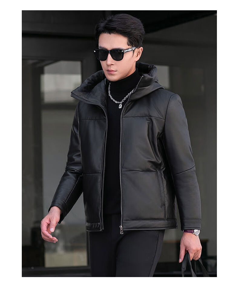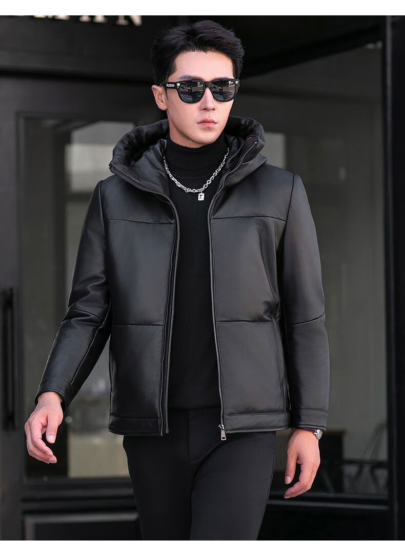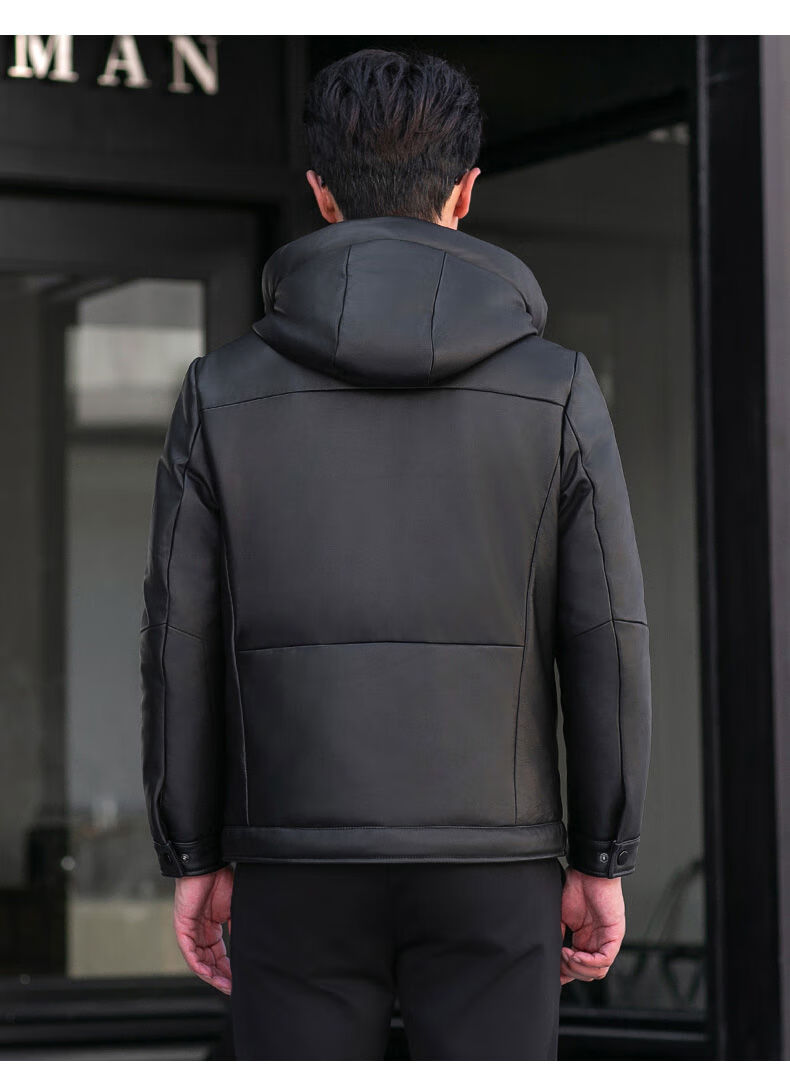 Jialedi winter Haining genuine leather jacket men's down jacket short sheepskin hooded jacket plus velvet thickened duck down jacket black M 17048