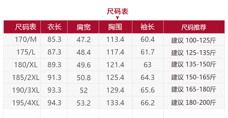 China (cm) 165 / 88-90 170 / 96-98 175 / 108-110 180 / 118-122 185 / 126-130