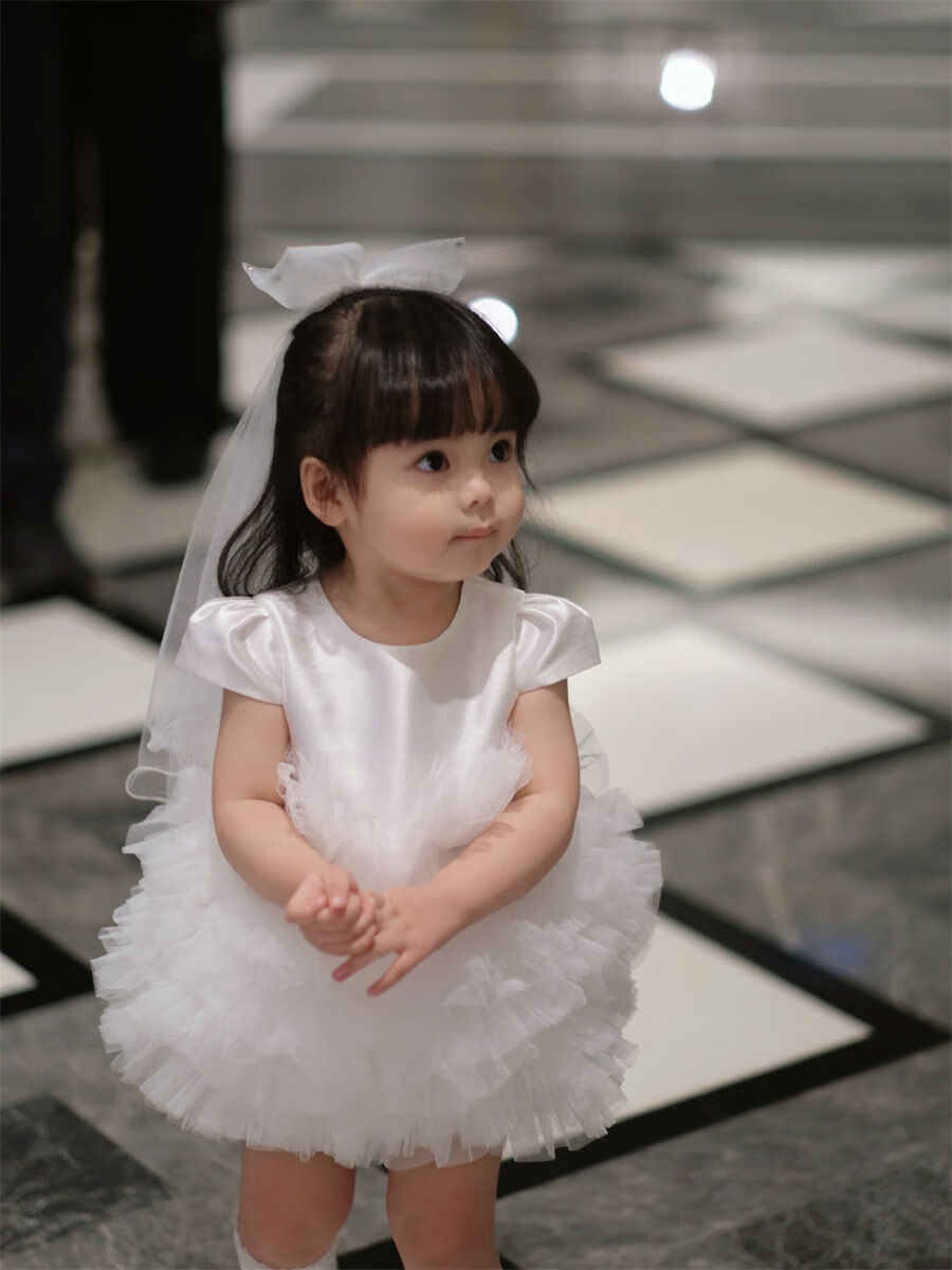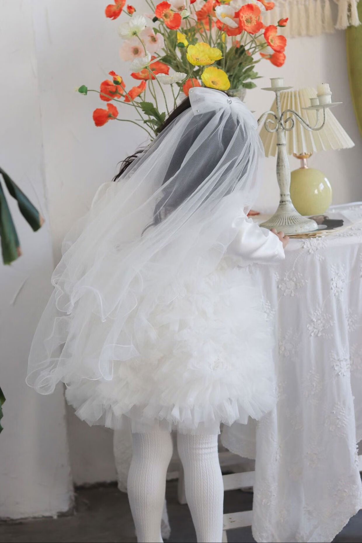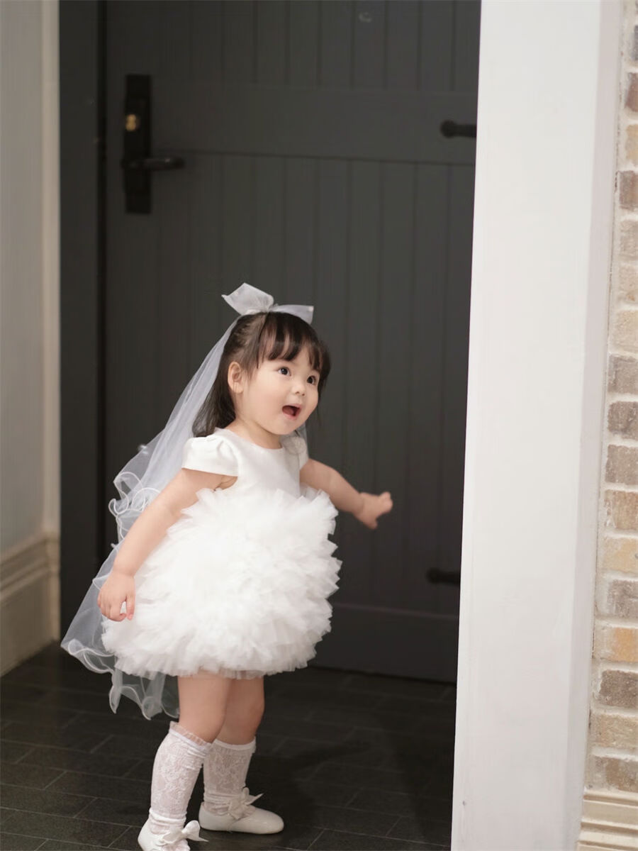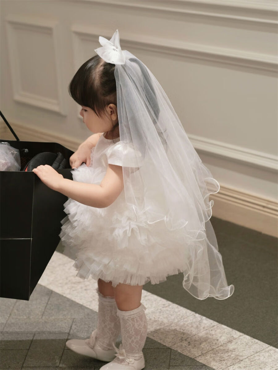 White girl's first birthday wedding dress, flower girl wedding dress, female princess dress, short-sleeved dress, tutu skirt, white short-sleeved dress, veil 80 80cm