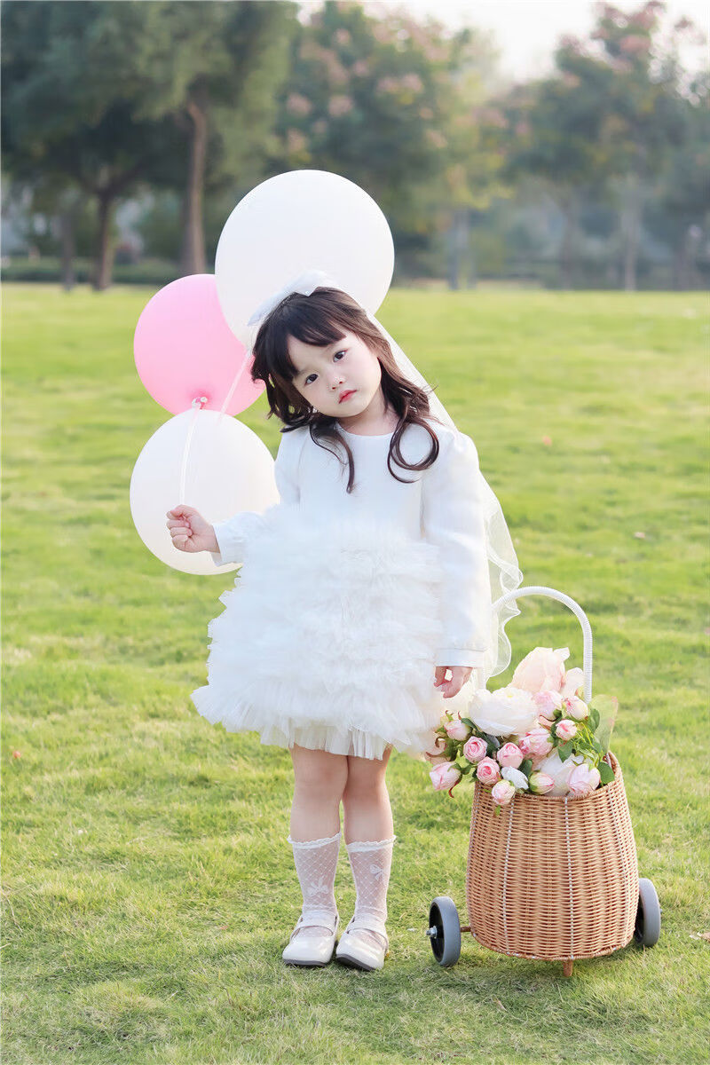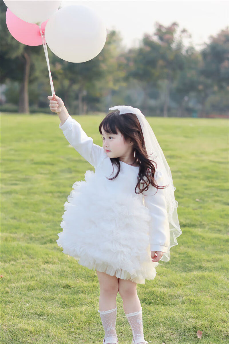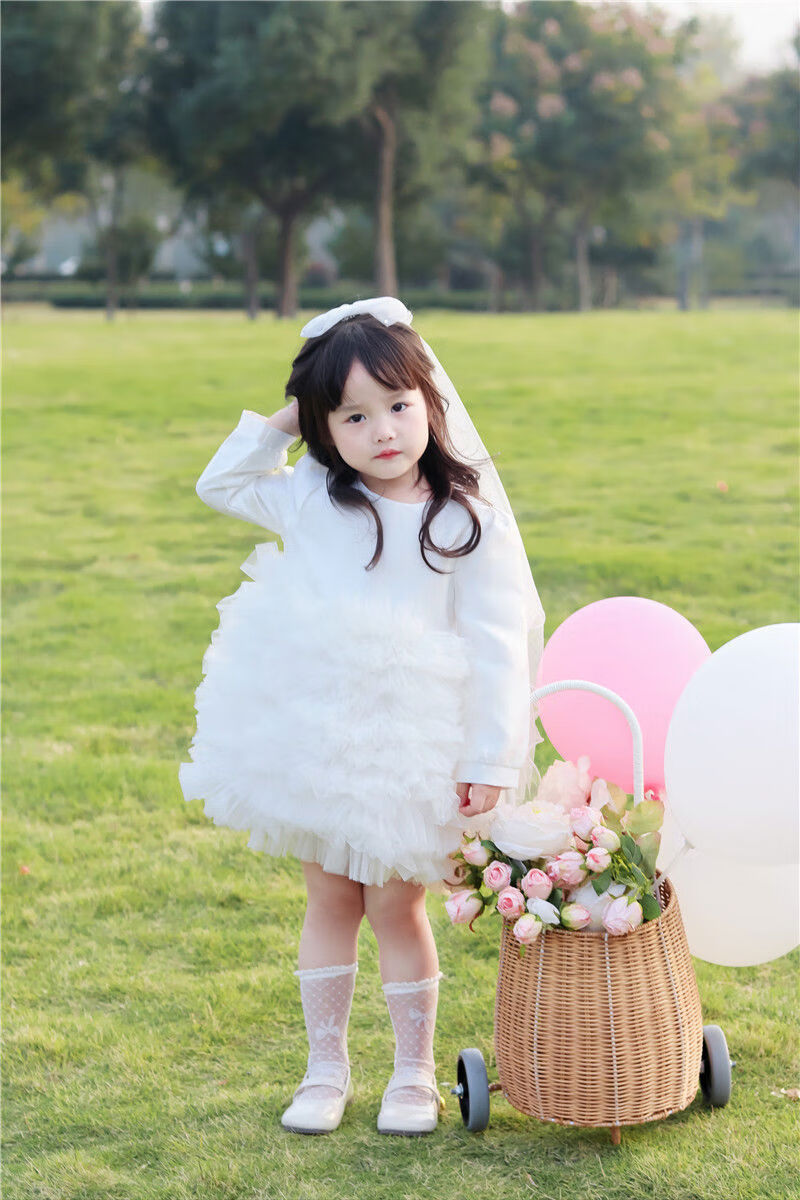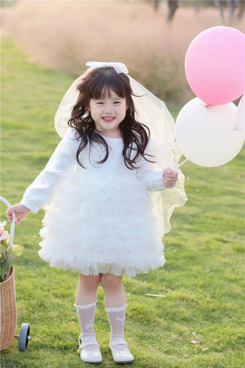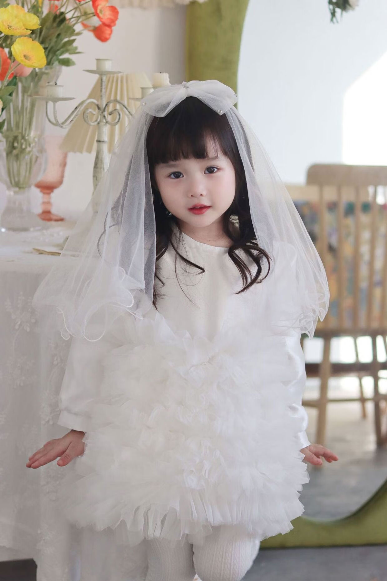 White girl's first birthday wedding dress, flower girl wedding dress, female princess dress, short-sleeved dress, tutu skirt, white short-sleeved dress, veil 80 80cm