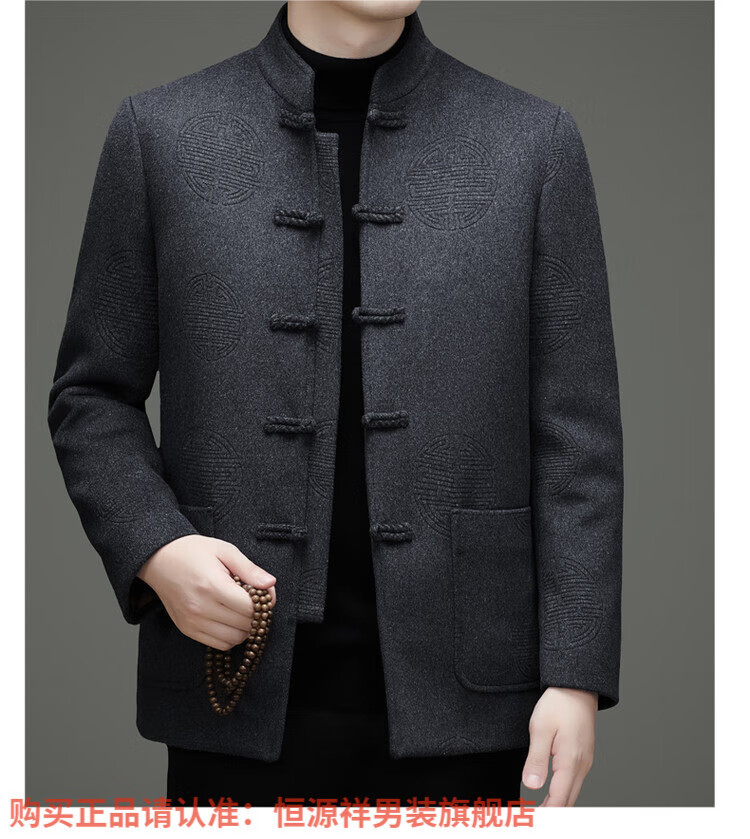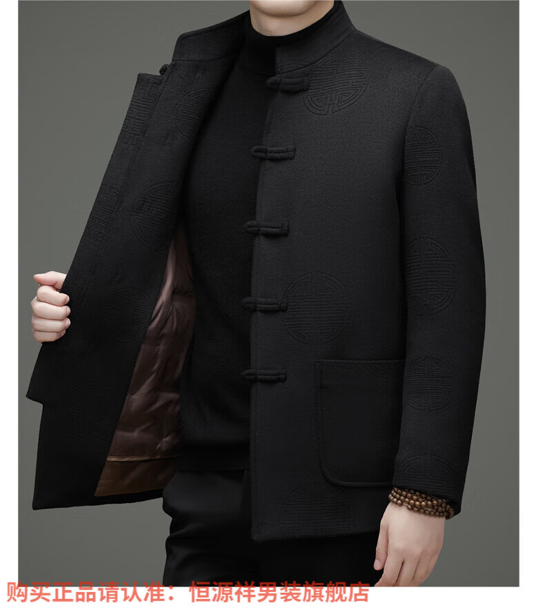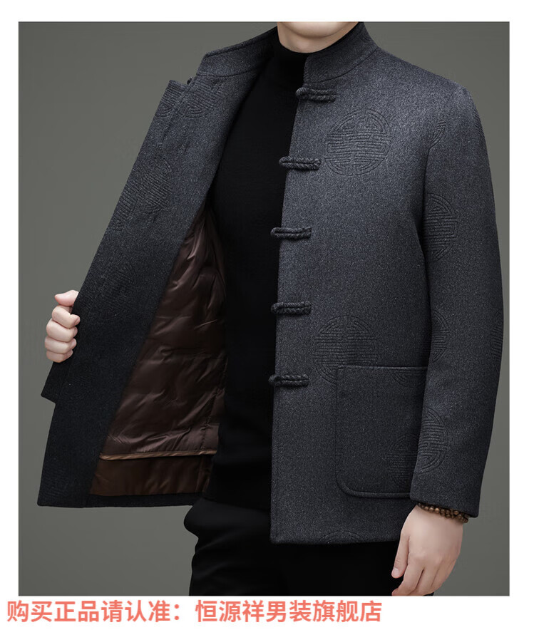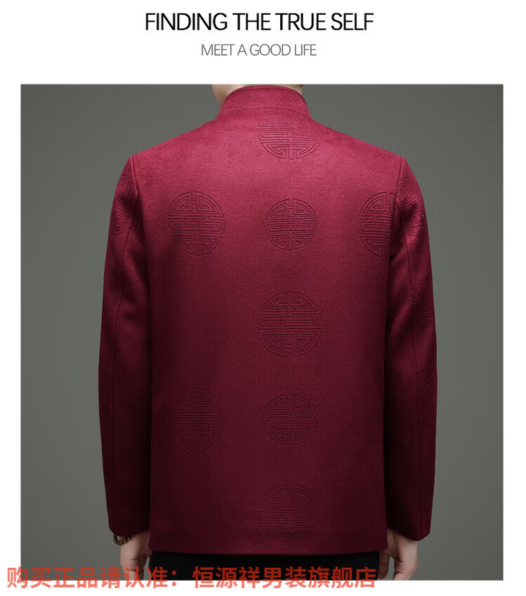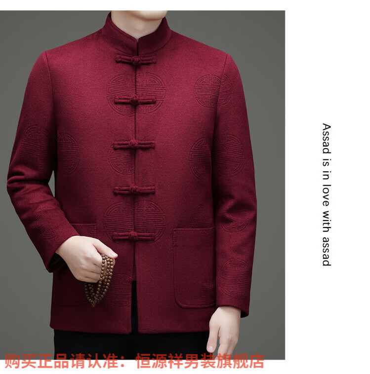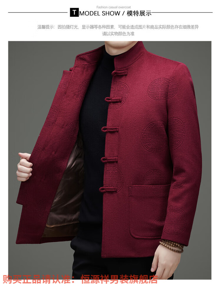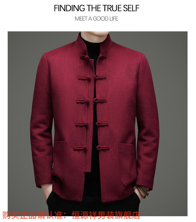 Hengyuanxiang New Chinese Style Stand Collar Woolen Tang Suit Men's Autumn and Winter Middle-aged and Elderly Thickened Down Liner Buttoned Tunic Jacket Red Top Removable Liner L 175