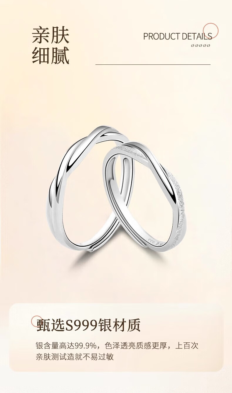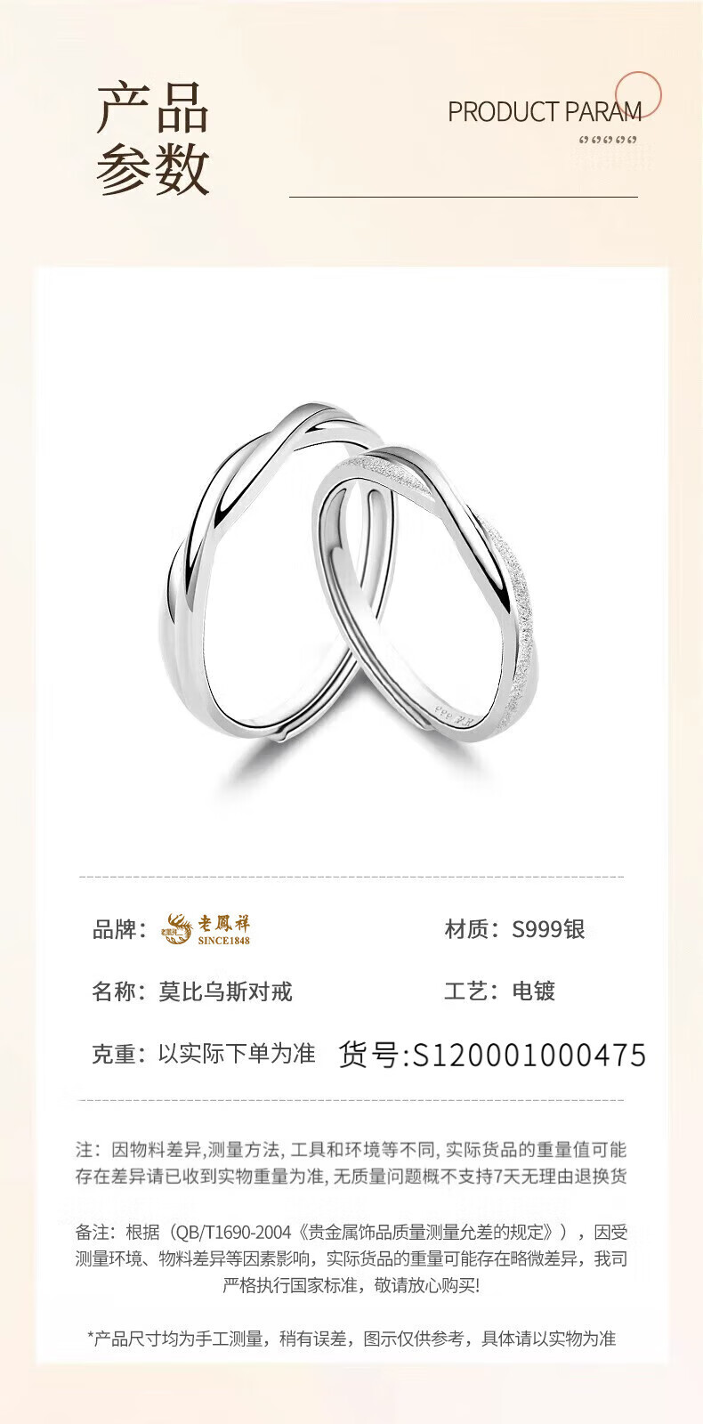 Lao Fengxiang 999 Pure Silver Couple Ring Mobius Silver Confession Ring Couple Anniversary Gift for Boyfriend and Girlfriend Mobius Love Ring + Customized Engraving