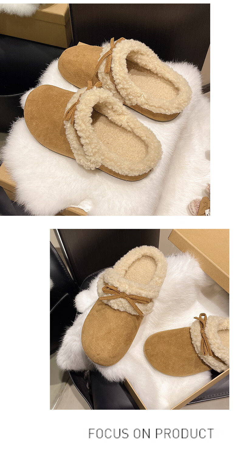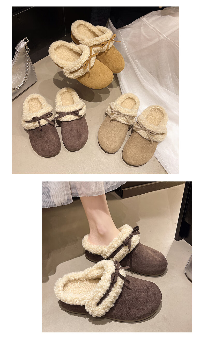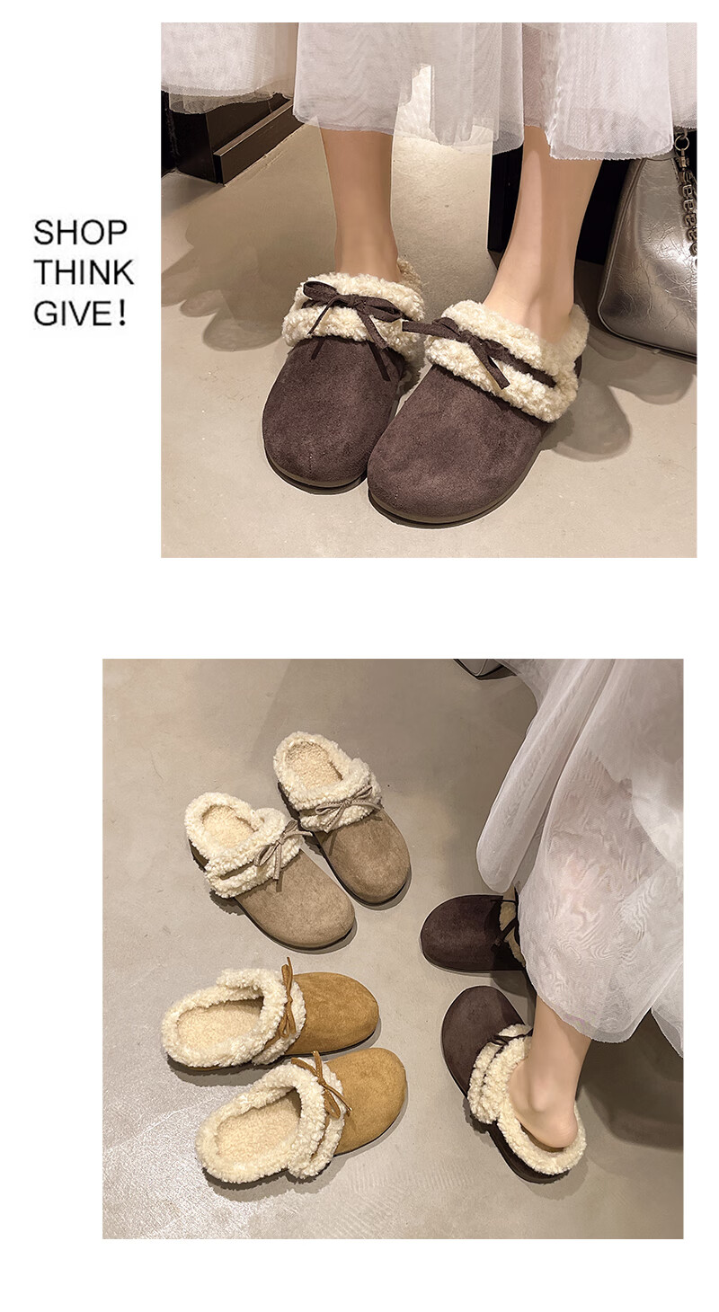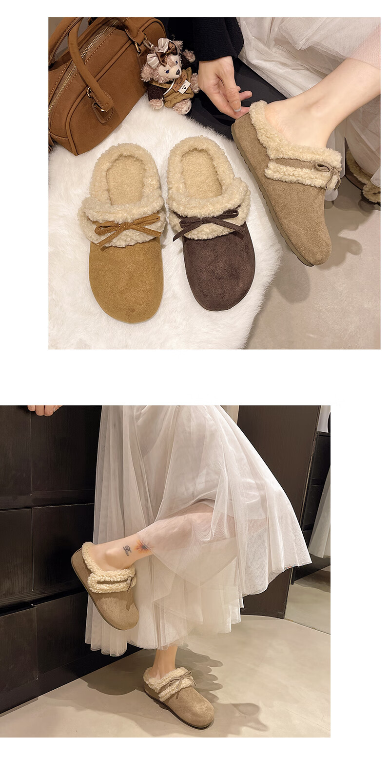 Retro bow thick-soled toe-cap fur slippers for women for outer wear 2025 new autumn and winter plus velvet warm Birkenstock cotton slippers C80 card color 37