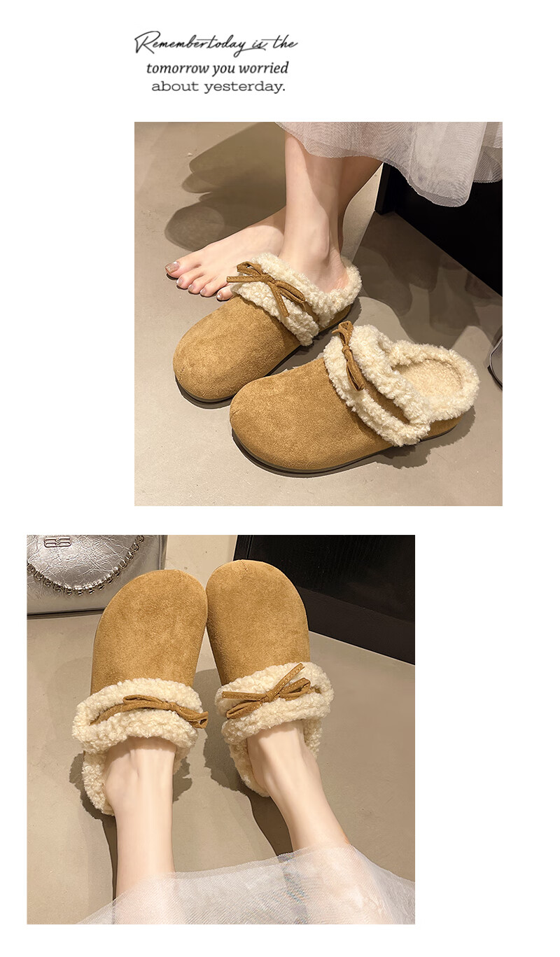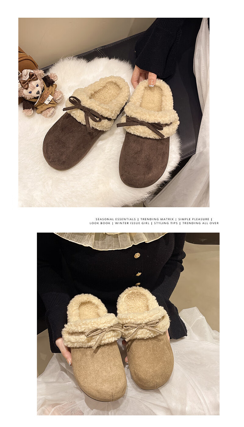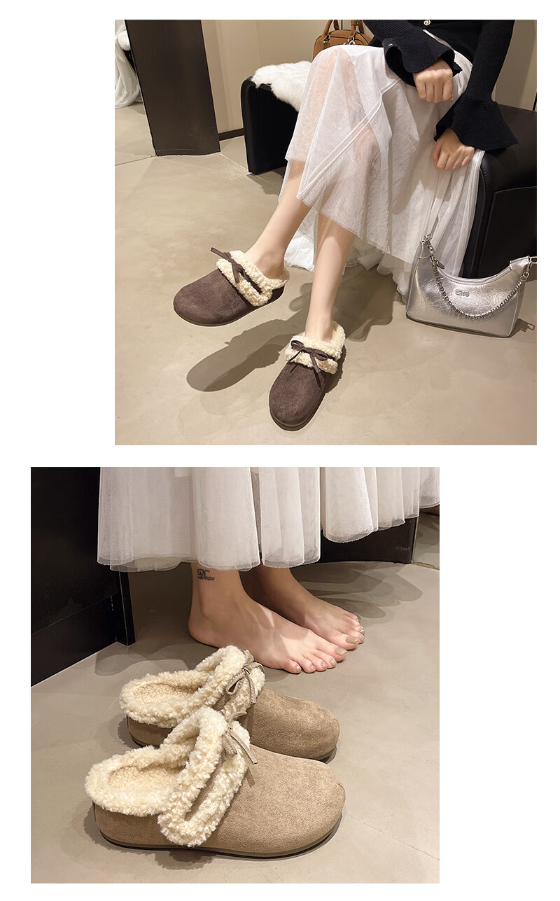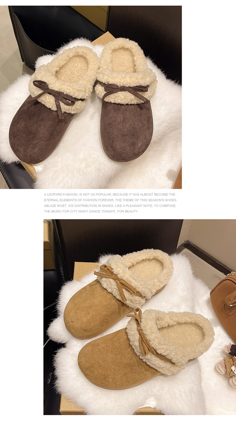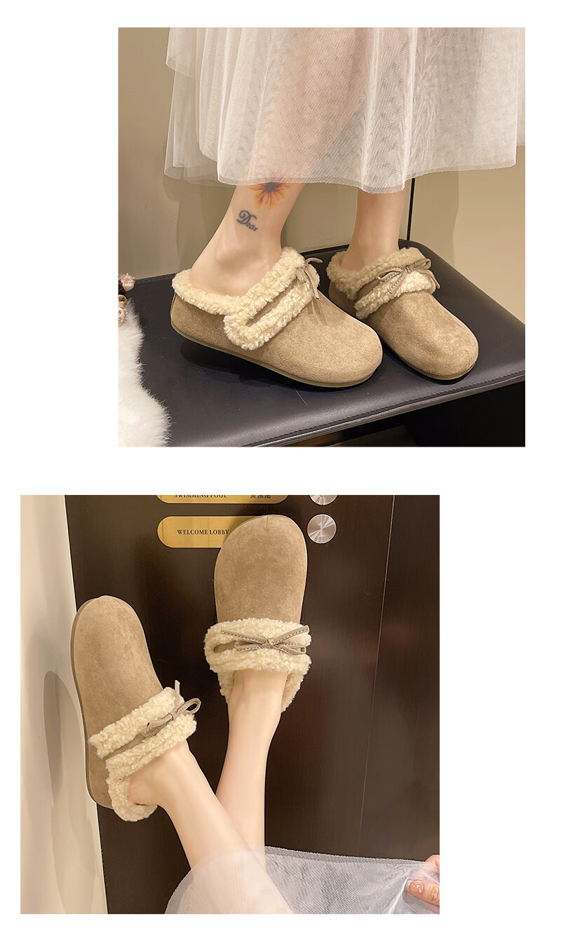 Retro bow thick-soled toe-cap fur slippers for women for outer wear 2025 new autumn and winter plus velvet warm Birkenstock cotton slippers C80 card color 37