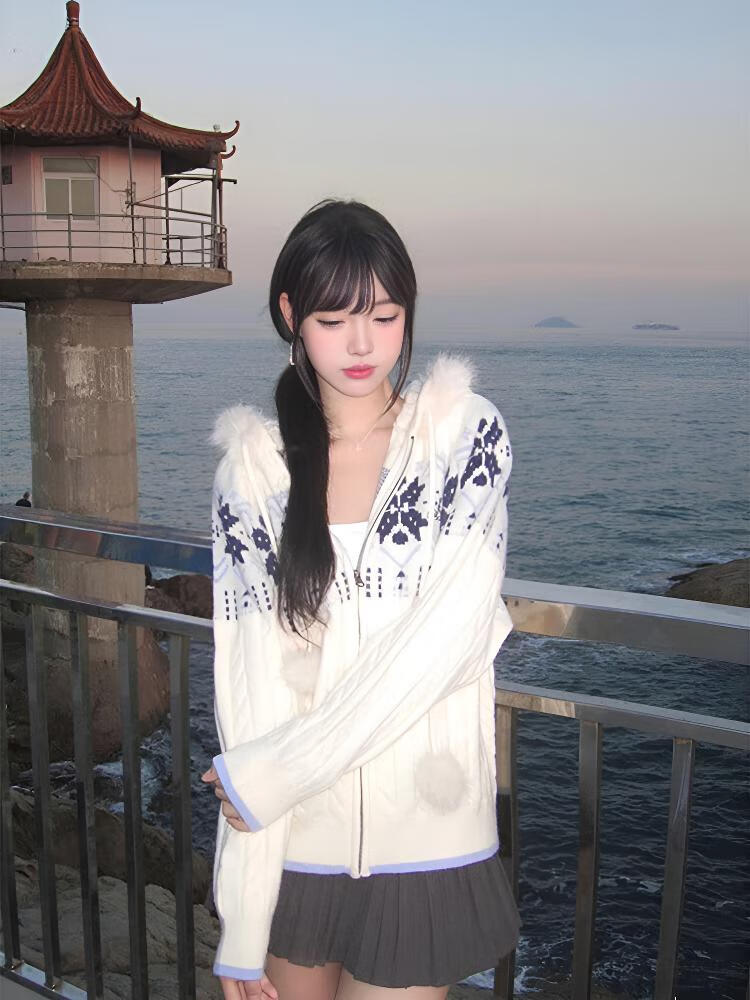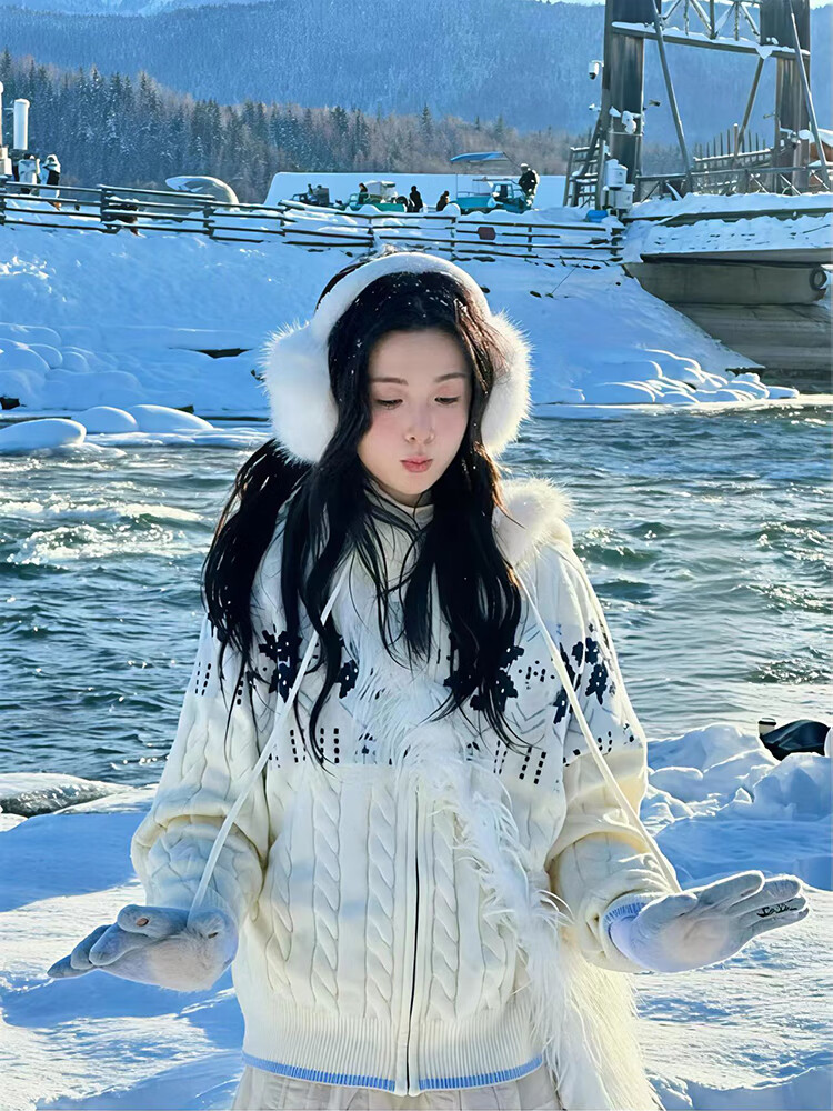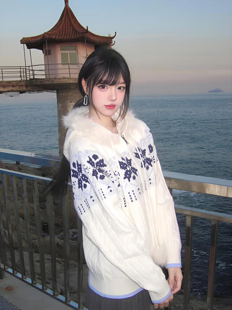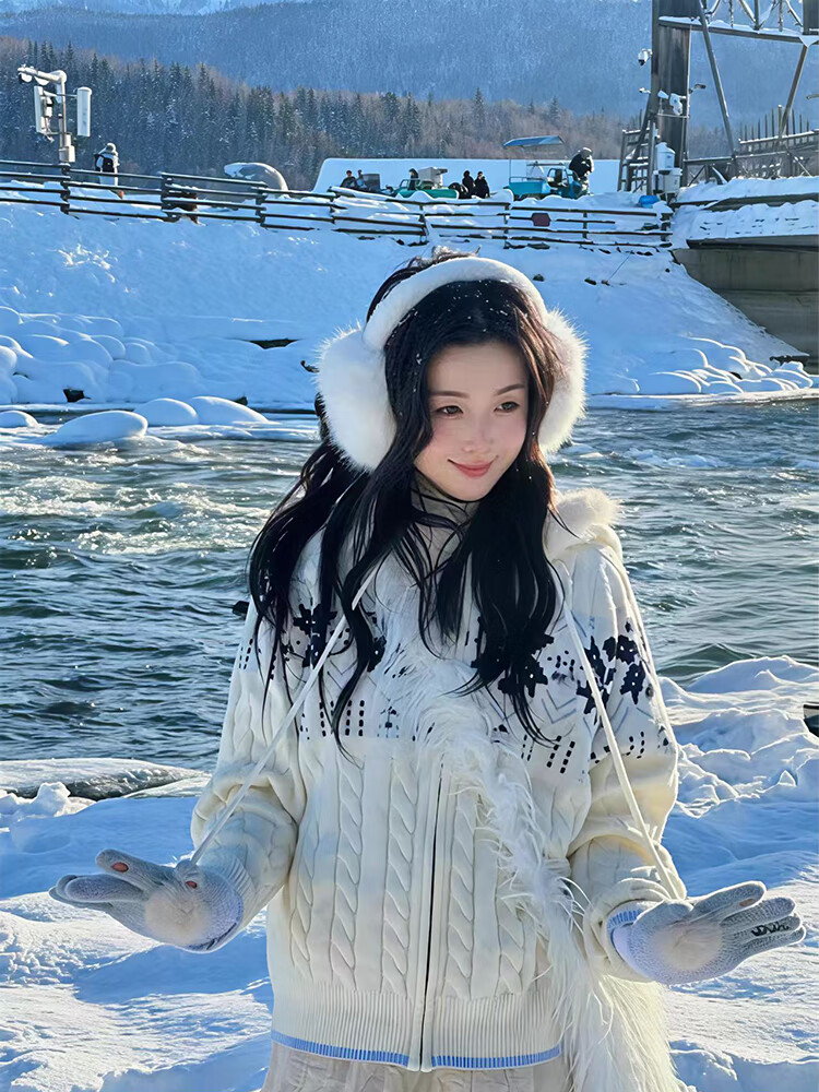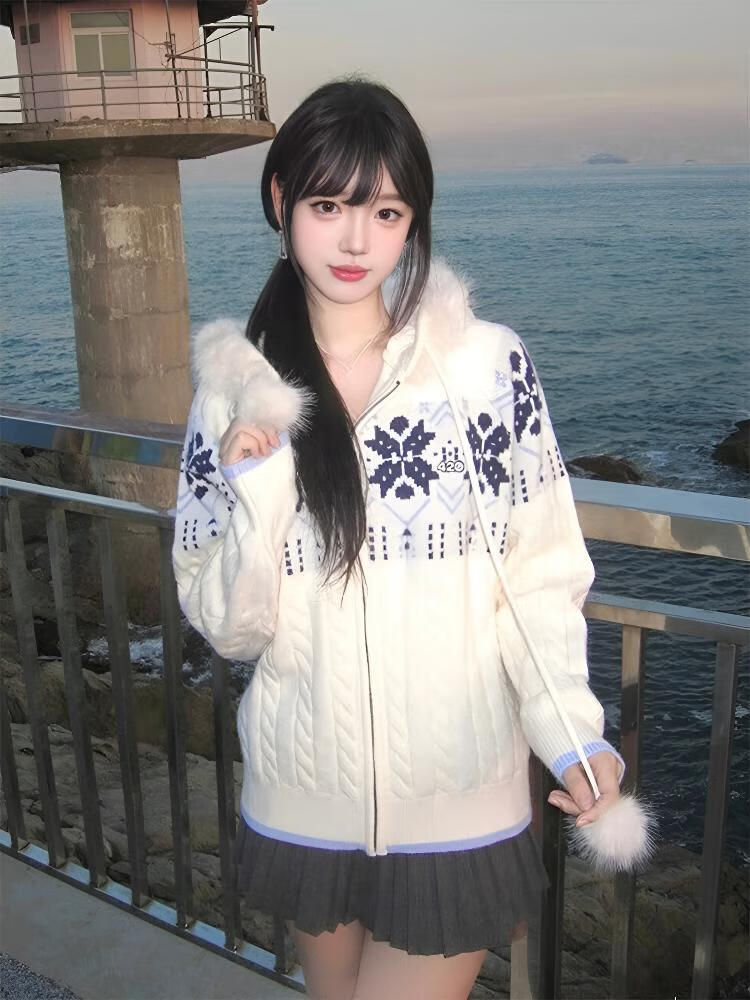 Clothing Yuan Fair Isle Sweater White Zipper Jacket Women's 2025 Autumn and Winter Popular Lazy Style Twist Hooded Knitted Cardigan White One Size (85-125Jin Jin is equal to 0.5 kg)