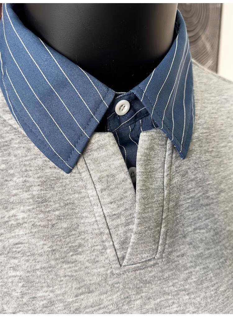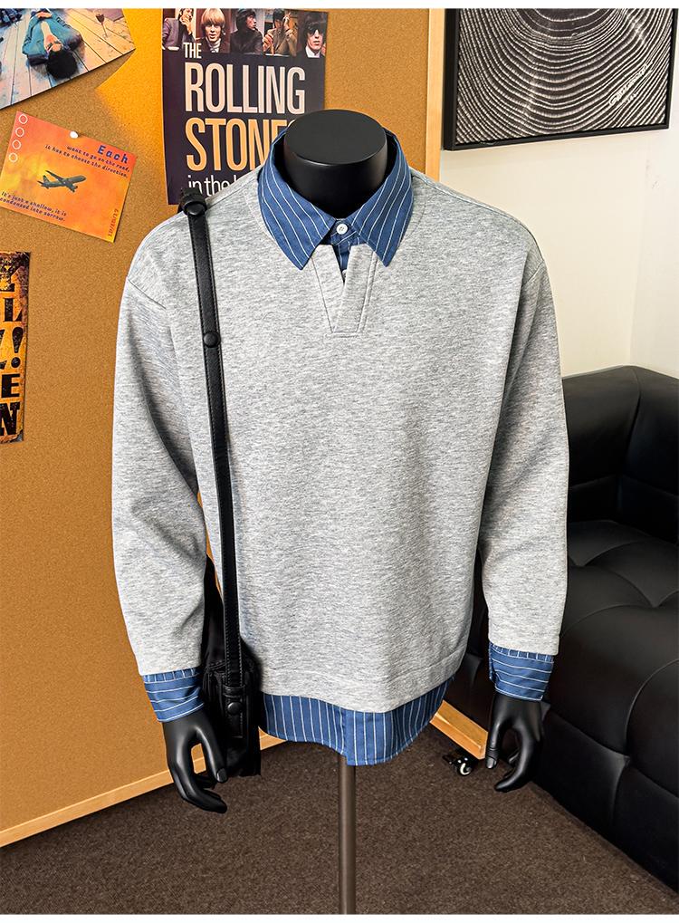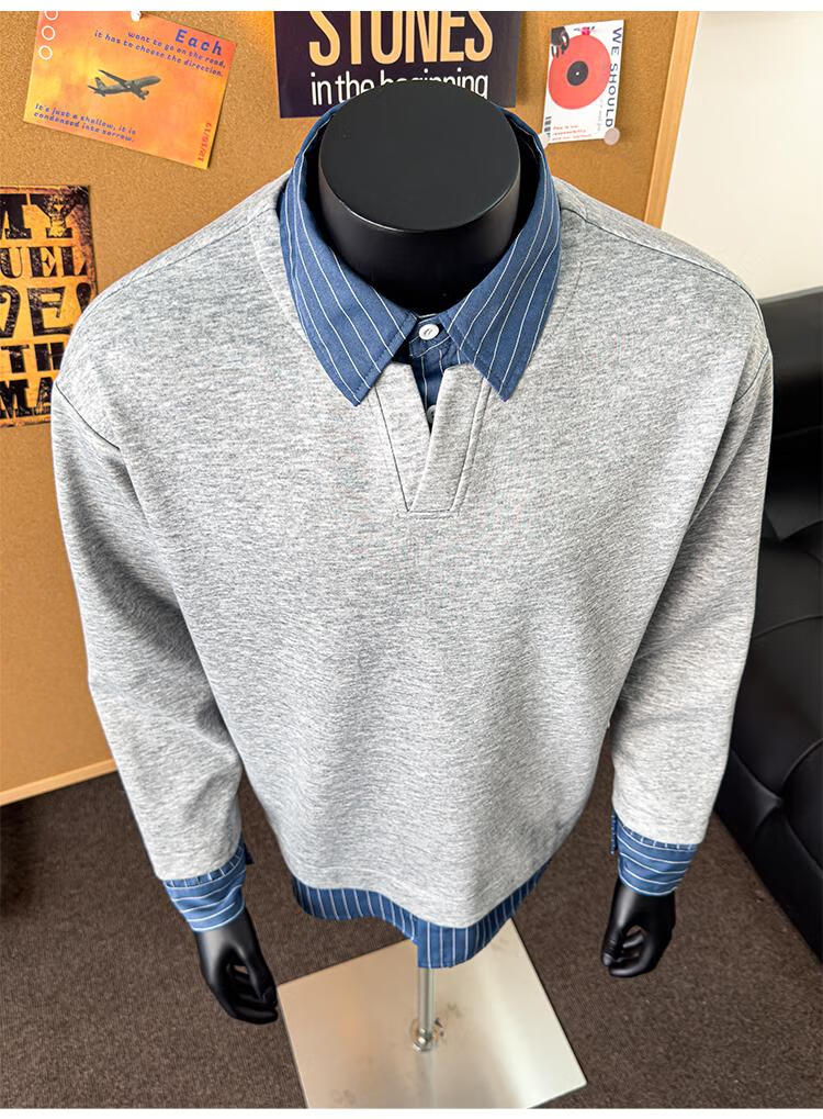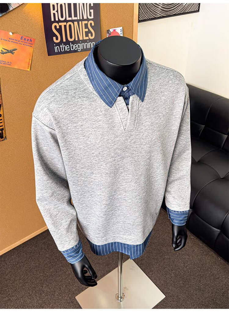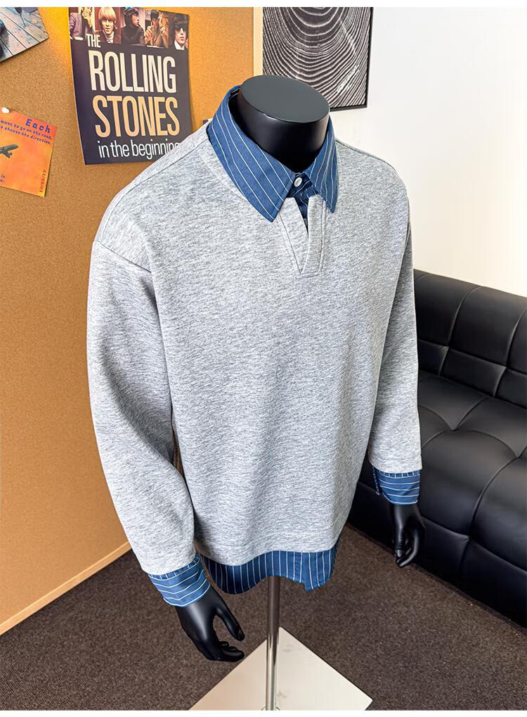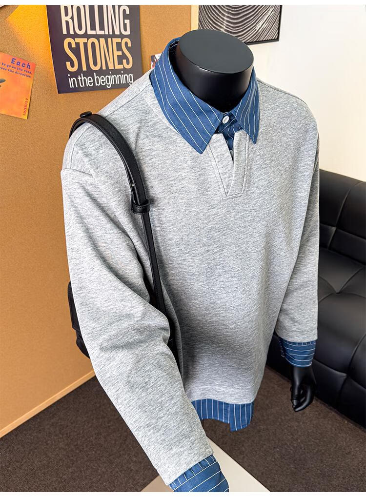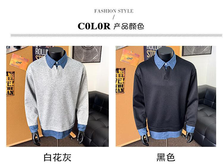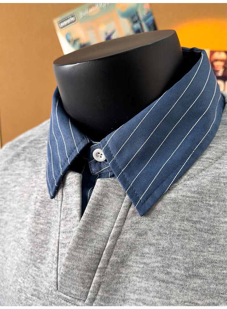 Gray fake two-piece shirt collar sweatshirt for men, spring American polo shirt, Henry collar long-sleeved T-shirt inner top, white floral gray, upgraded style M, priority for collection and purchase b