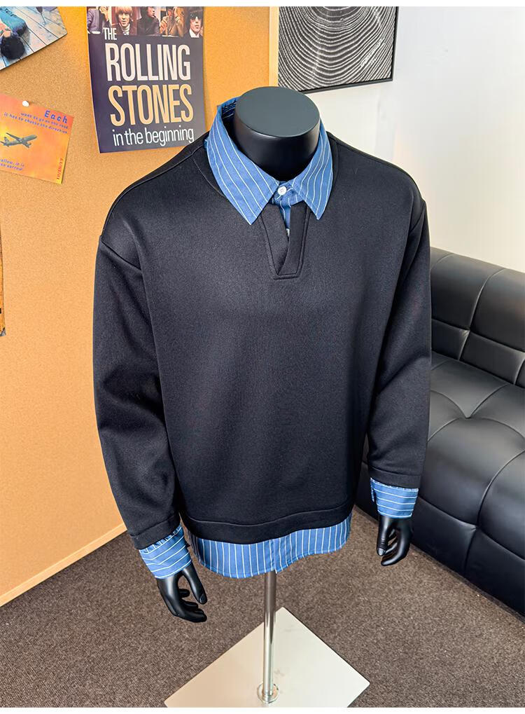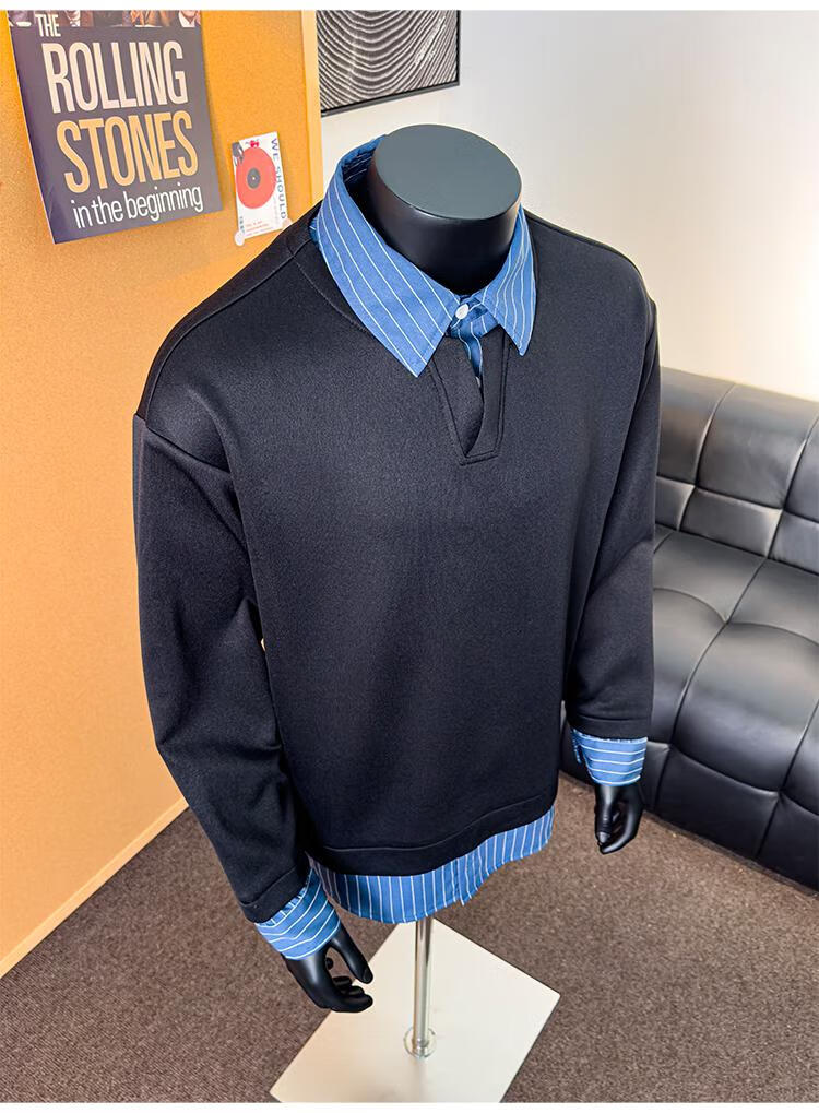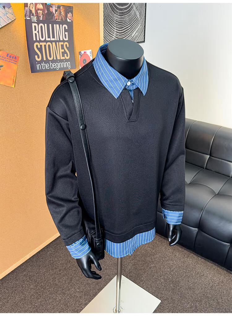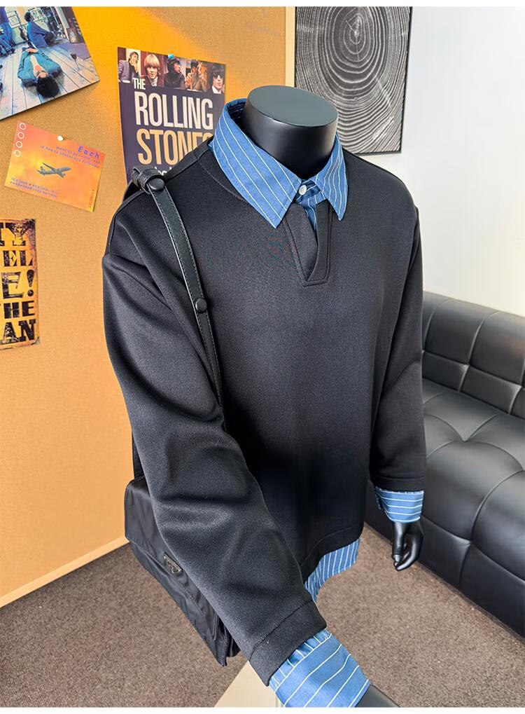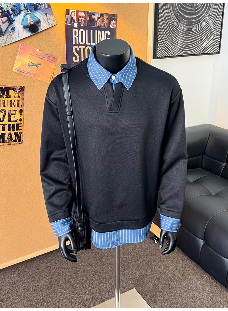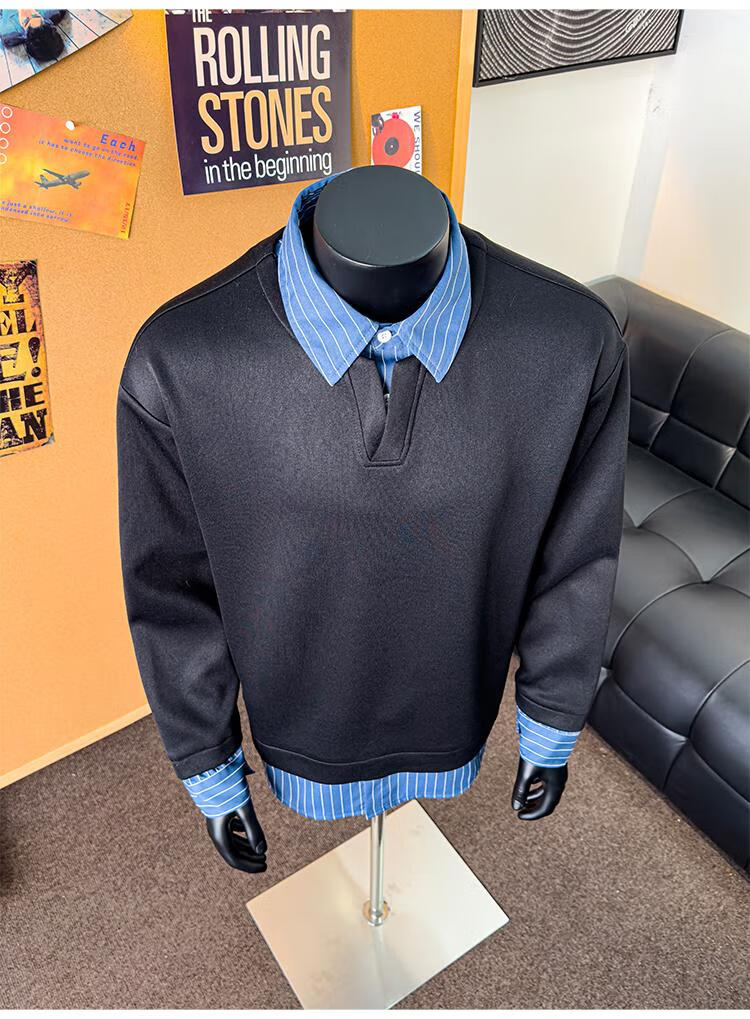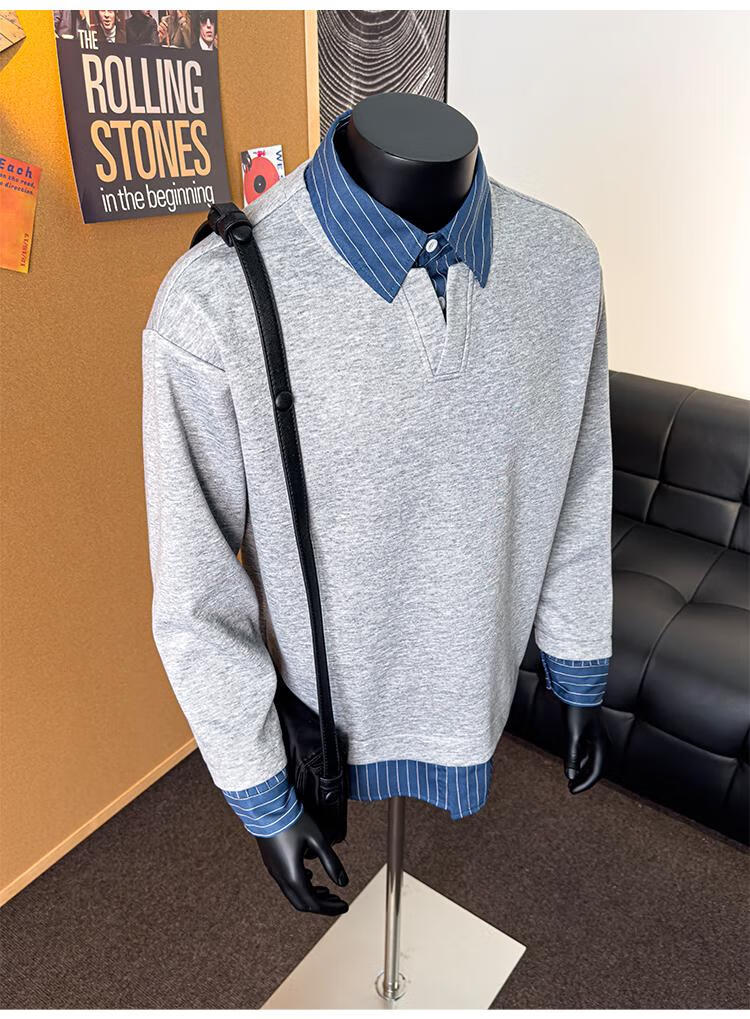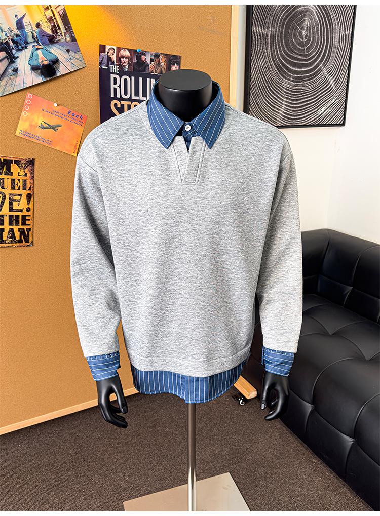 Gray fake two-piece shirt collar sweatshirt for men, spring American polo shirt, Henry collar long-sleeved T-shirt inner top, white floral gray, upgraded style M, priority for collection and purchase b