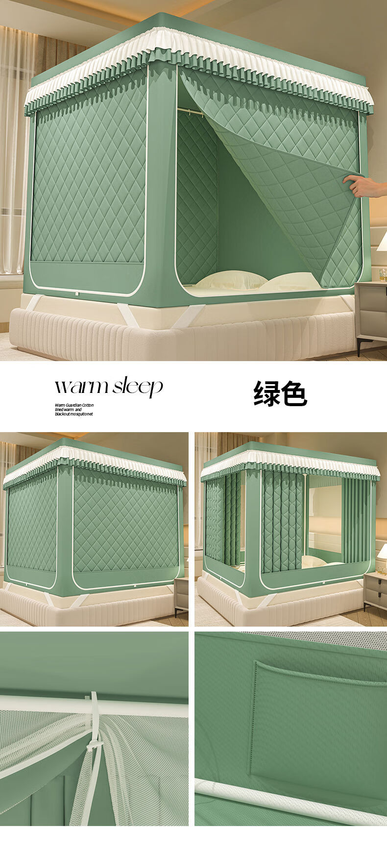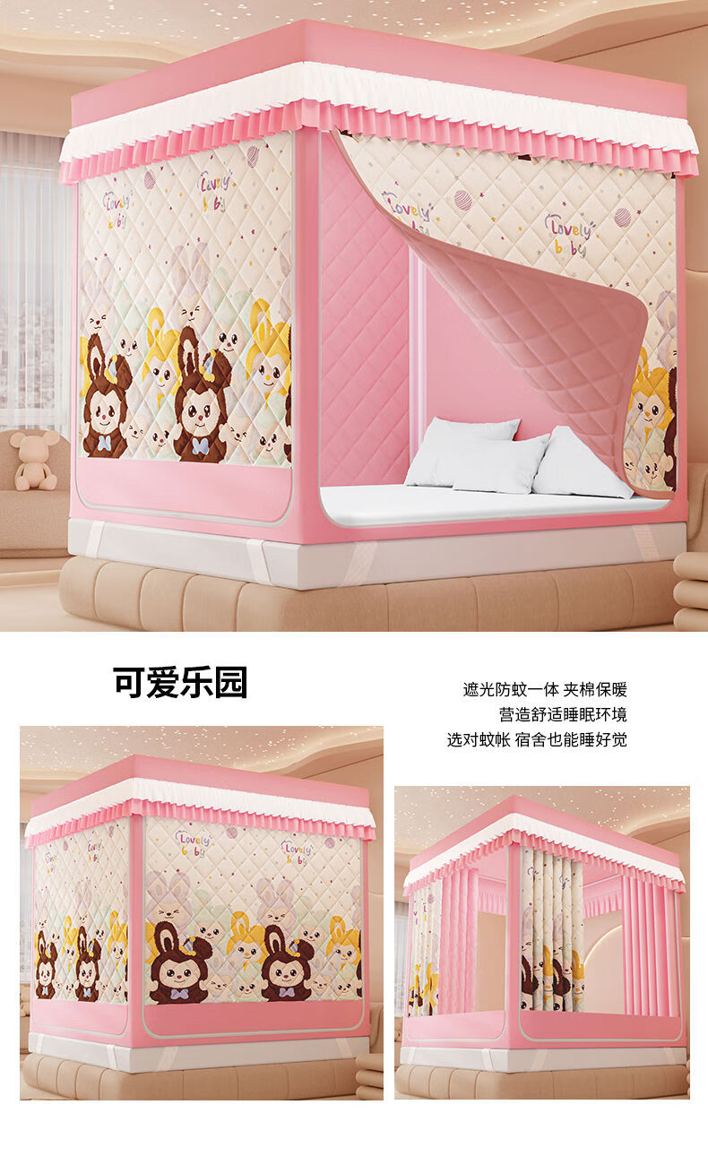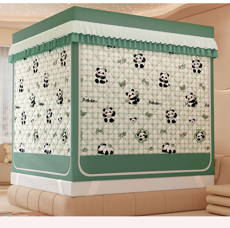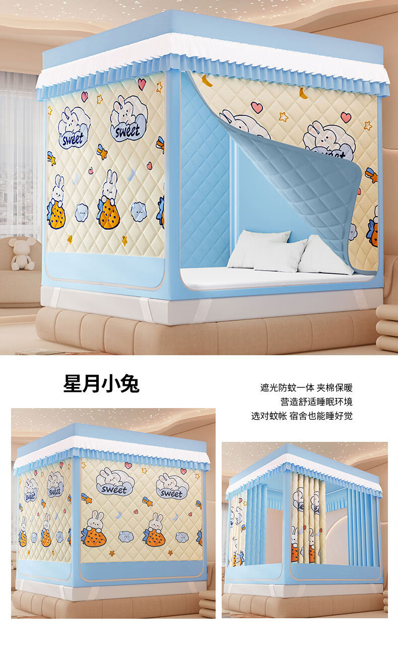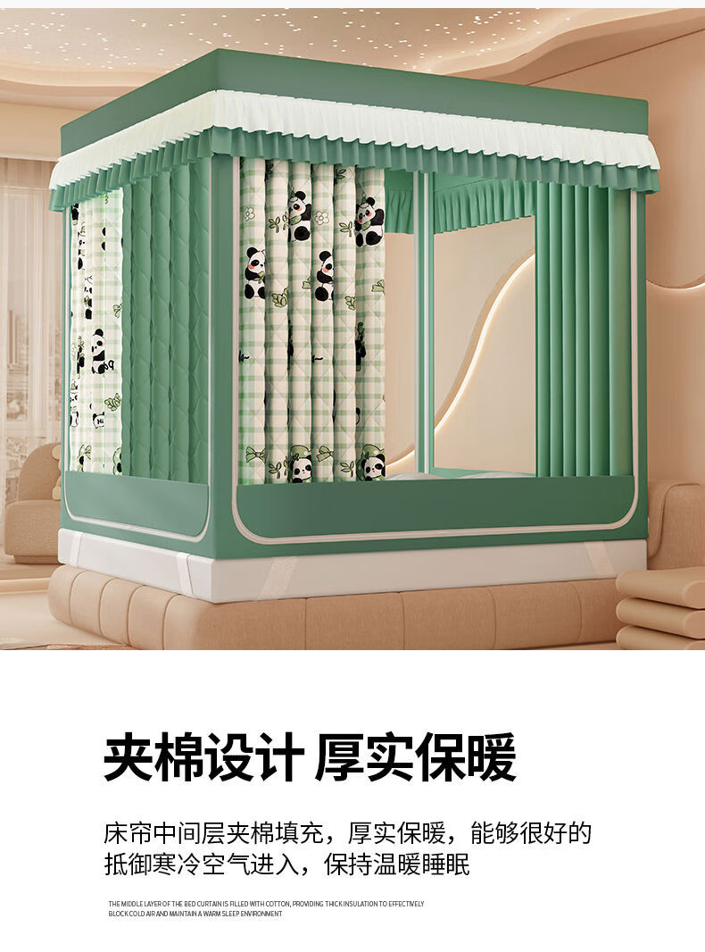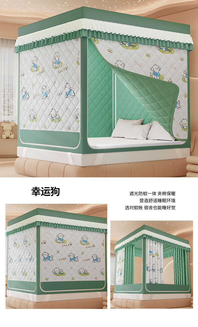 Yusenyi autumn and winter warm and cold-proof mosquito net, quilted home baby anti-fall bed tent with zipper and thickened bracket new style quilted lucky dog A-type encrypted tent + three-sided quilted blackout curtain + windproof and warm + back-end suitable for bed-width 1*length 190cm