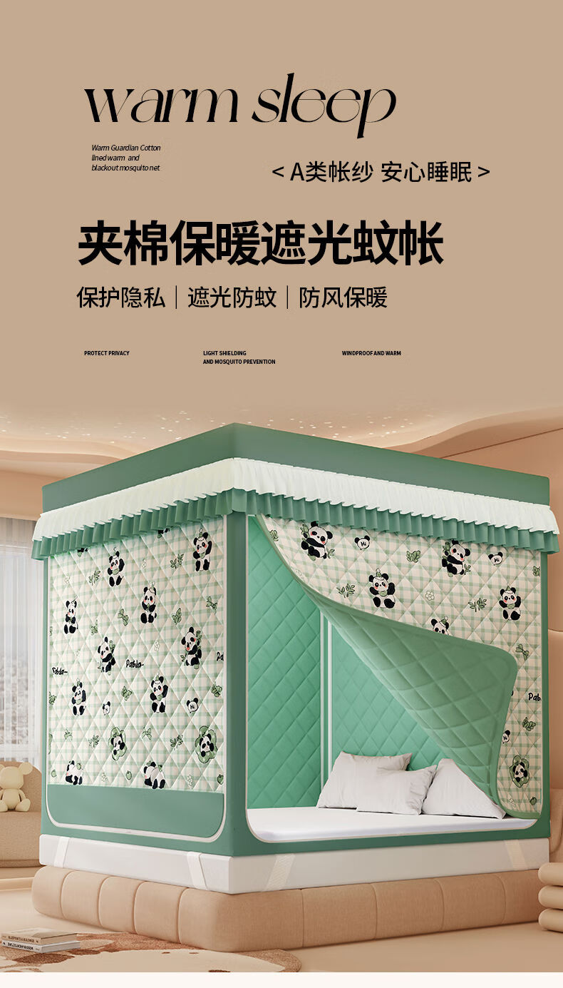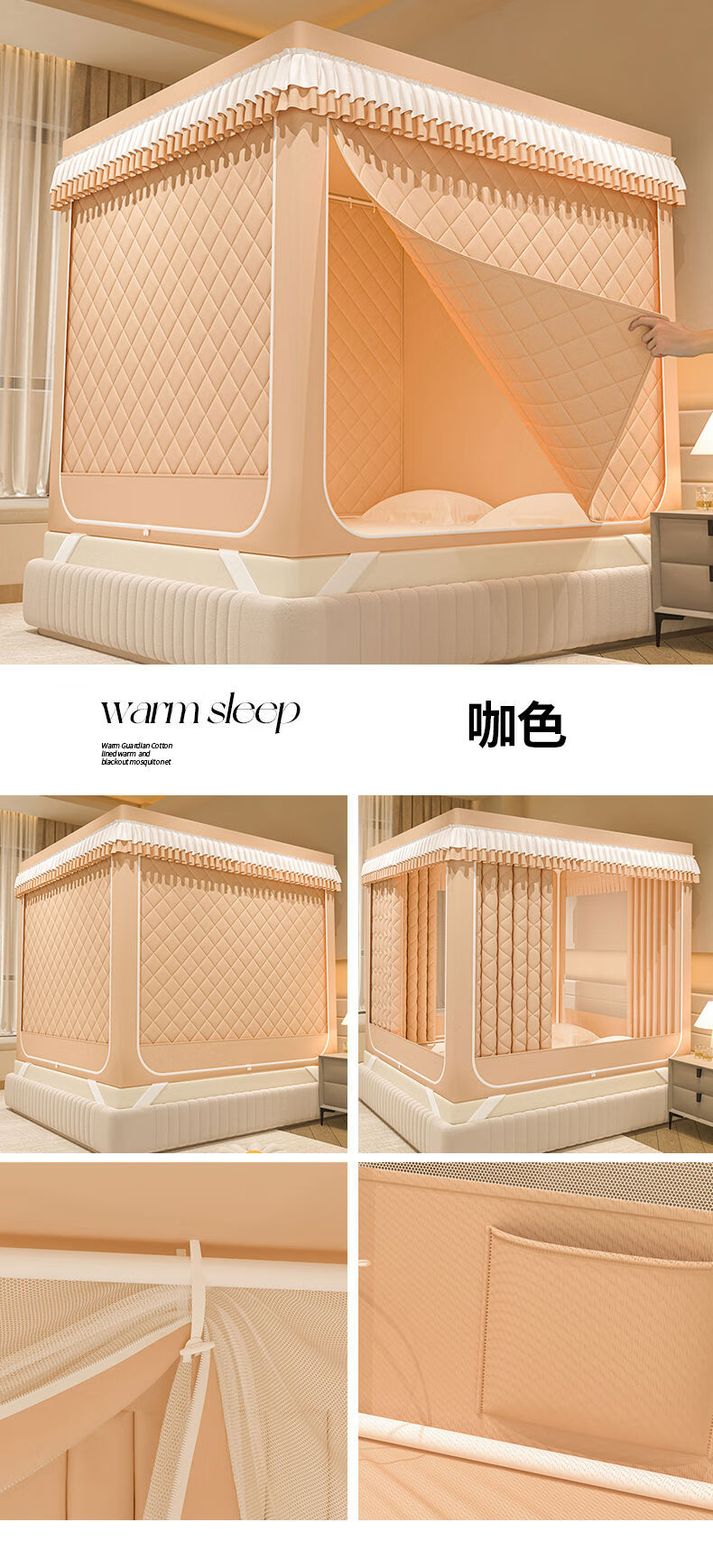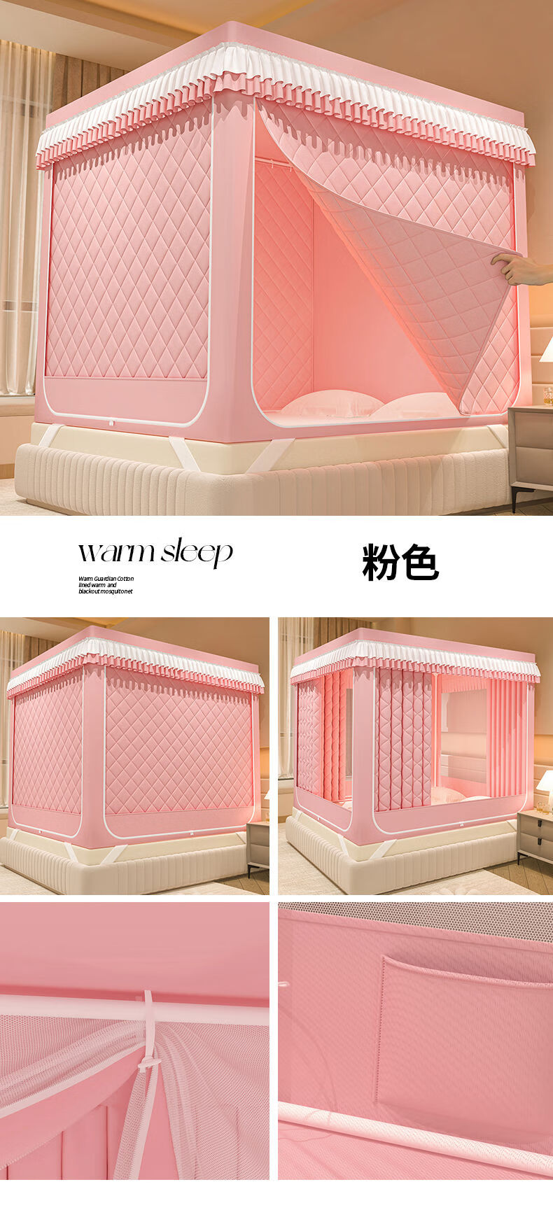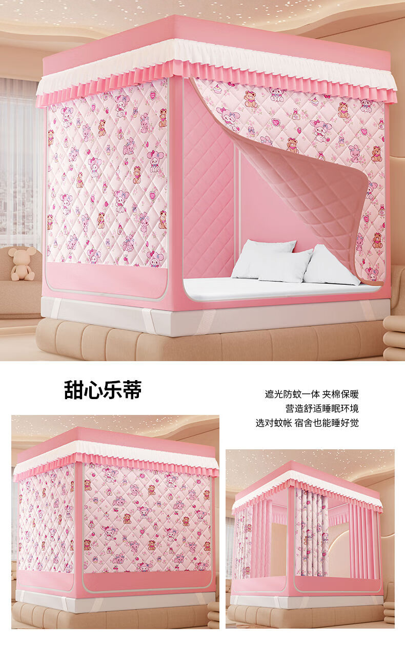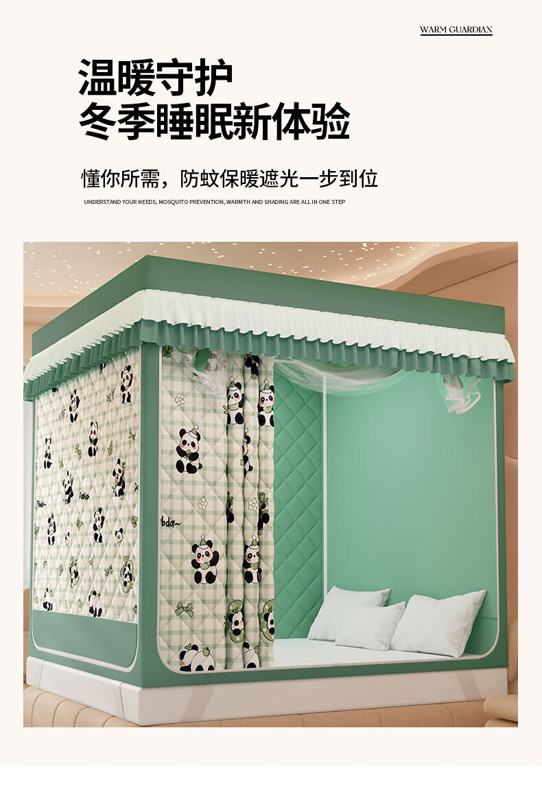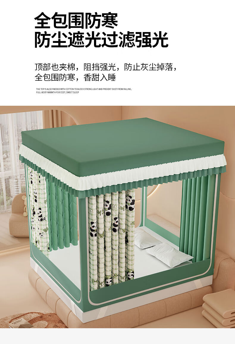 Yusenyi autumn and winter warm and cold-proof mosquito net, quilted home baby anti-fall bed tent with zipper and thickened bracket new style quilted lucky dog A-type encrypted tent + three-sided quilted blackout curtain + windproof and warm + back-end suitable for bed-width 1*length 190cm