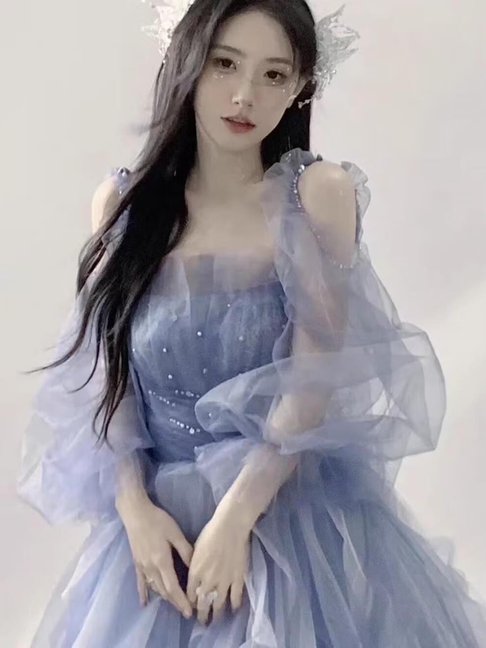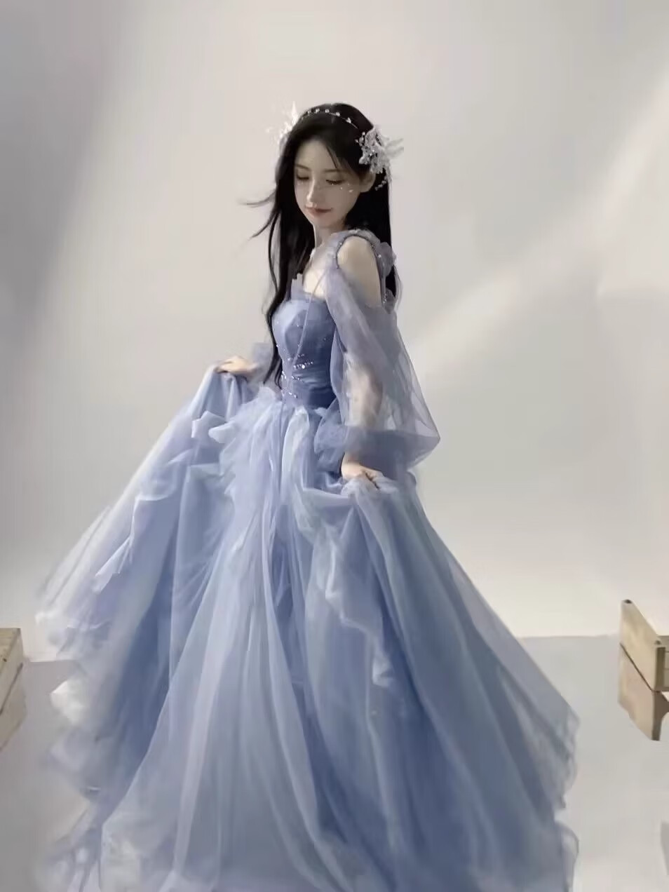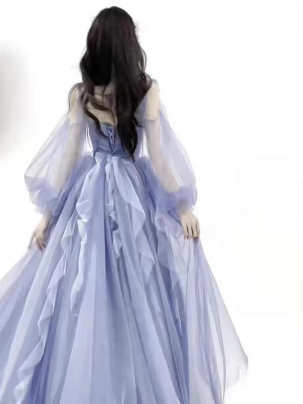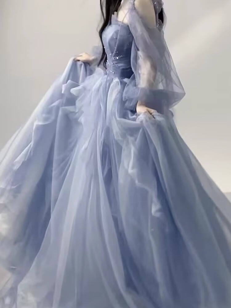 Rich-collared high-end French evening dress female performance costume vocal music and art examination long skirt princess style skirt student birthday host student blue M