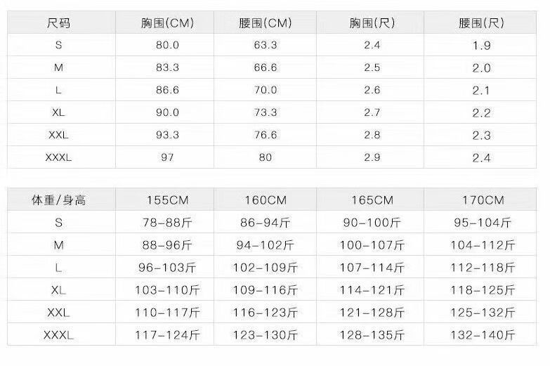 China (cm) 160-165/84-86 165-170 / 88-90 167-172 / 92-96 168-173 / 98-102 170-176 / 106-110