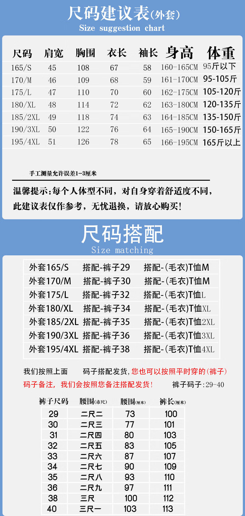 China (cm) 165 / 88-90 170 / 96-98 175 / 108-110 180 / 118-122 185 / 126-130