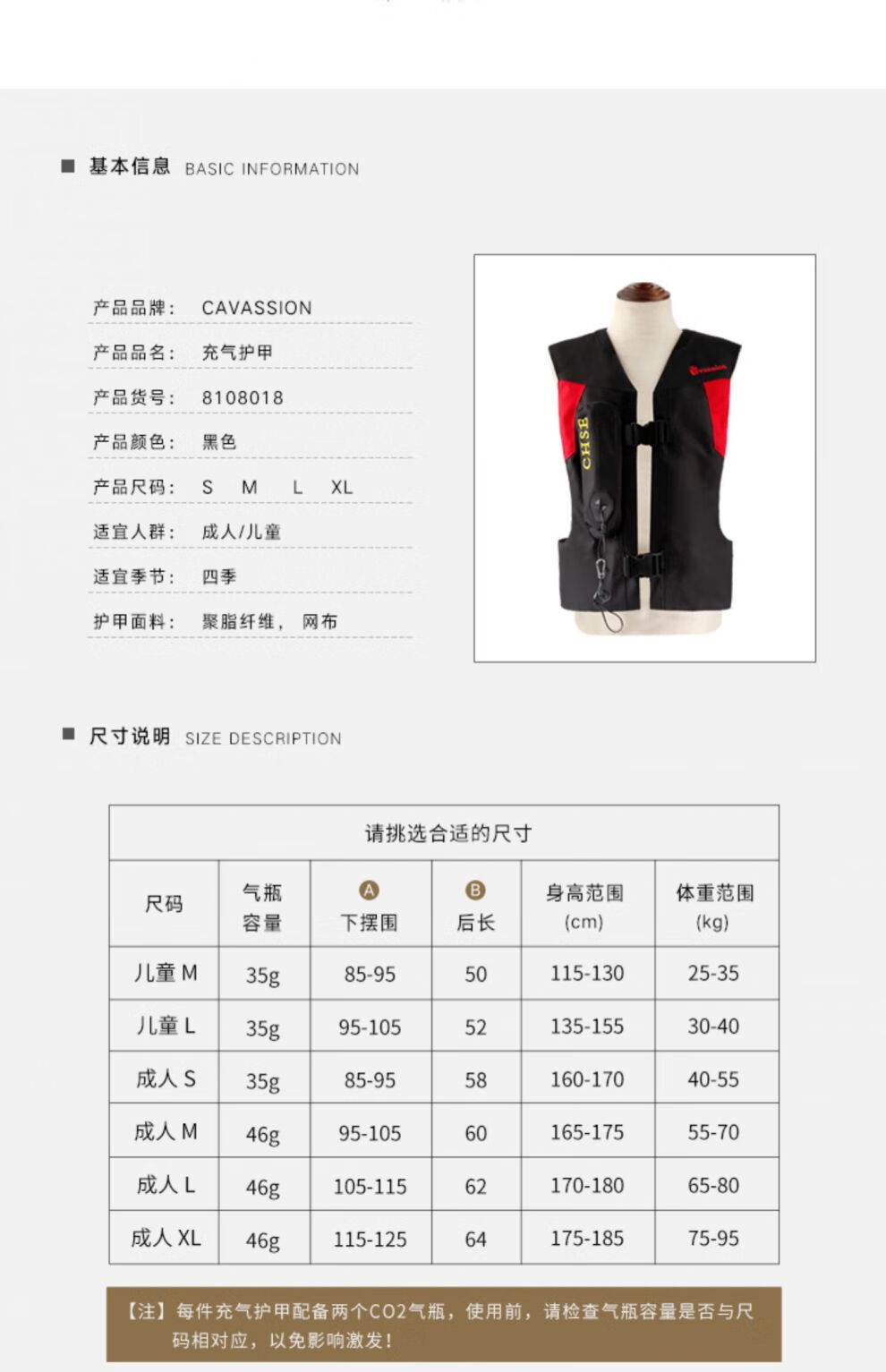 Cavassion equestrian inflatable armor inflatable vest equestrian rider obstacle course safety protective gear riding equipment children's M