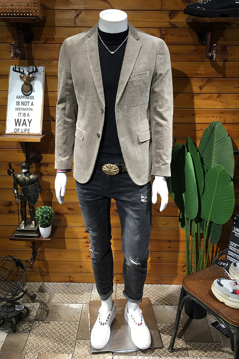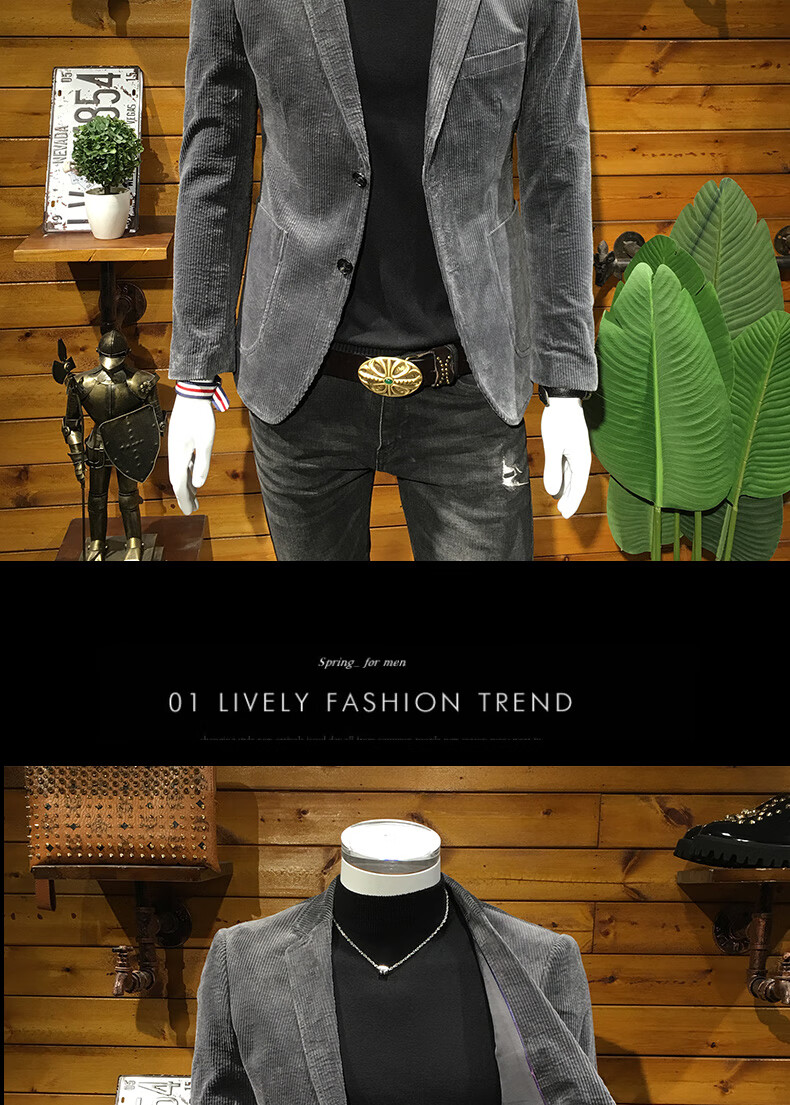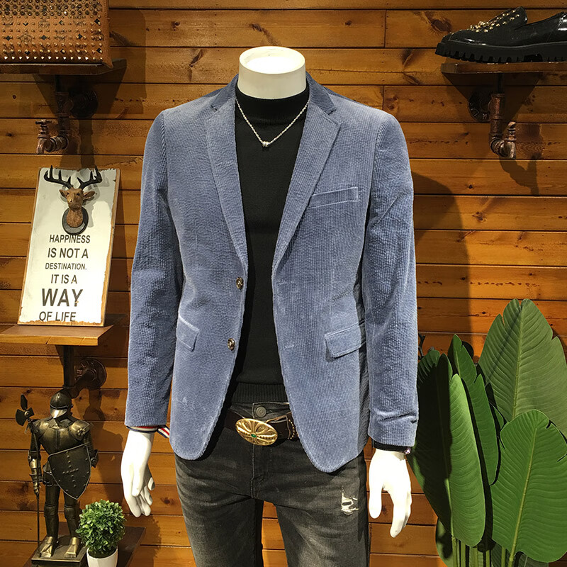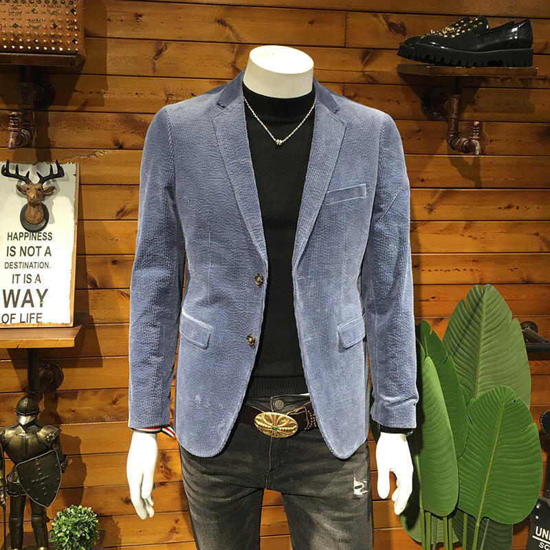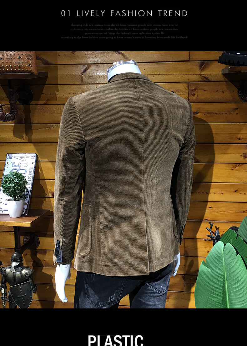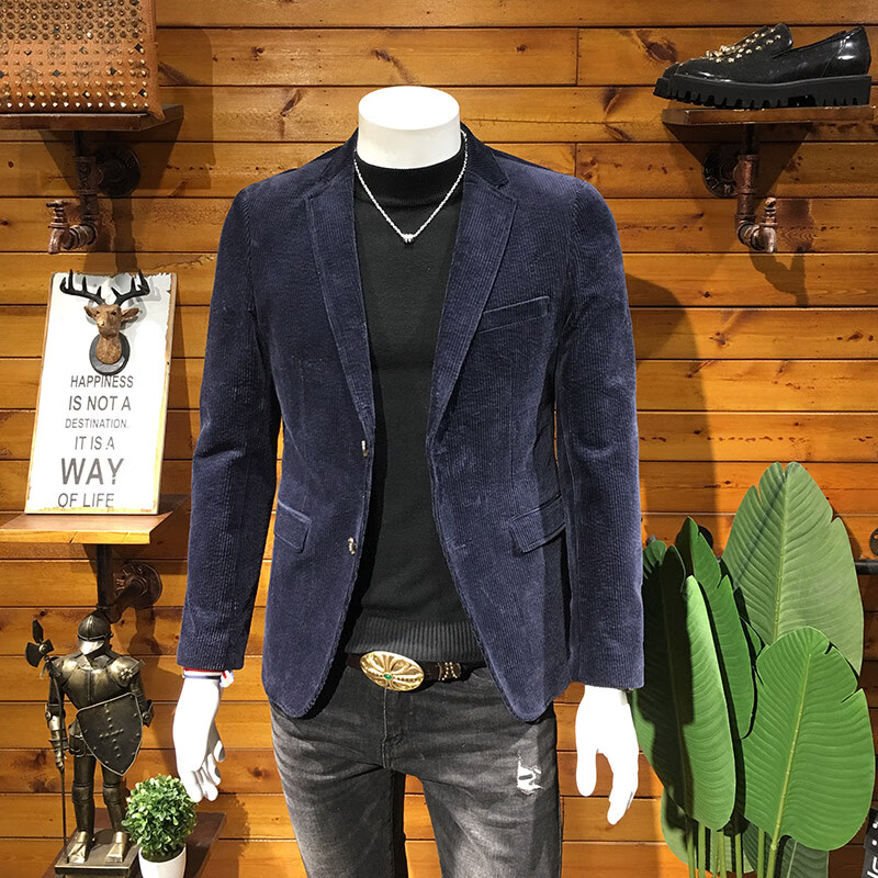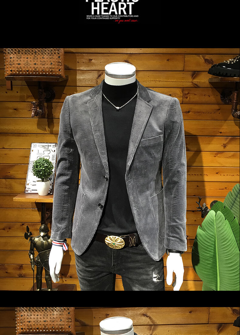 Rowswell2025 new spring and autumn corduroy suit for young men Korean version slim retro business casual small suit jacket black XL