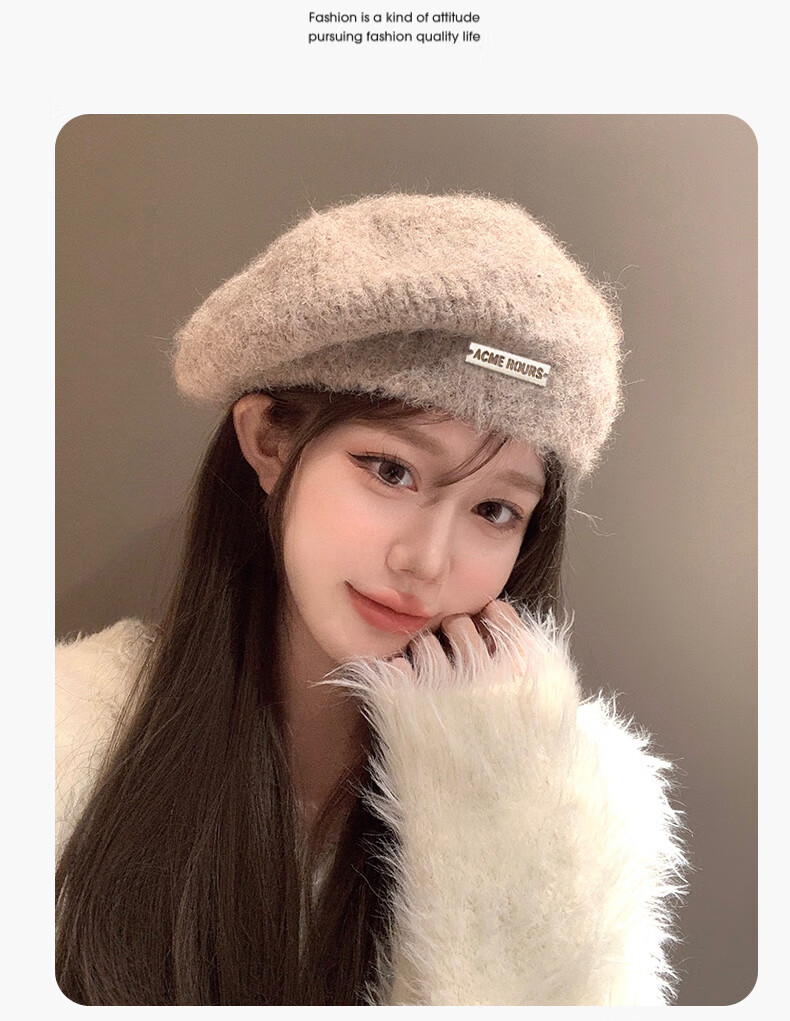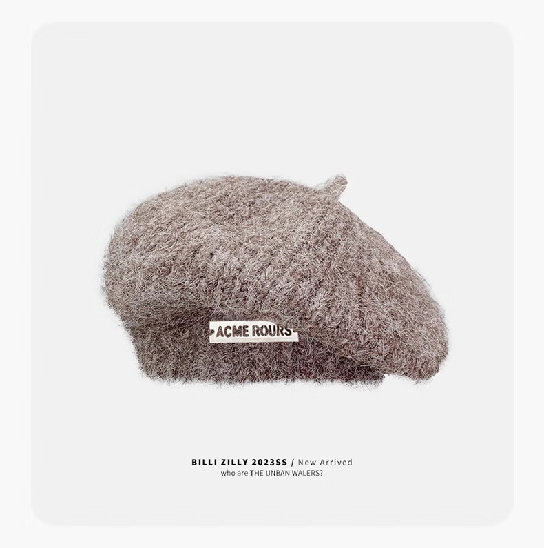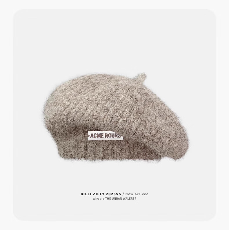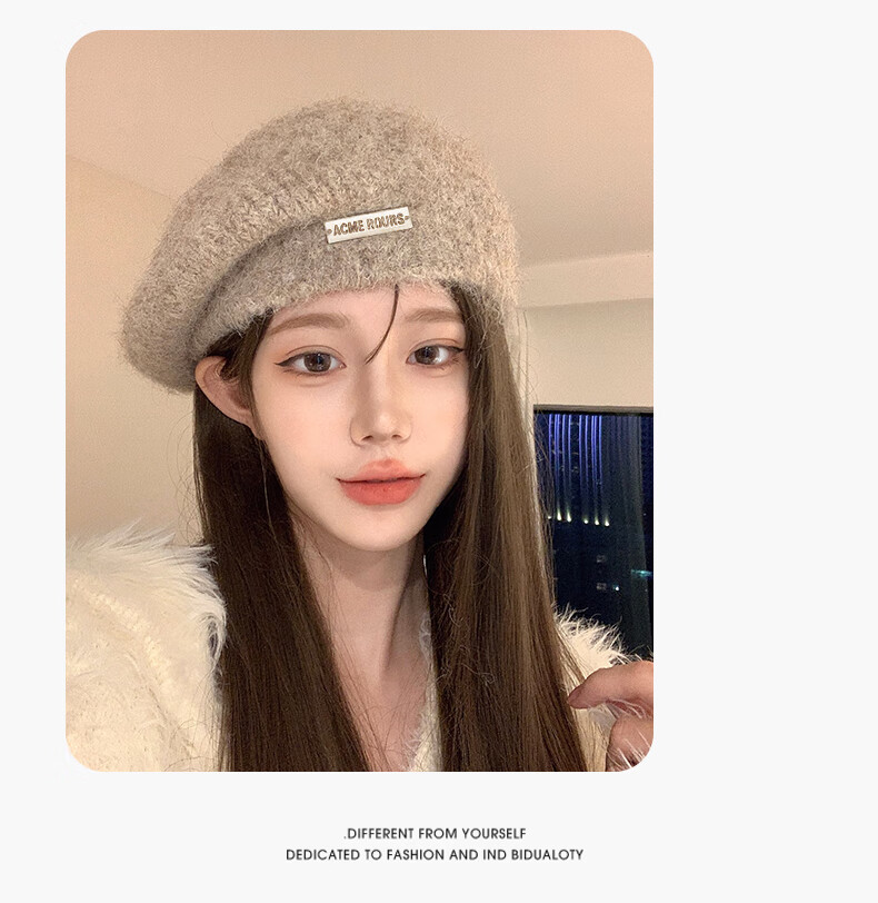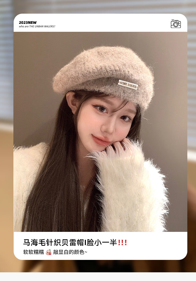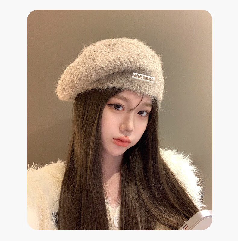 Вязаный берет с железной этикеткой из мохера, женская осенне-зимняя теплая плюшевая шапка художника, открывающая лицо, маленькая шерстяная шапка цвета хаки, M, один размер (5559c)