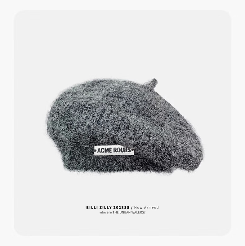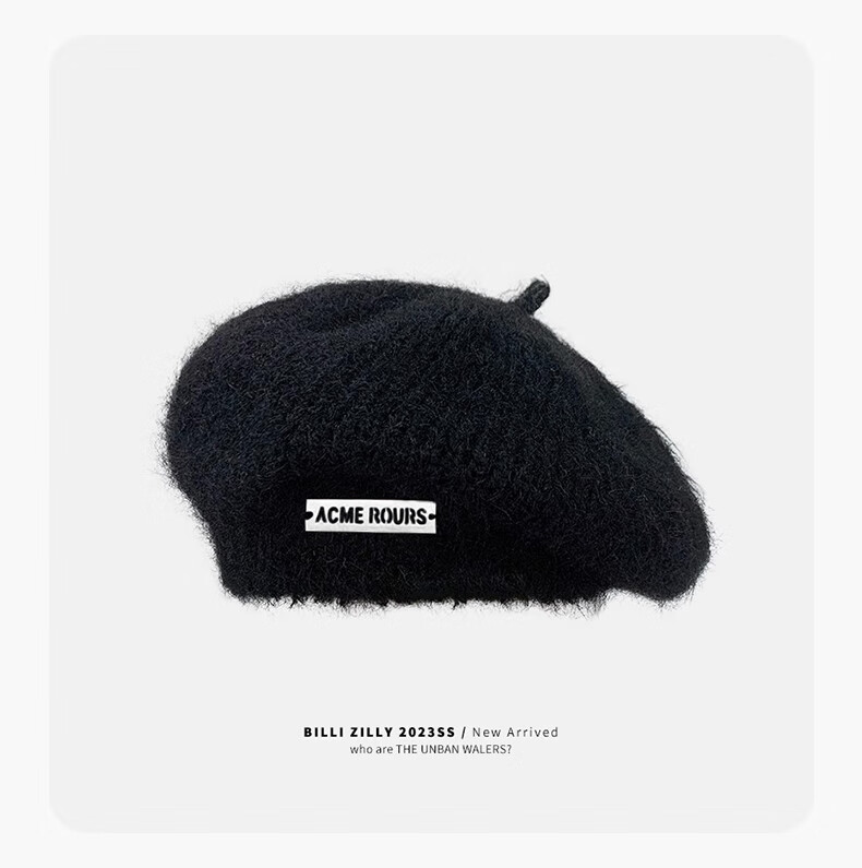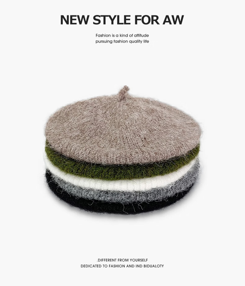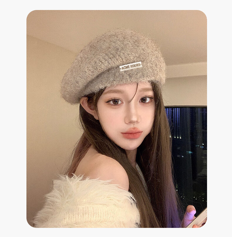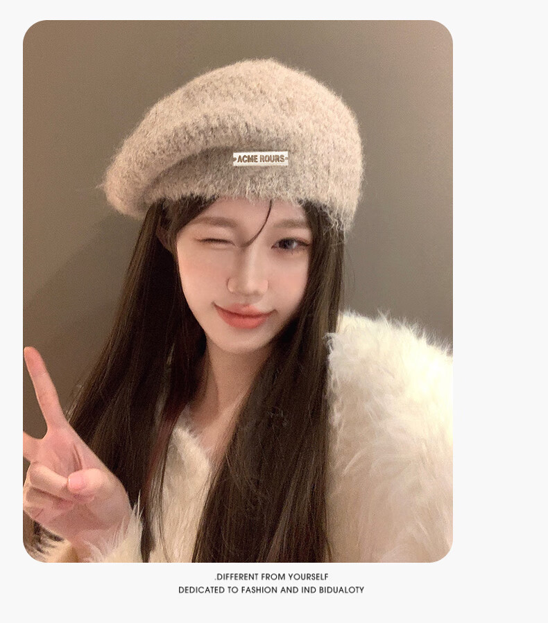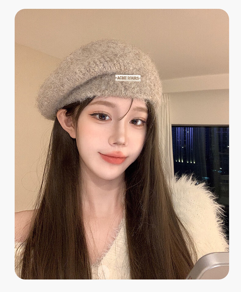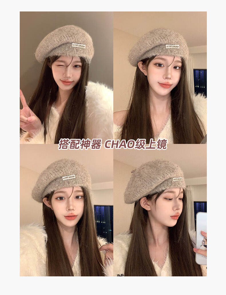 Вязаный берет с железной этикеткой из мохера, женская осенне-зимняя теплая плюшевая шапка художника, открывающая лицо, маленькая шерстяная шапка цвета хаки, M, один размер (5559c)