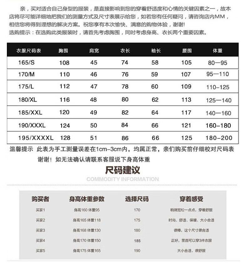 China (cm) 165 / 88-90 170 / 96-98 175 / 108-110 180 / 118-122 185 / 126-130