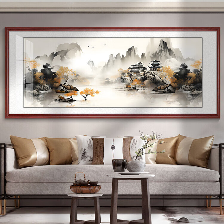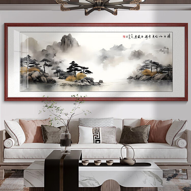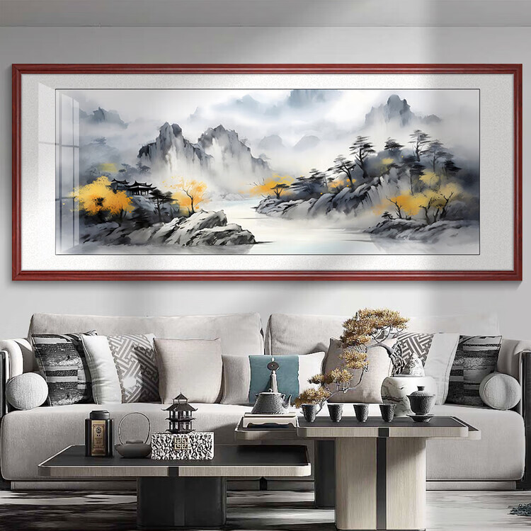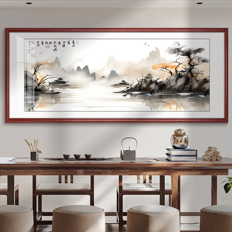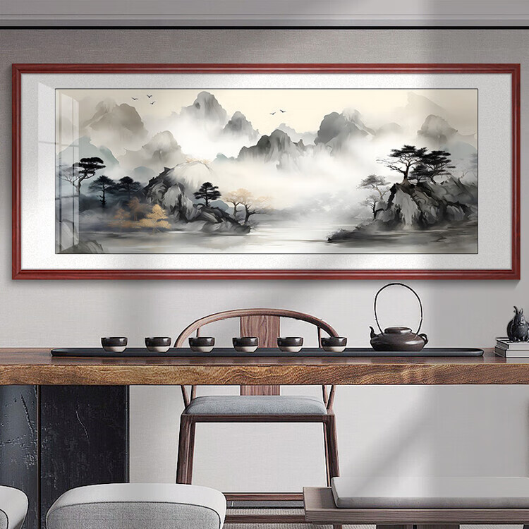 Tranquility Zhiyuan tea room hanging painting landscape painting living room sofa background wall decoration painting office calligraphy and painting study room mural KB106 ink landscape 153X63CM high-end (dark walnut color) solid wood frame texture canvas surface