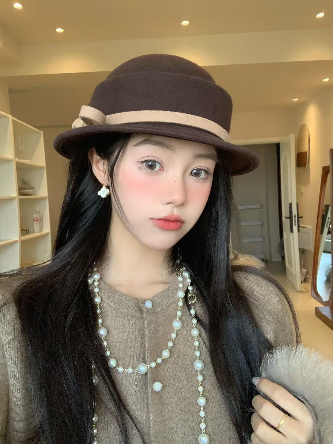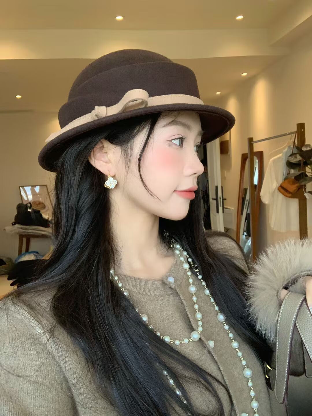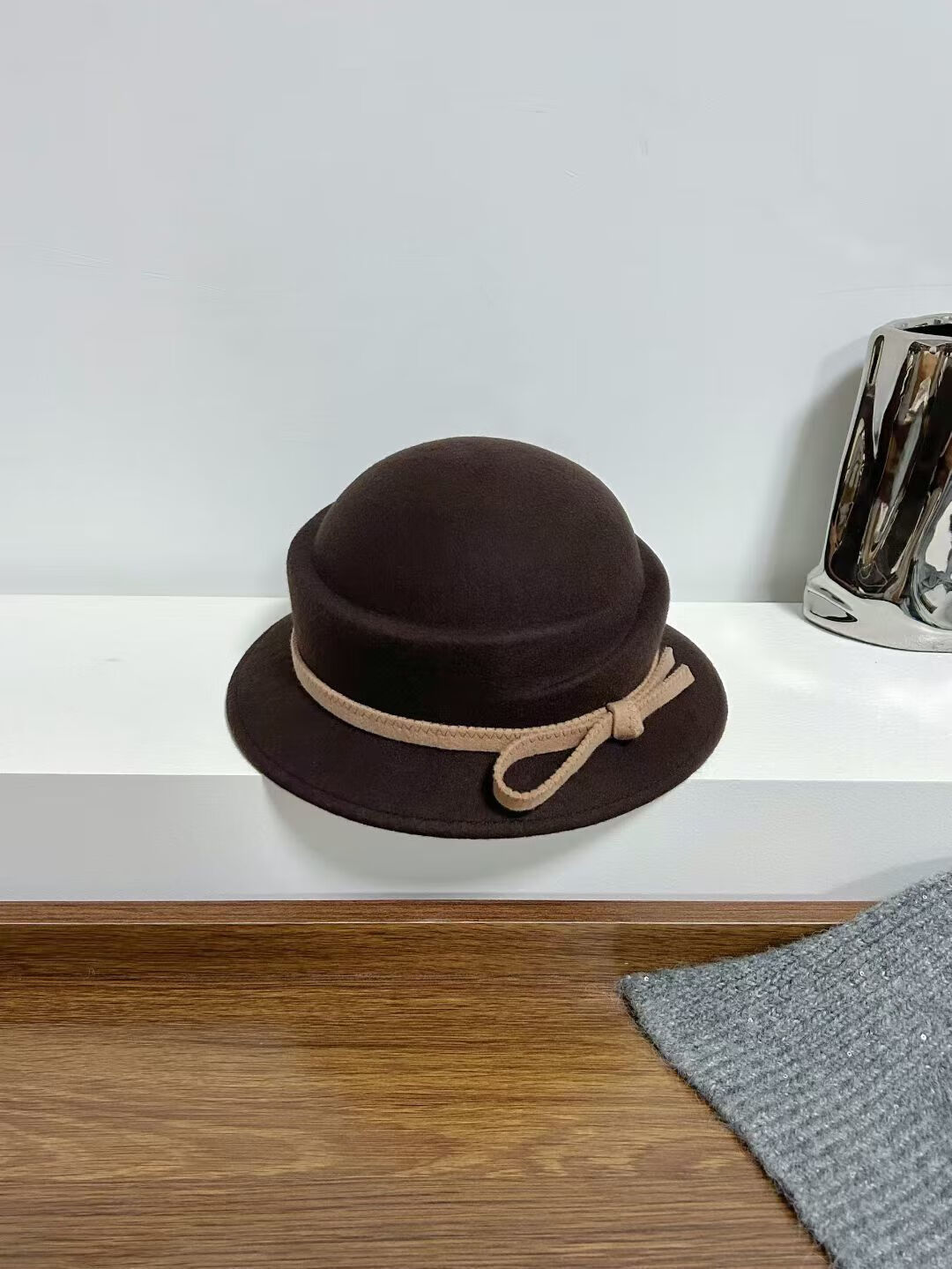 Zhi Yunyan Hepburn style woolen beret women's autumn and winter French retro basin hat wool top hat elegant temperament bow decoration coffee color M 56-58cm