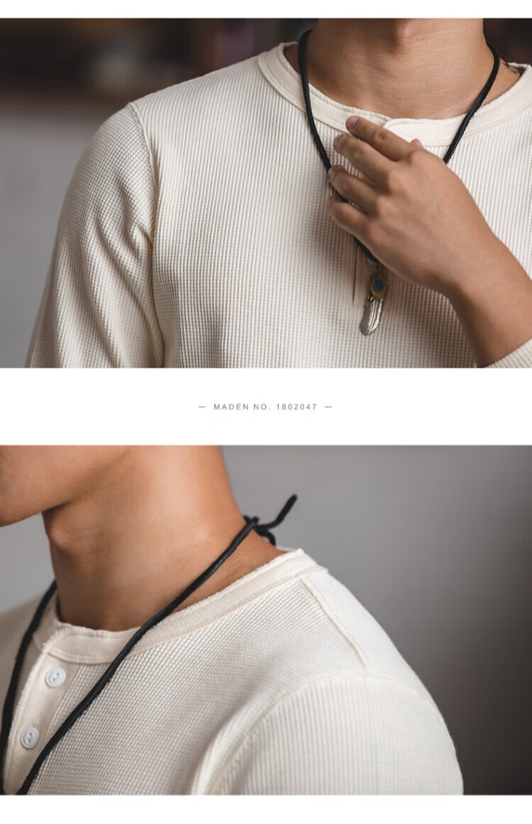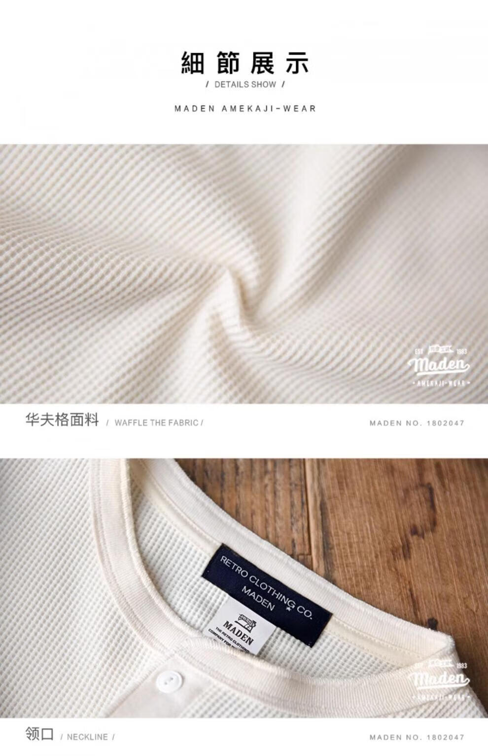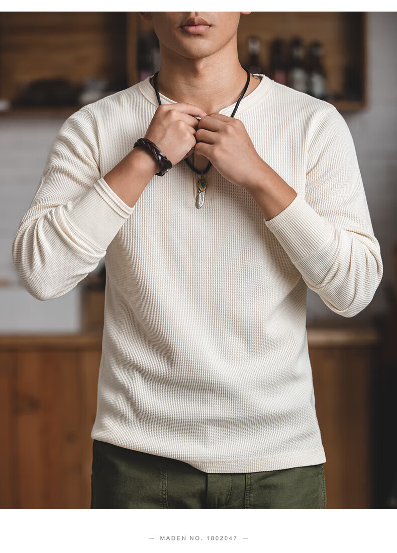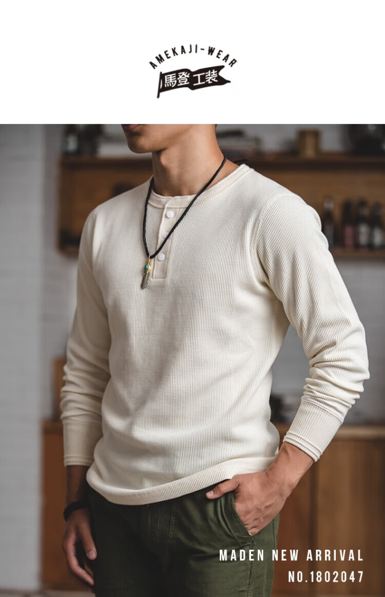 Maden workwear American retro heavyweight waffle henley shirt Ami khaki inner bottoming long-sleeved T-shirt men's spring off-white S