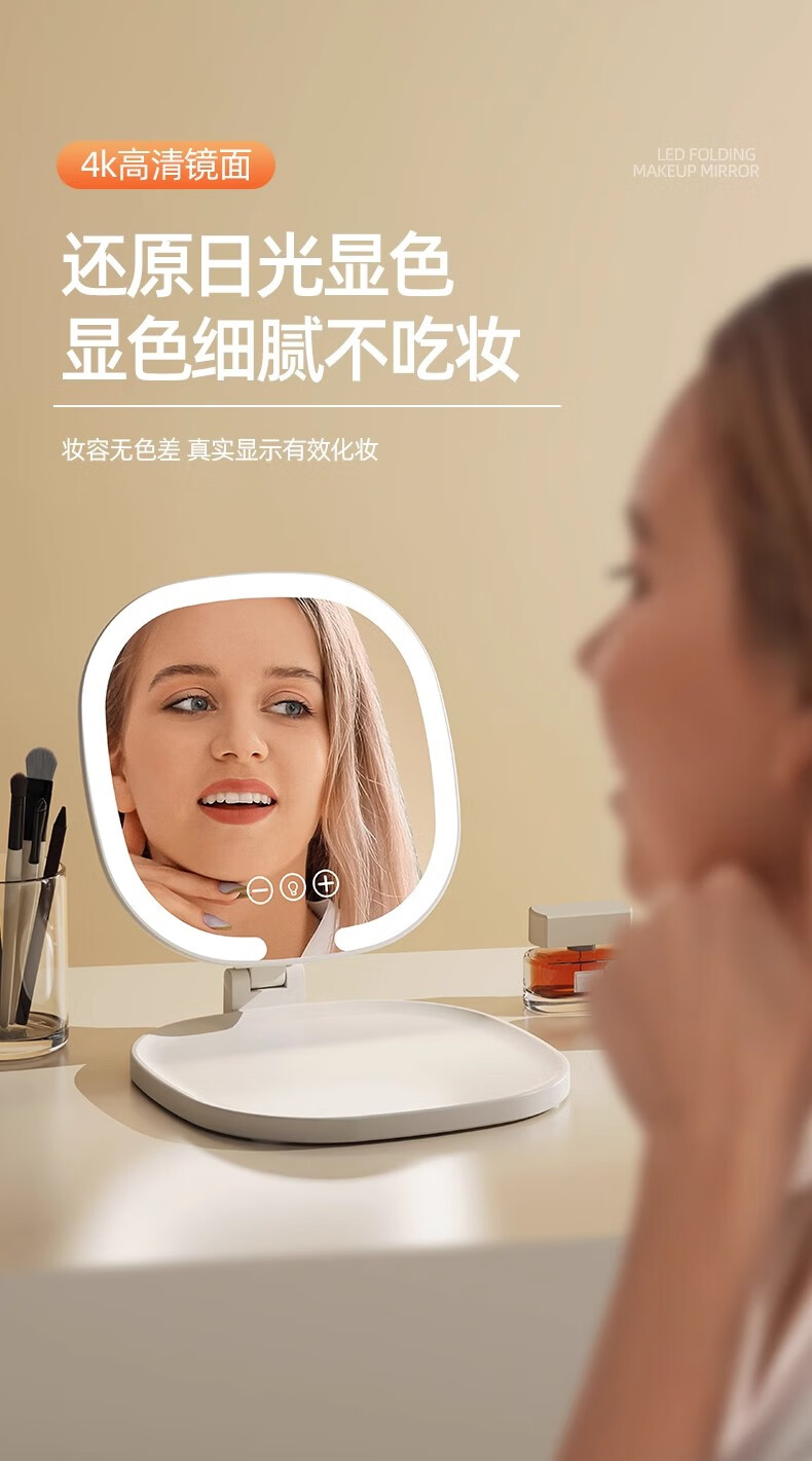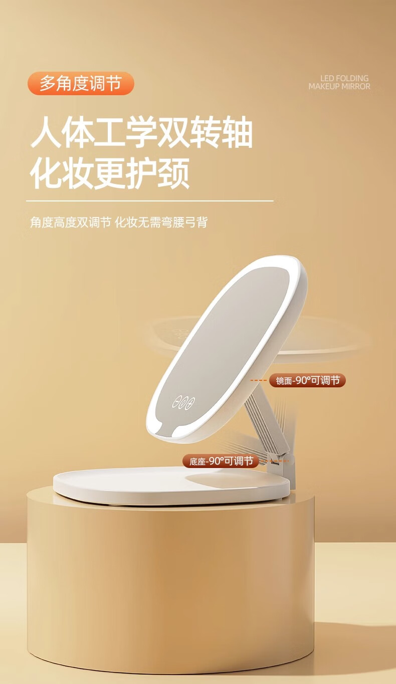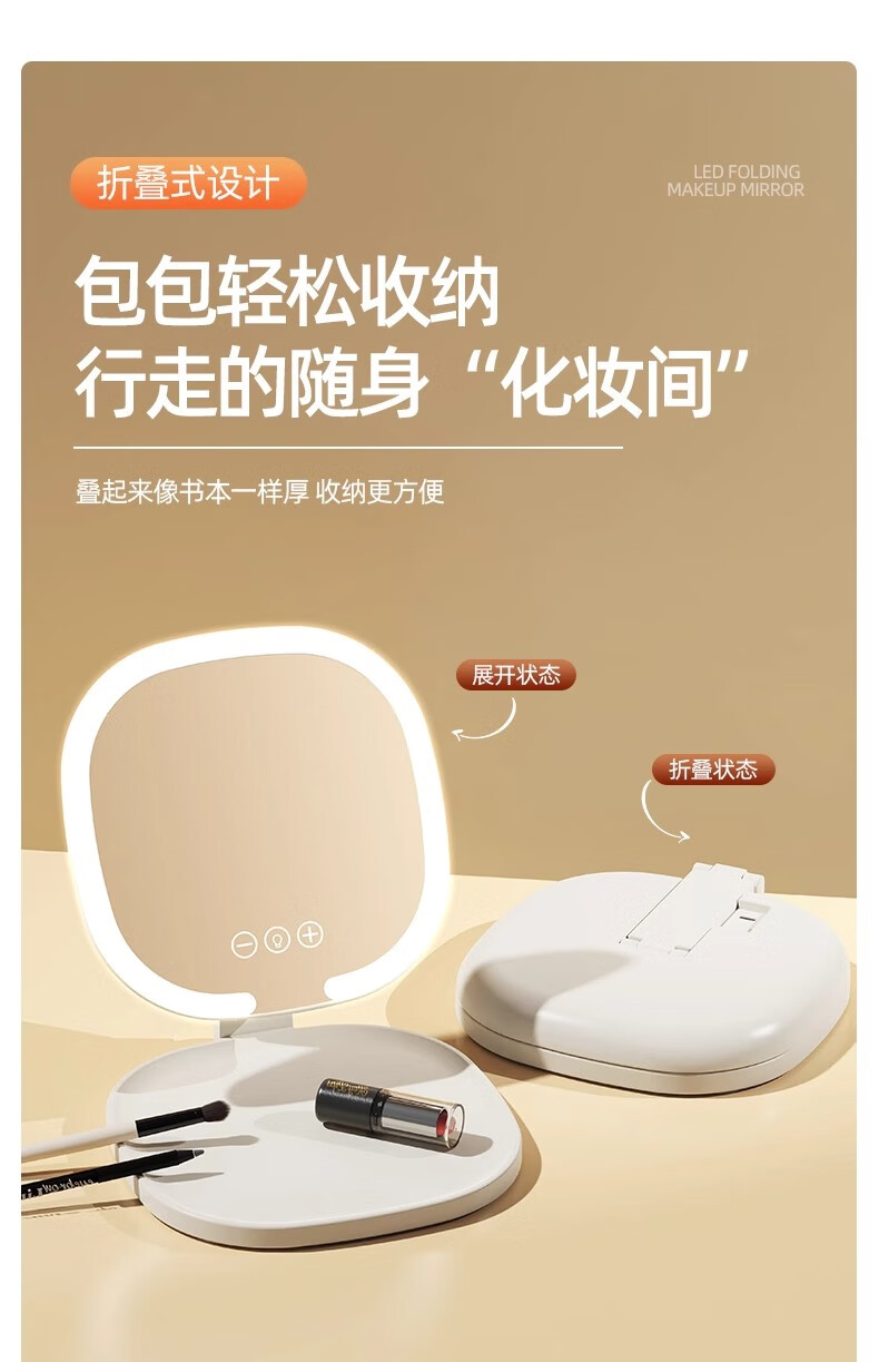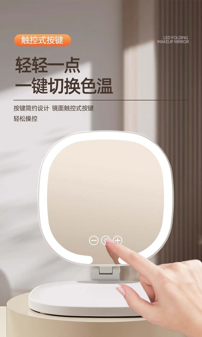 New LED foldable makeup mirror with light, intelligent adjustment, charging Internet celebrity fill-in light mirror, dormitory portable beauty mirror, pearl white, stepless dimming/three-button smart touch screen, free charging cable