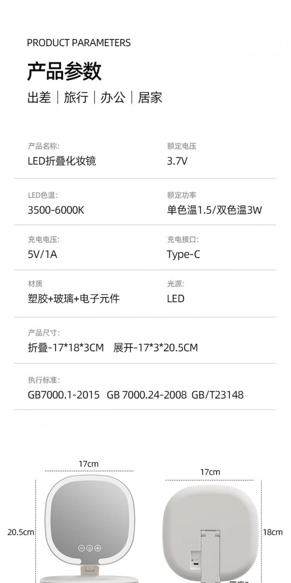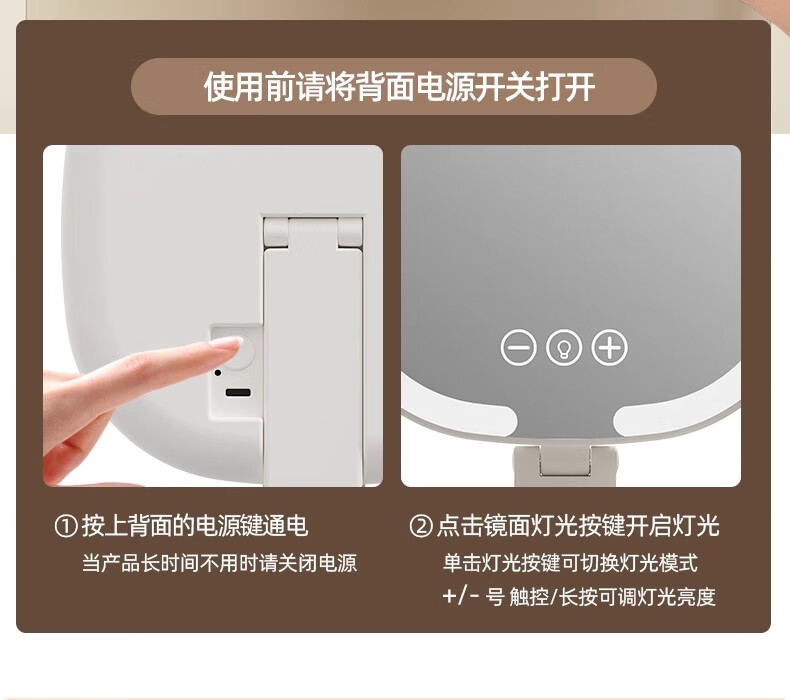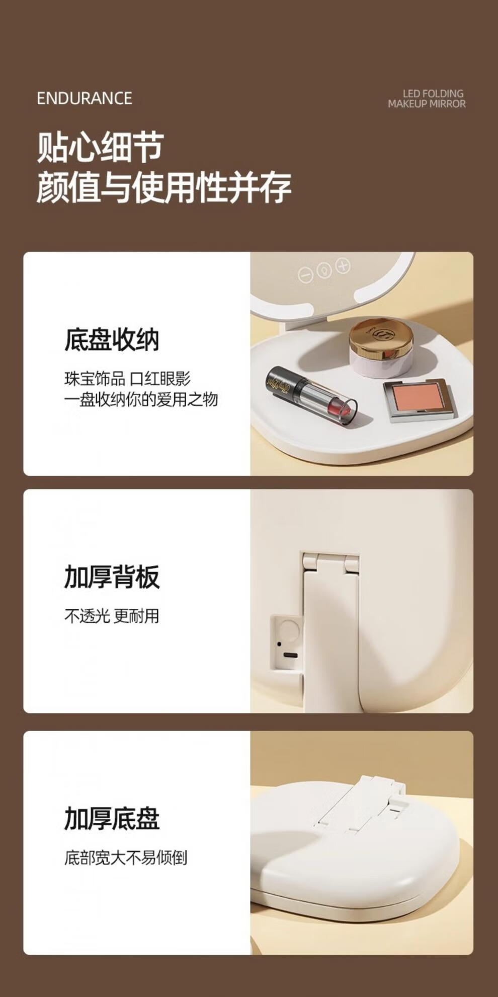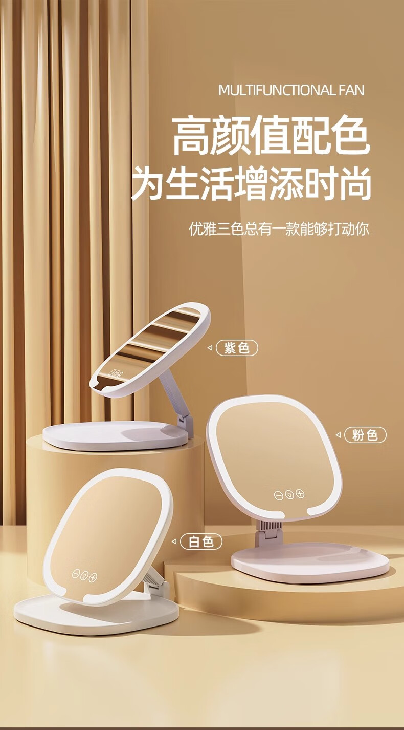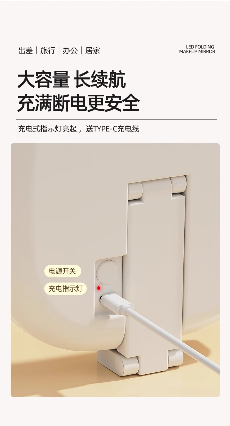 New LED foldable makeup mirror with light, intelligent adjustment, charging Internet celebrity fill-in light mirror, dormitory portable beauty mirror, pearl white, stepless dimming/three-button smart touch screen, free charging cable