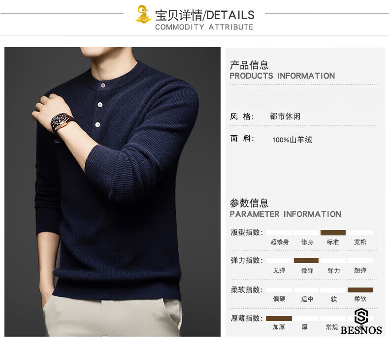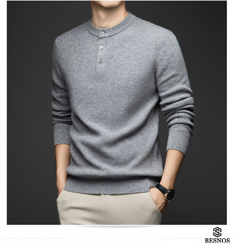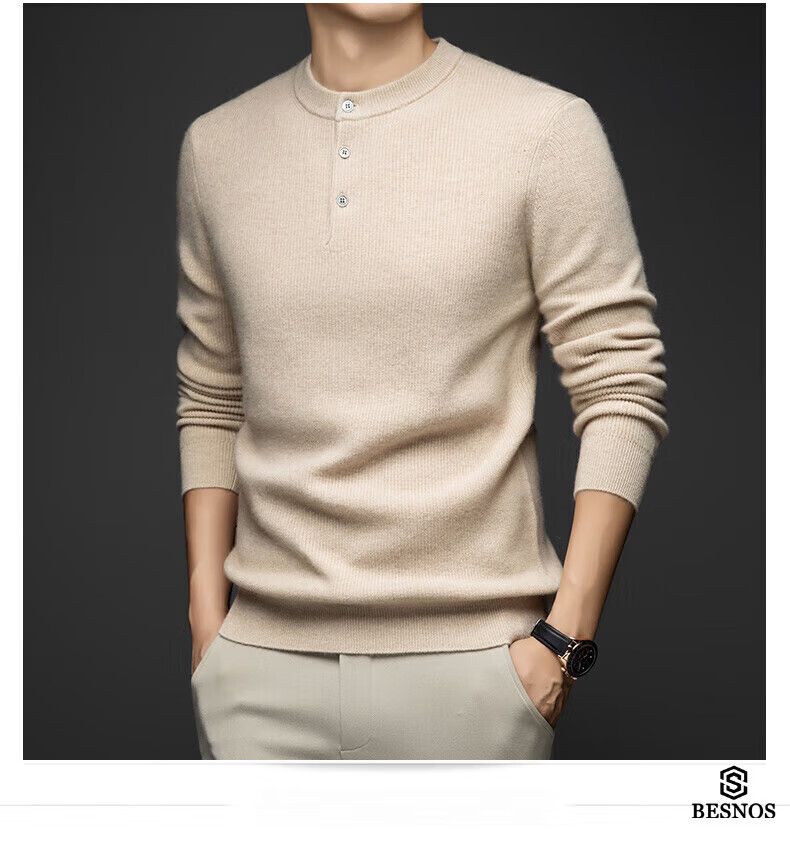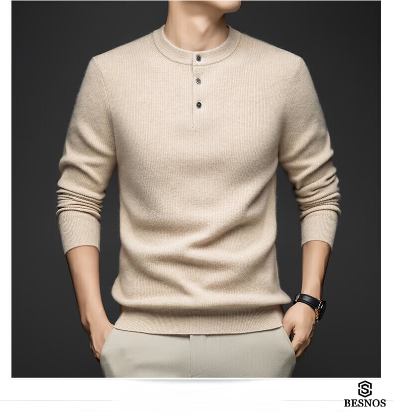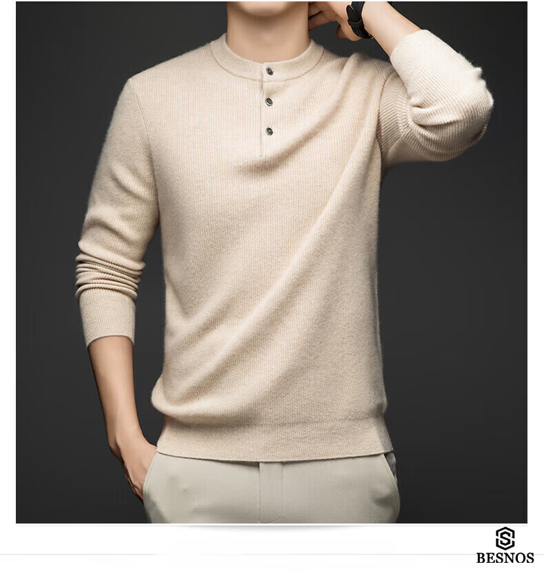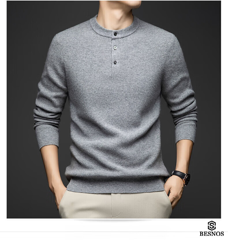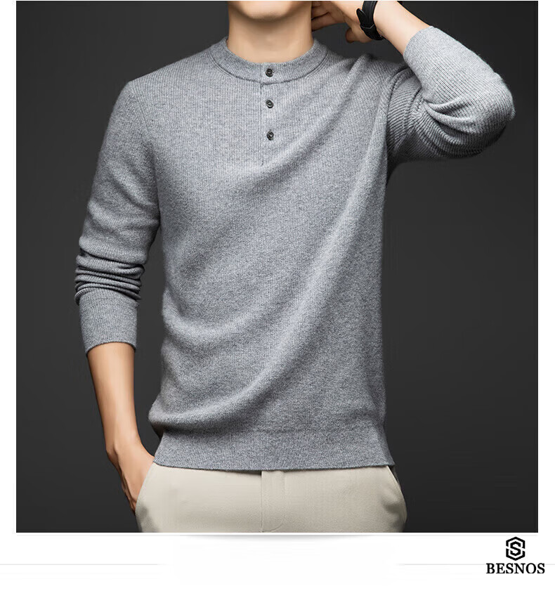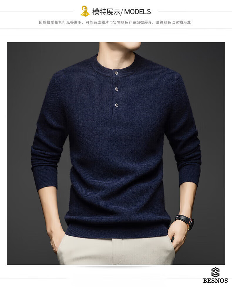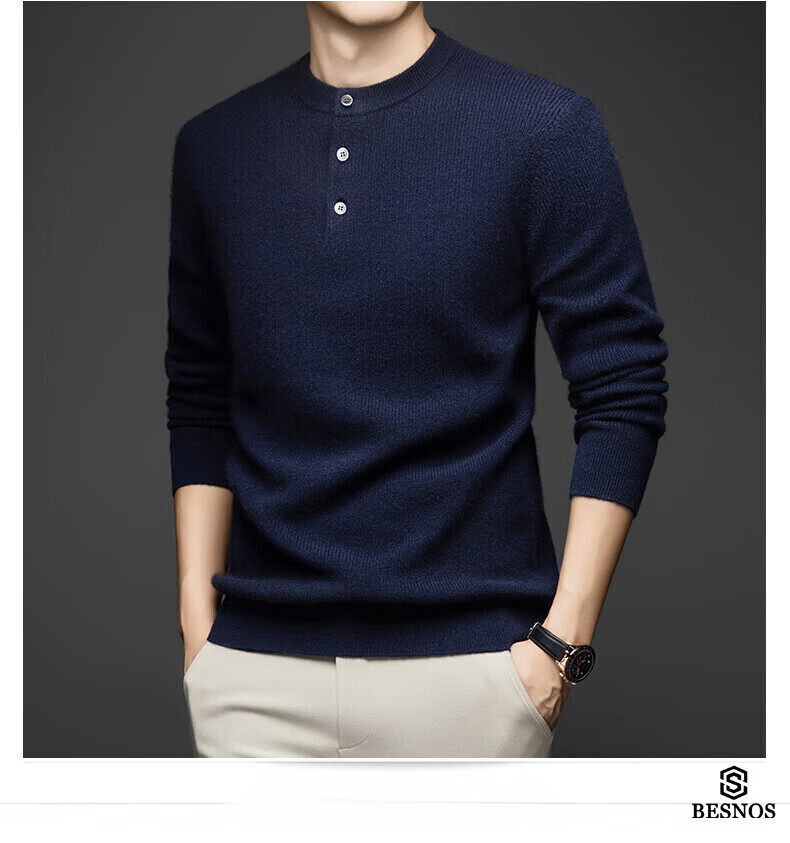 BESNOS Light Luxury Pure Cashmere Sweater Men's Thickened Winter Henley Neck Sweater Round Neck Casual Warm Knitted Bottoming Shirt Navy Blue XL (180)