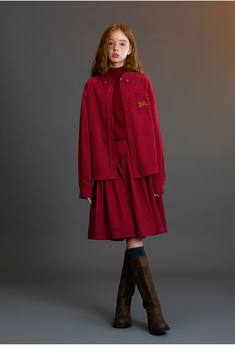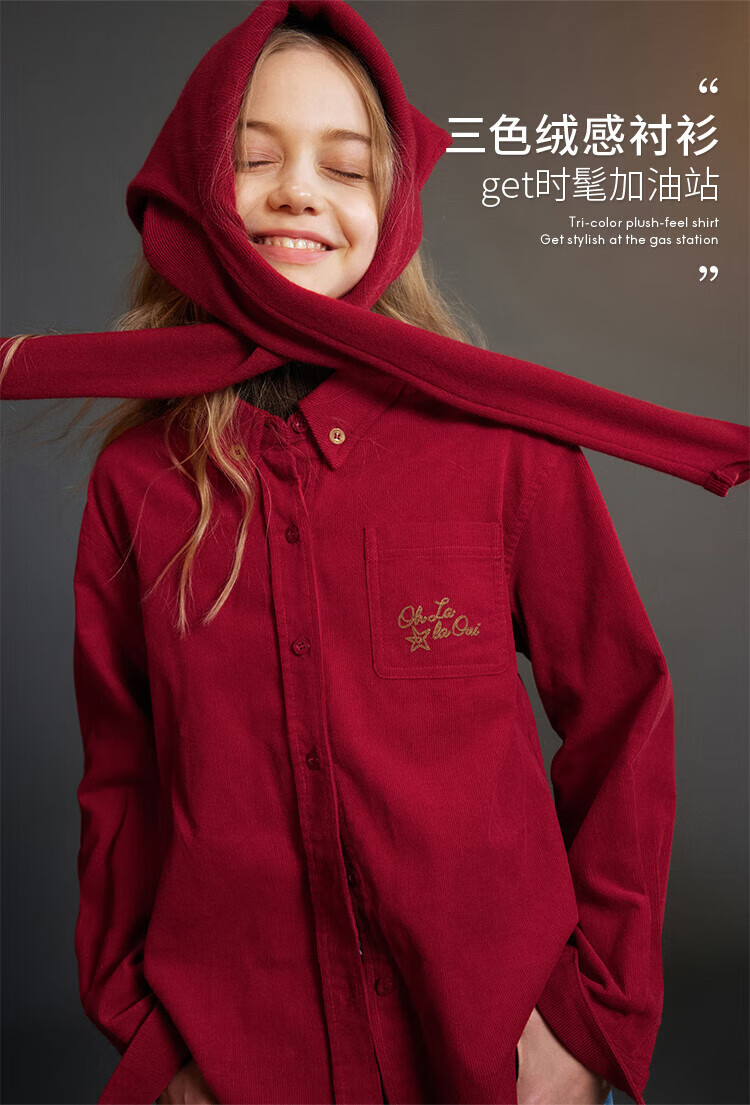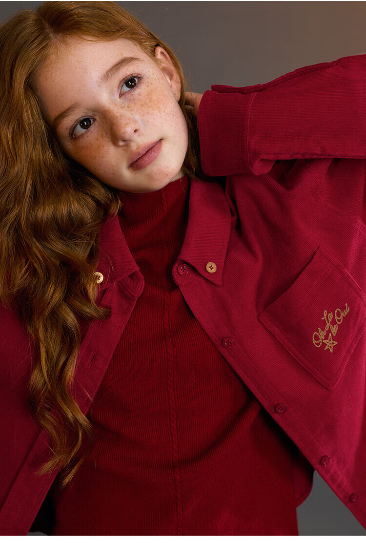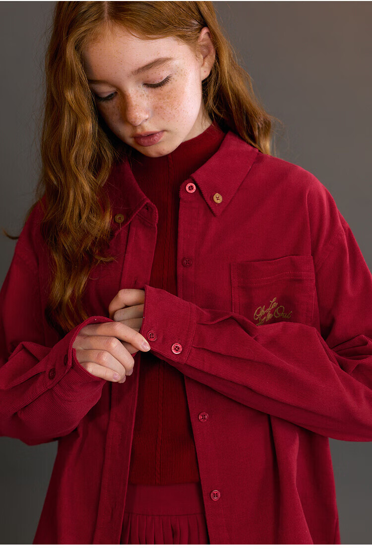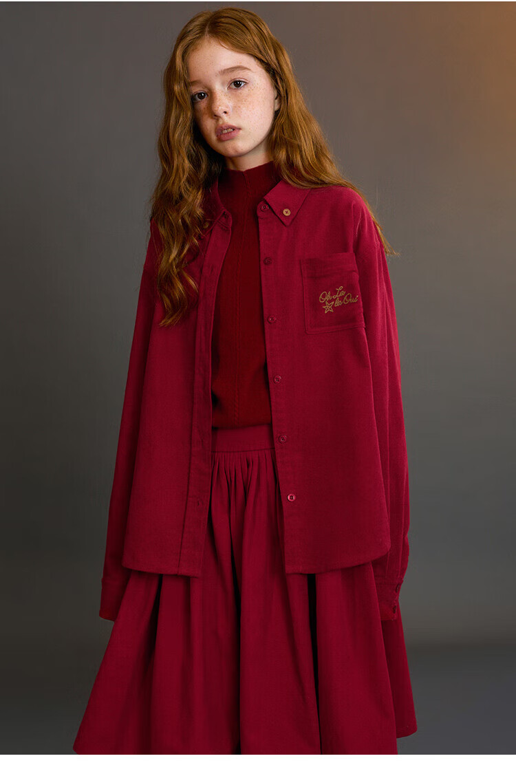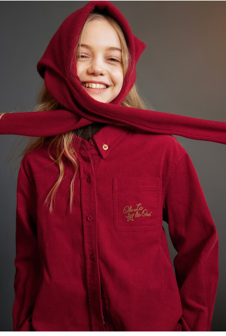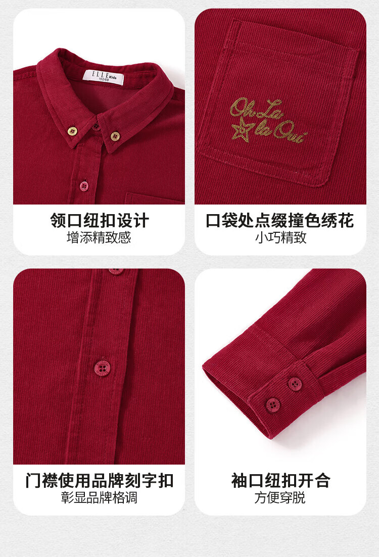 ELLE KIDS Children's Clothing Contrast Color Embroidered Long Sleeve Horse Year New Year Red Shirt Girls Autumn and Winter Corduroy Casual Versatile Top New Year Red 120 (110/120)