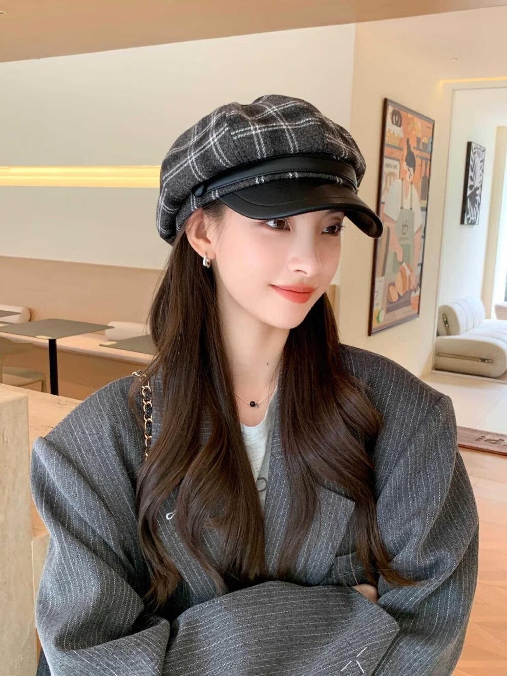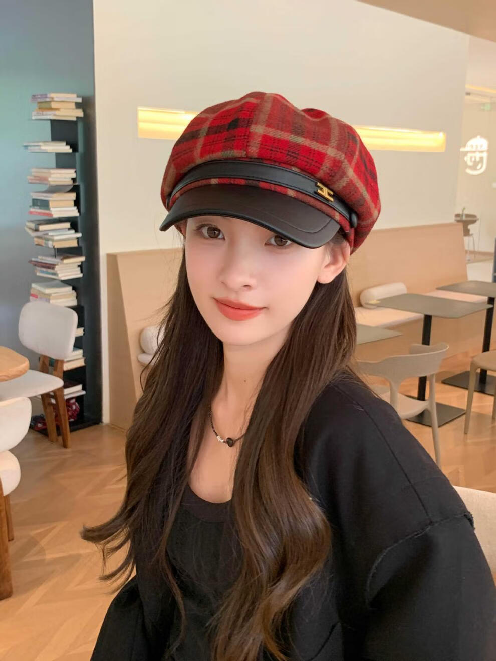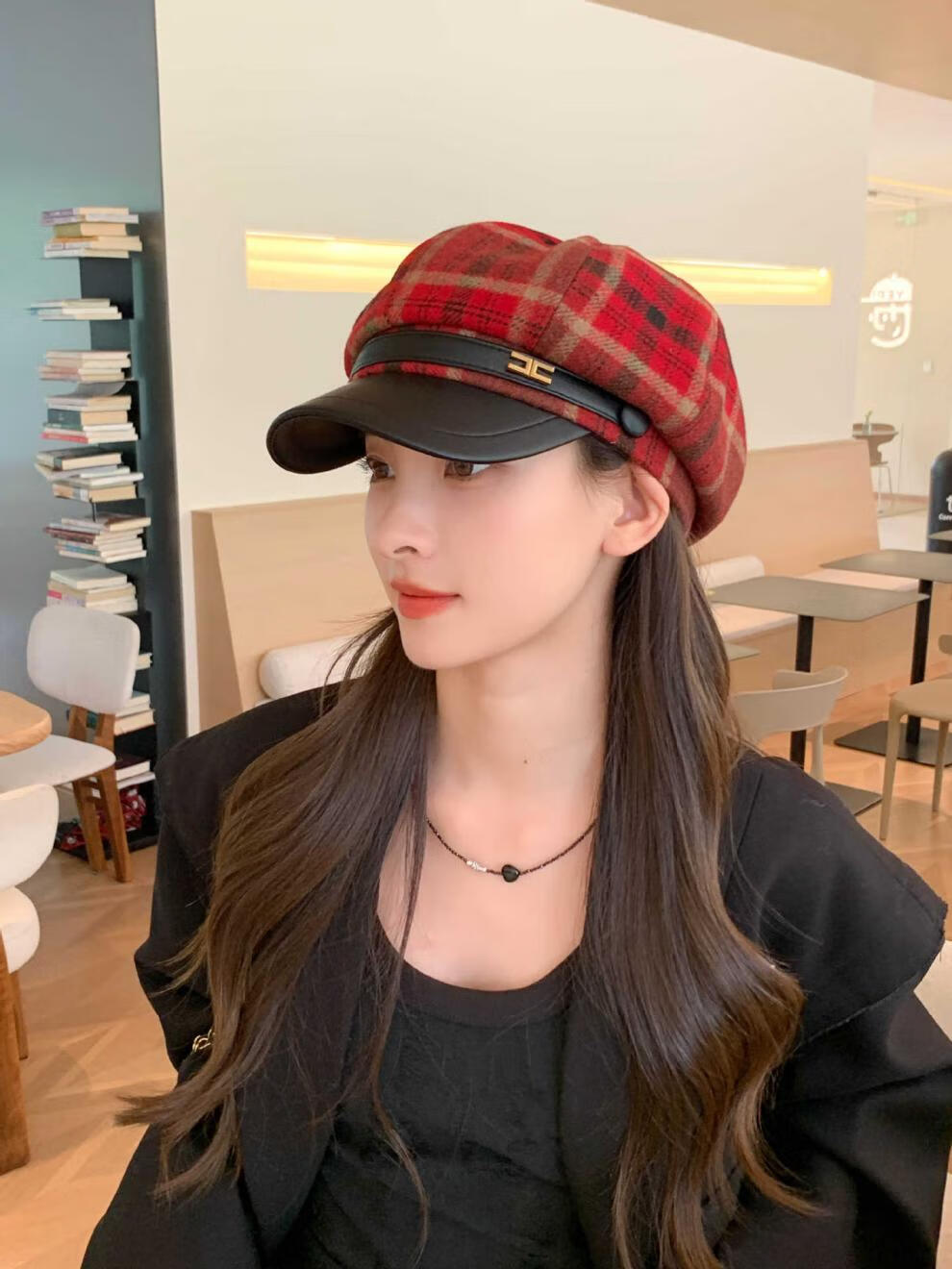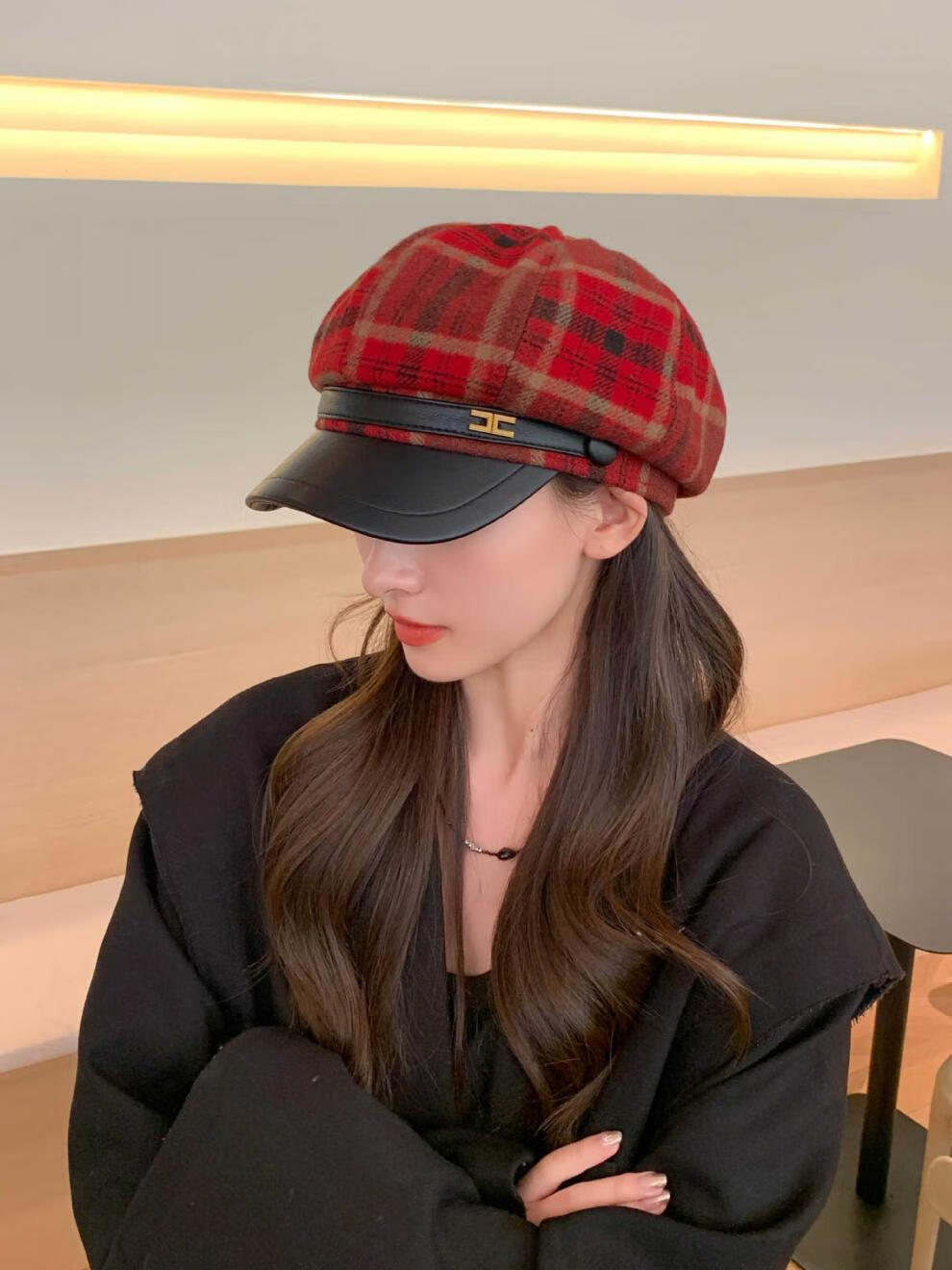 Korean retro leather belt plaid octagonal hat for women winter warm woolen beret for women with leather brim stitching newspaper hat red plaid