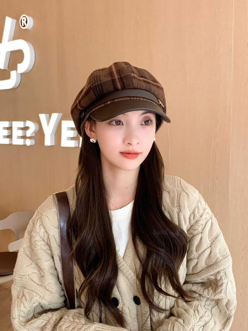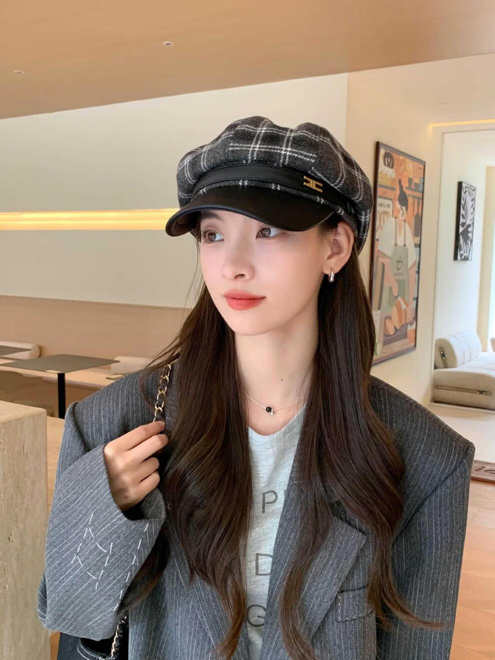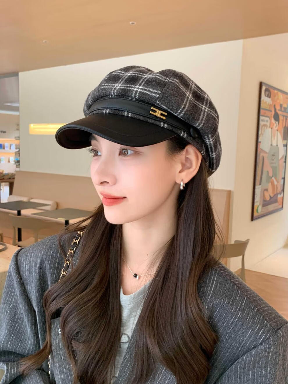 Korean retro leather belt plaid octagonal hat for women winter warm woolen beret for women with leather brim stitching newspaper hat red plaid