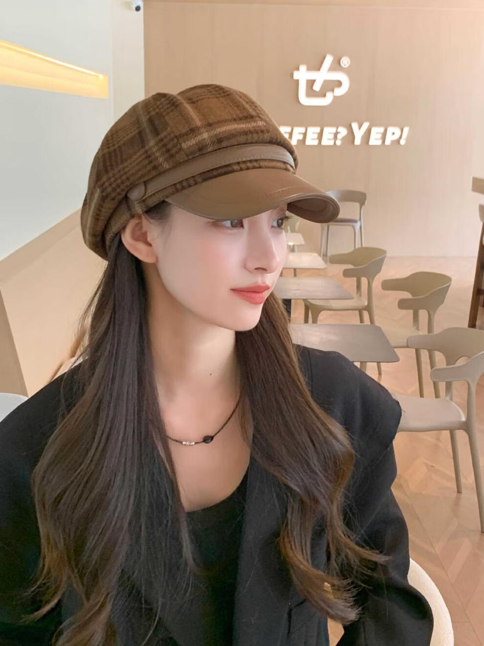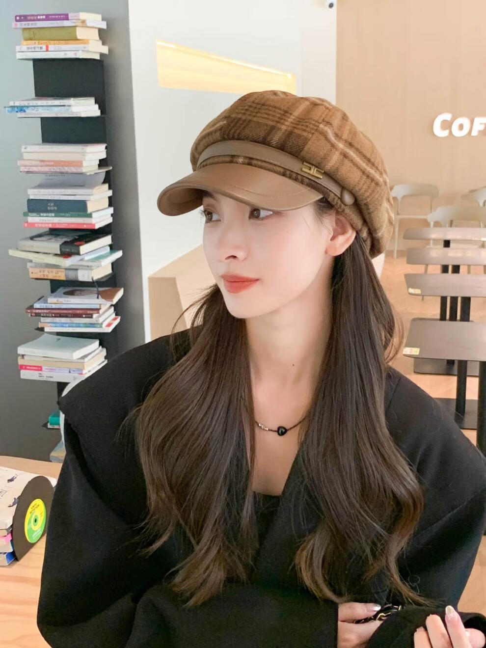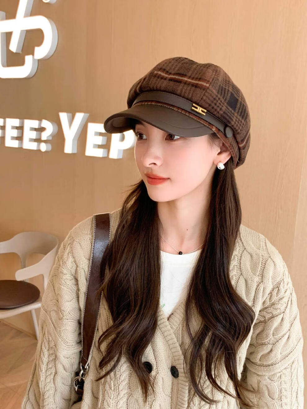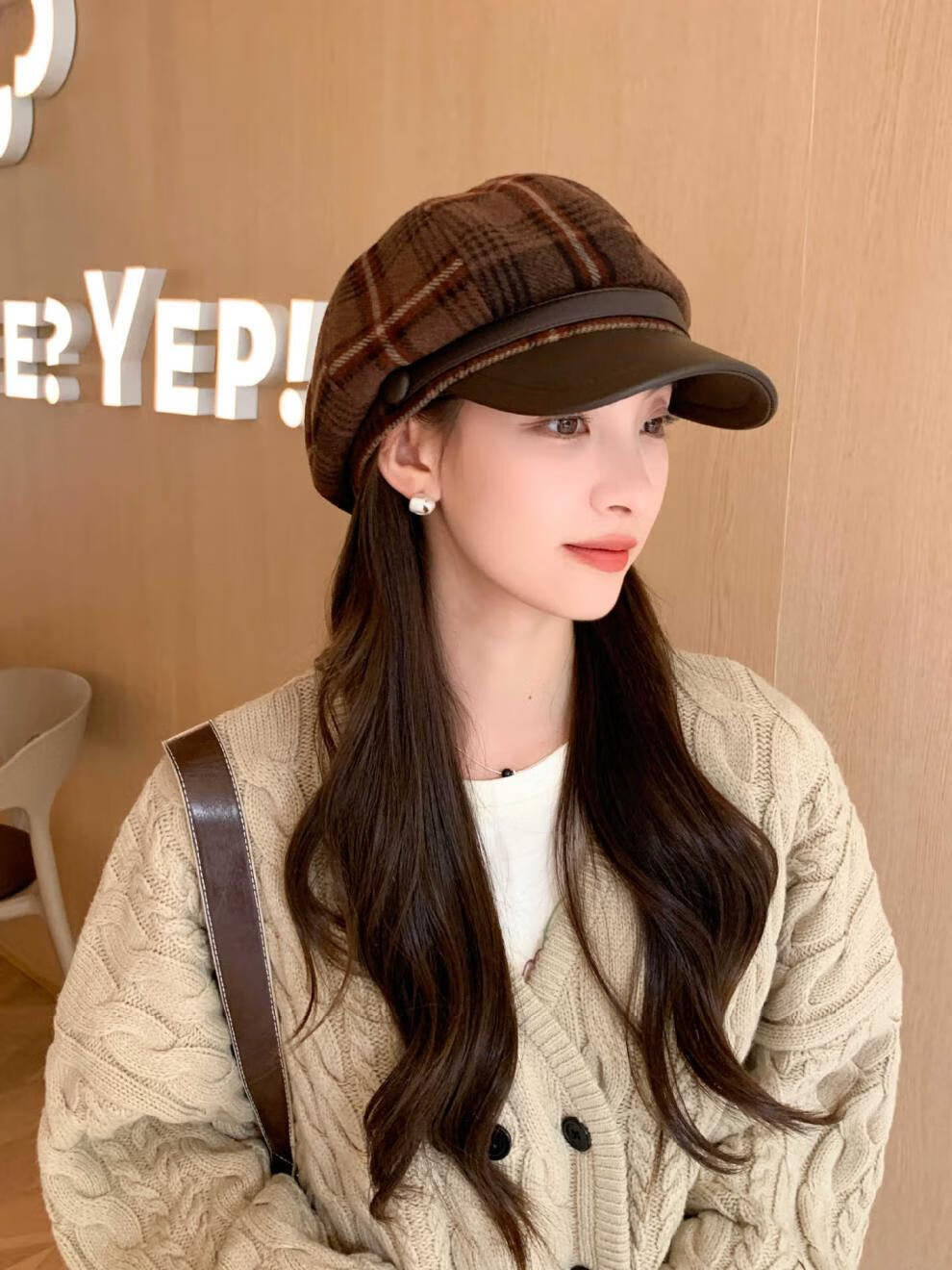 Korean retro leather belt plaid octagonal hat for women winter warm woolen beret for women with leather brim stitching newspaper hat red plaid