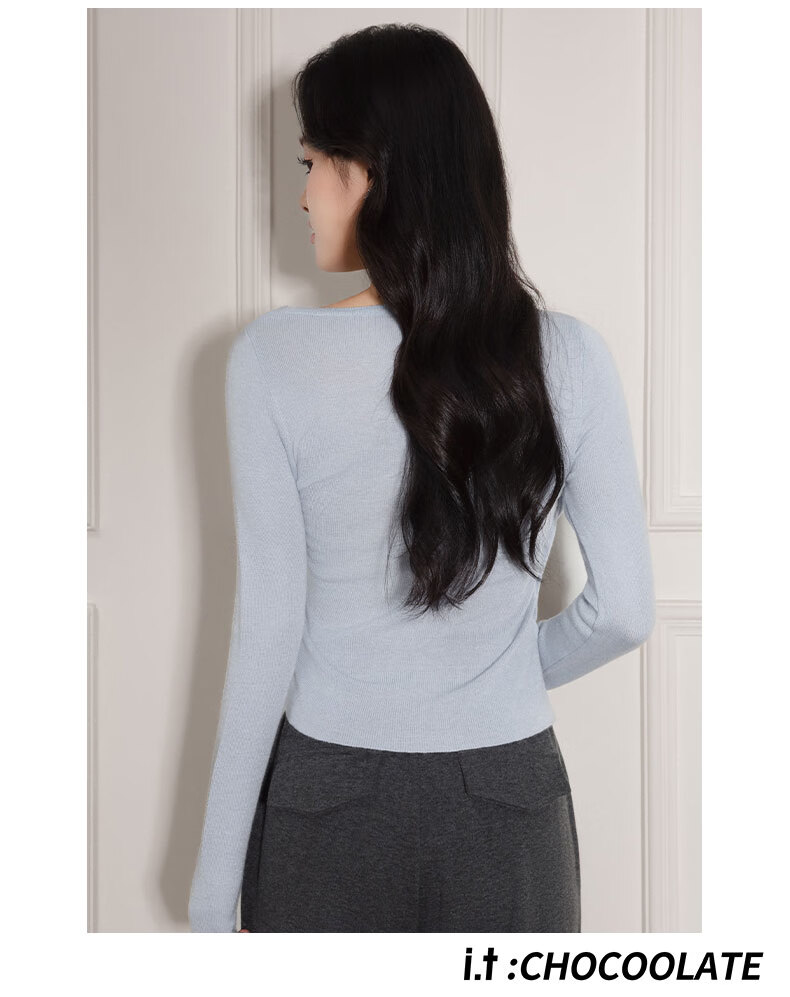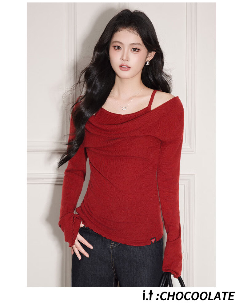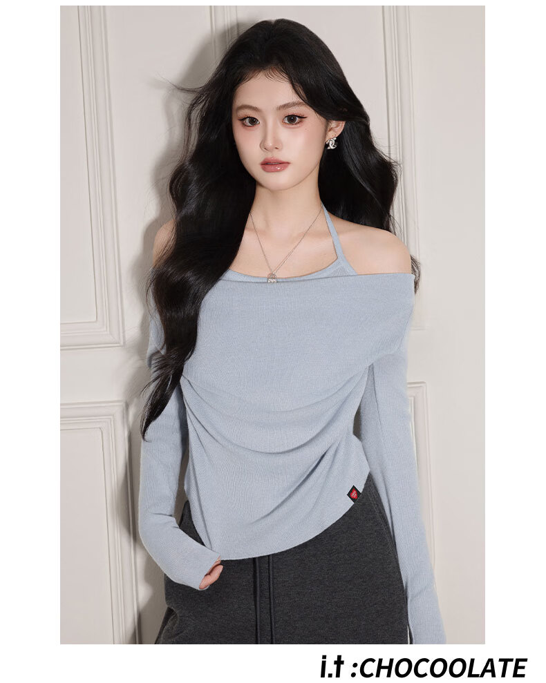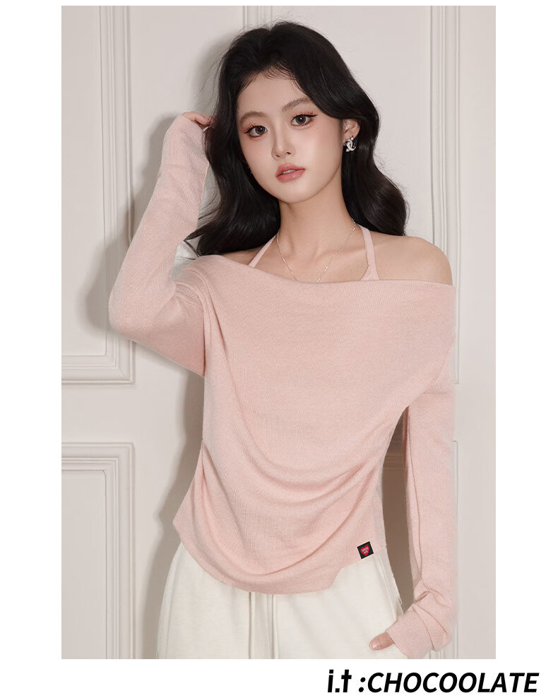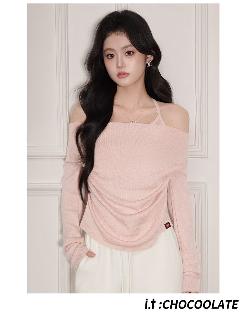 CHOCOOLATE it women's sweater women's sweet and spicy style halter neck off-shoulder sweater women's winter pleated waist bottoming shirt top pink one size