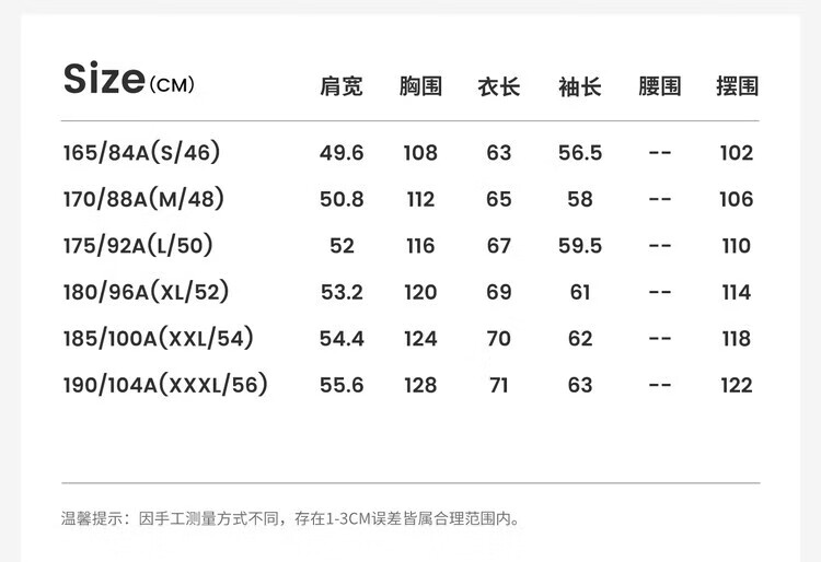 China (cm) 165 / 88-90 170 / 96-98 175 / 108-110 180 / 118-122 185 / 126-130