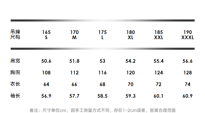 China (cm) 165 / 88-90 170 / 96-98 175 / 108-110 180 / 118-122 185 / 126-130