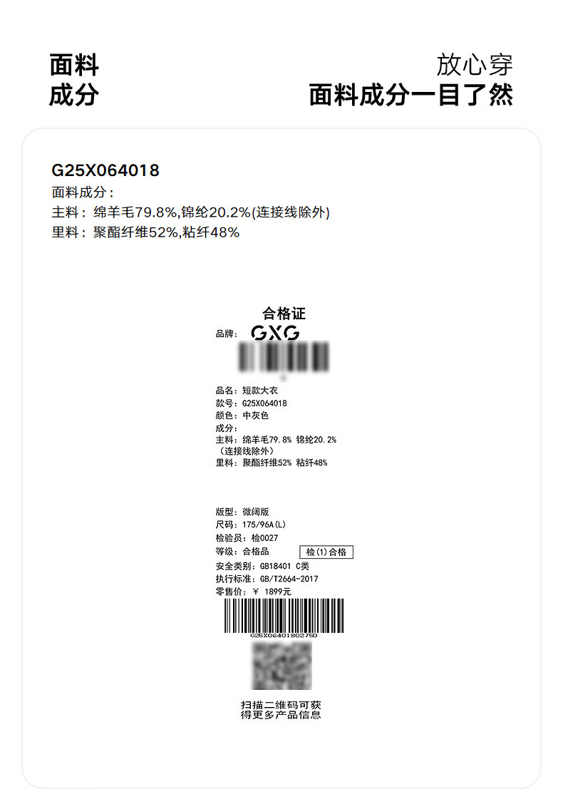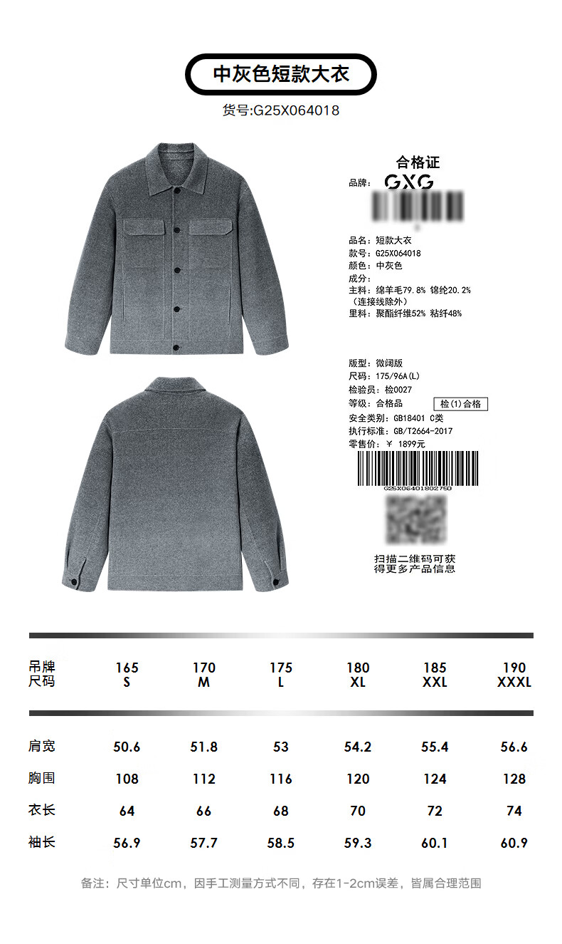 GXG Men's Wear Shopping Mall Same Style Two-Color Gradient Short Coat 2025 Winter New Arrival G25X064018 Medium Gray XL