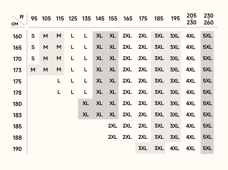 China (cm) 160-165/84-86 165-170 / 88-90 167-172 / 92-96 168-173 / 98-102 170-176 / 106-110