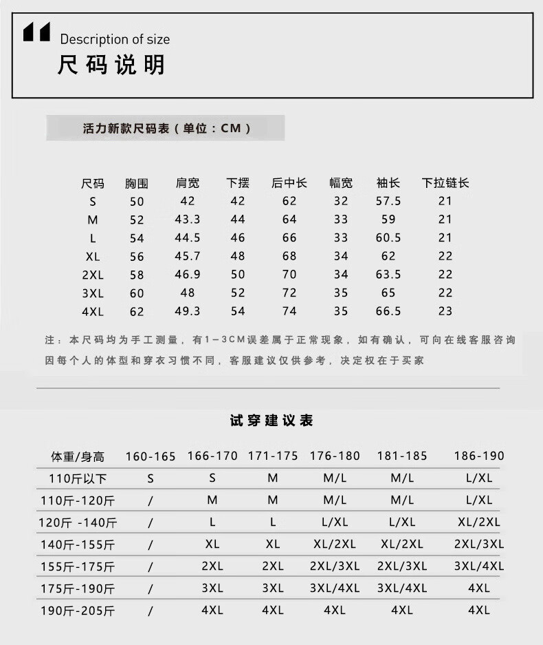 China (cm) 165 / 88-90 170 / 96-98 175 / 108-110 180 / 118-122 185 / 126-130