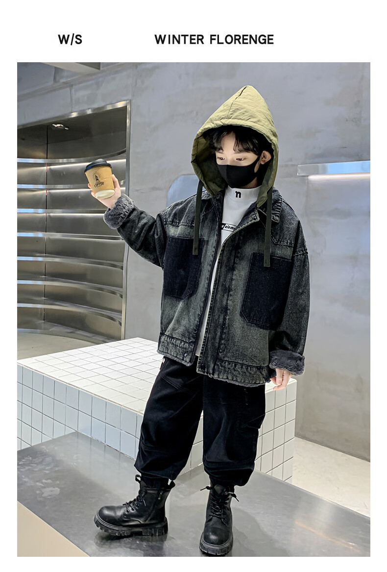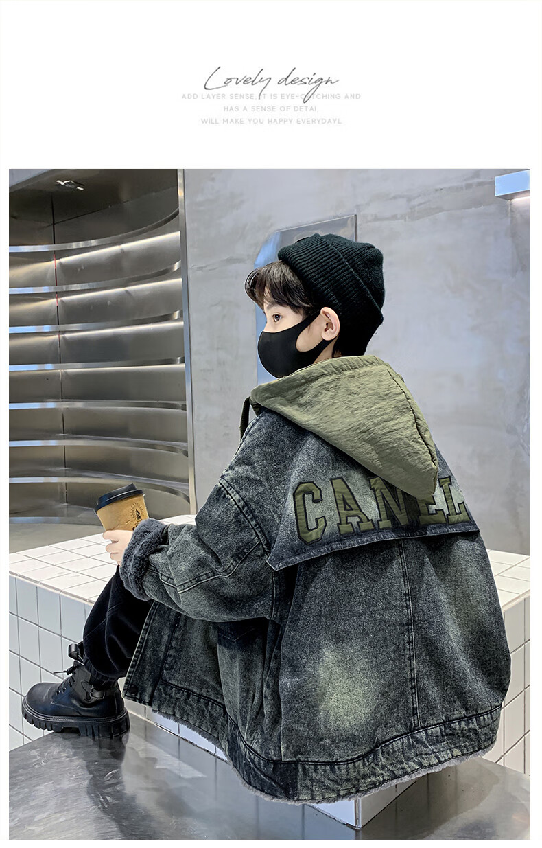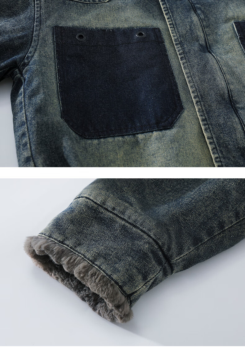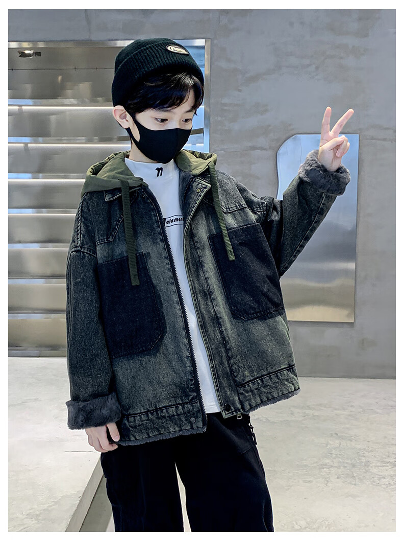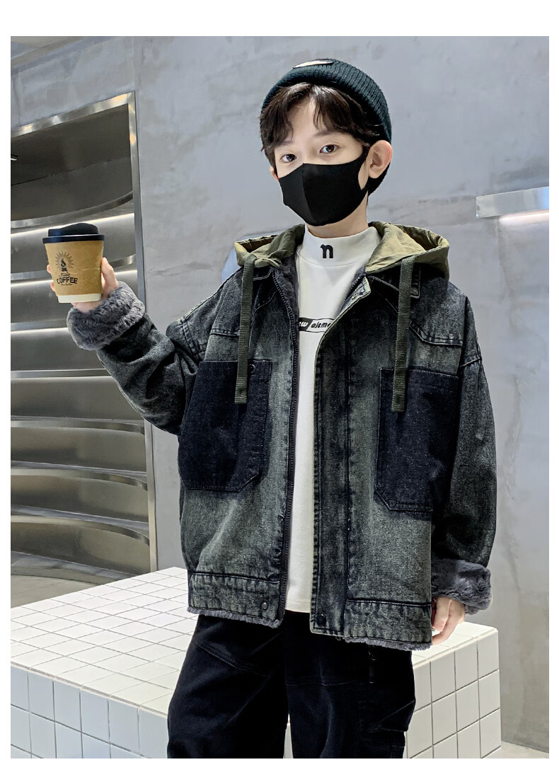 Zengzhi denim boys' velvet denim jacket autumn and winter 2025 new children's winter warm and thickened big children's winter jacket gray blue BB velvet thickened denim jacket 120