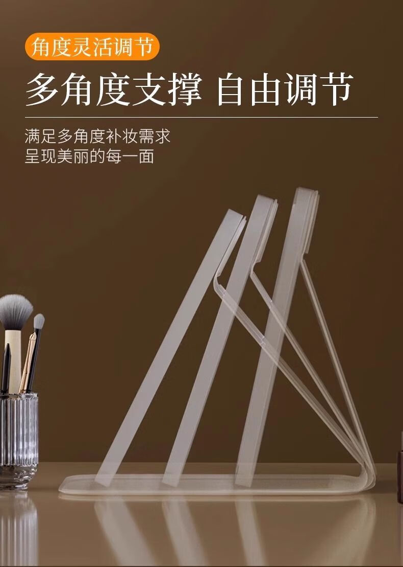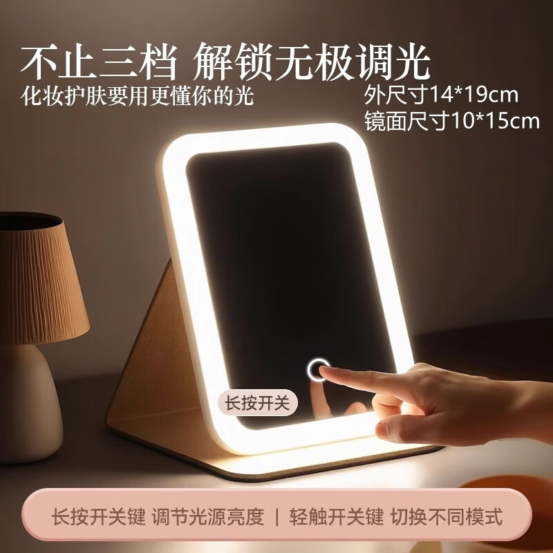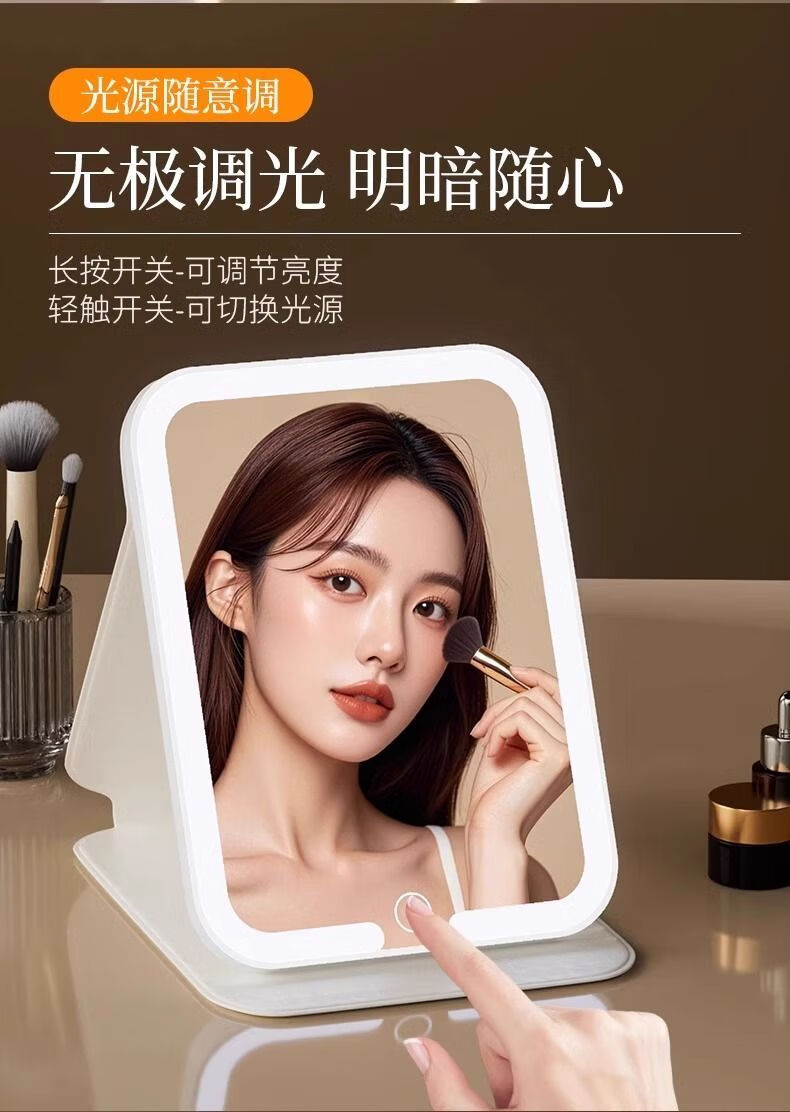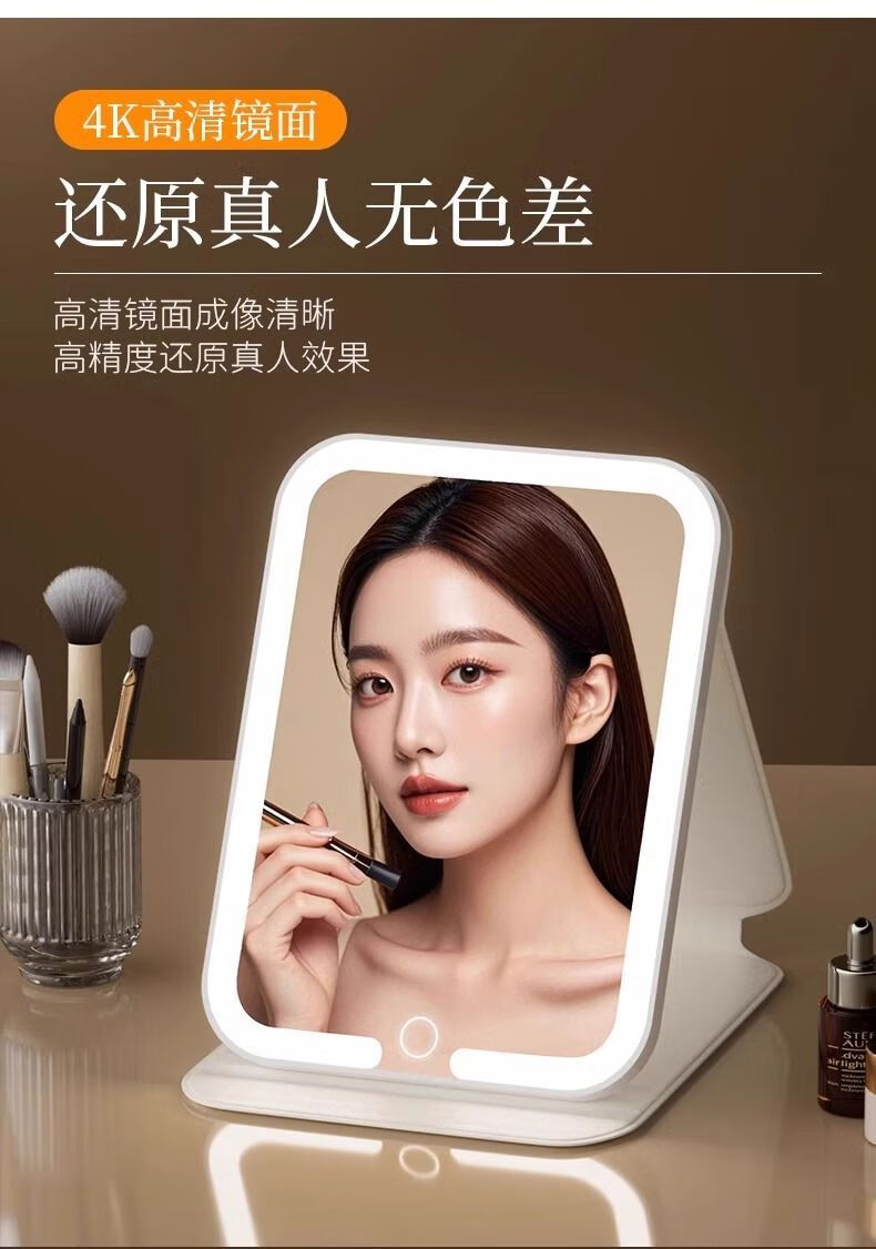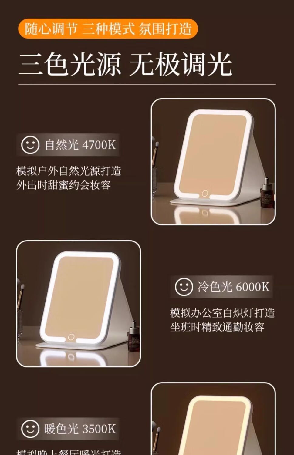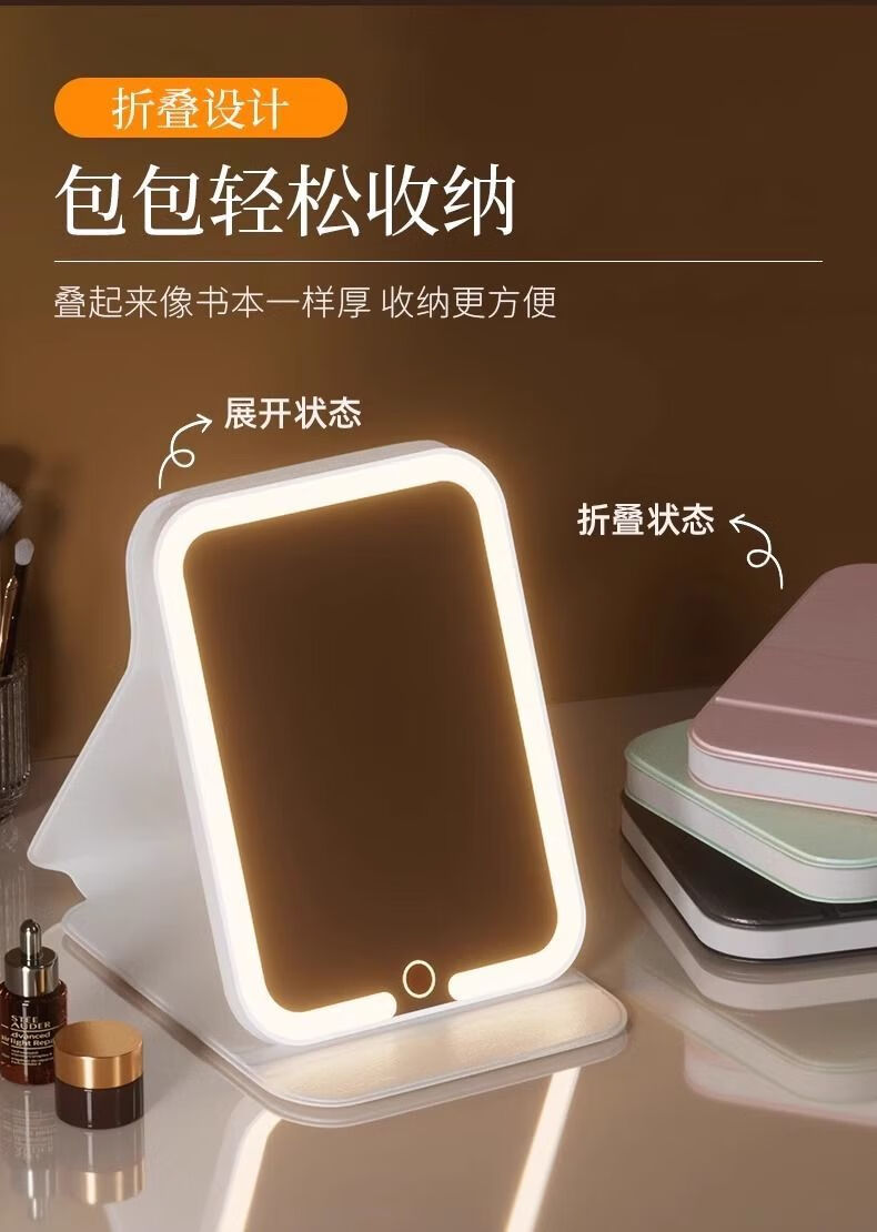 LED cosmetic mirror with light, foldable dimming, portable ins style student dormitory desktop desktop mirror new style (HD mirror) three-color light source + rechargeable - white