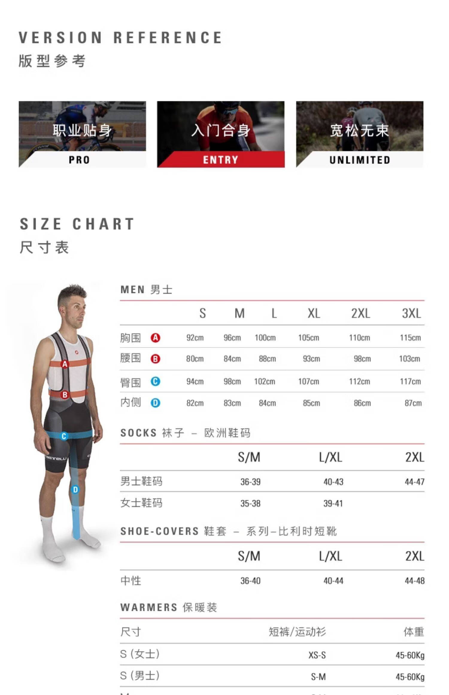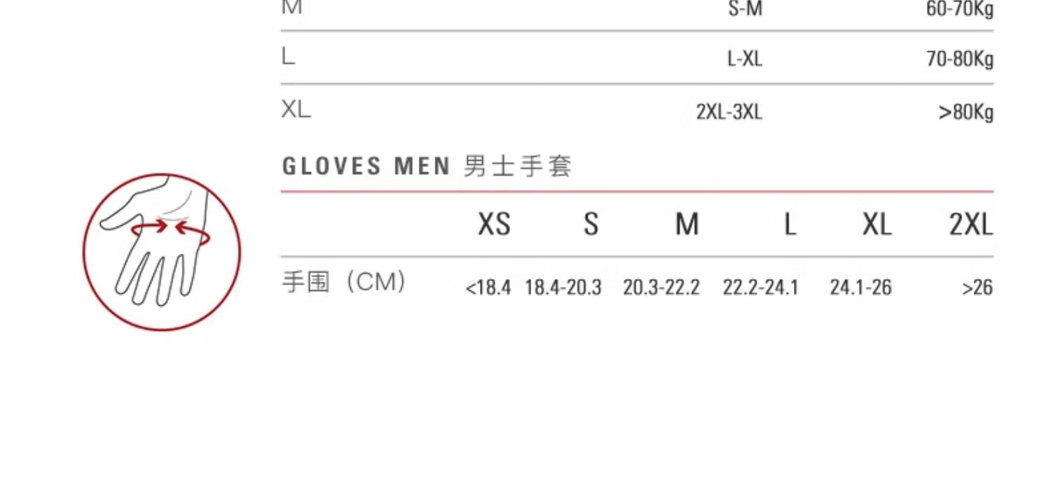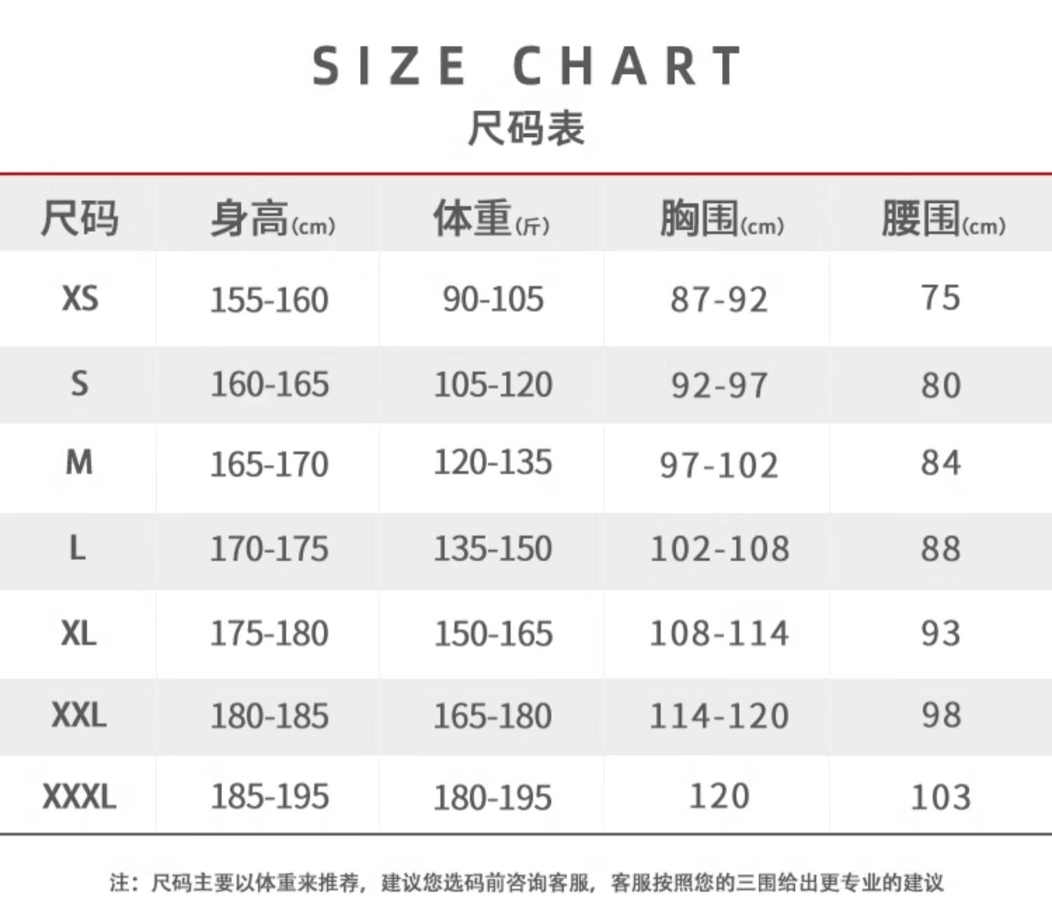 China (cm) 165 / 88-90 170 / 96-98 175 / 108-110 180 / 118-122 185 / 126-130