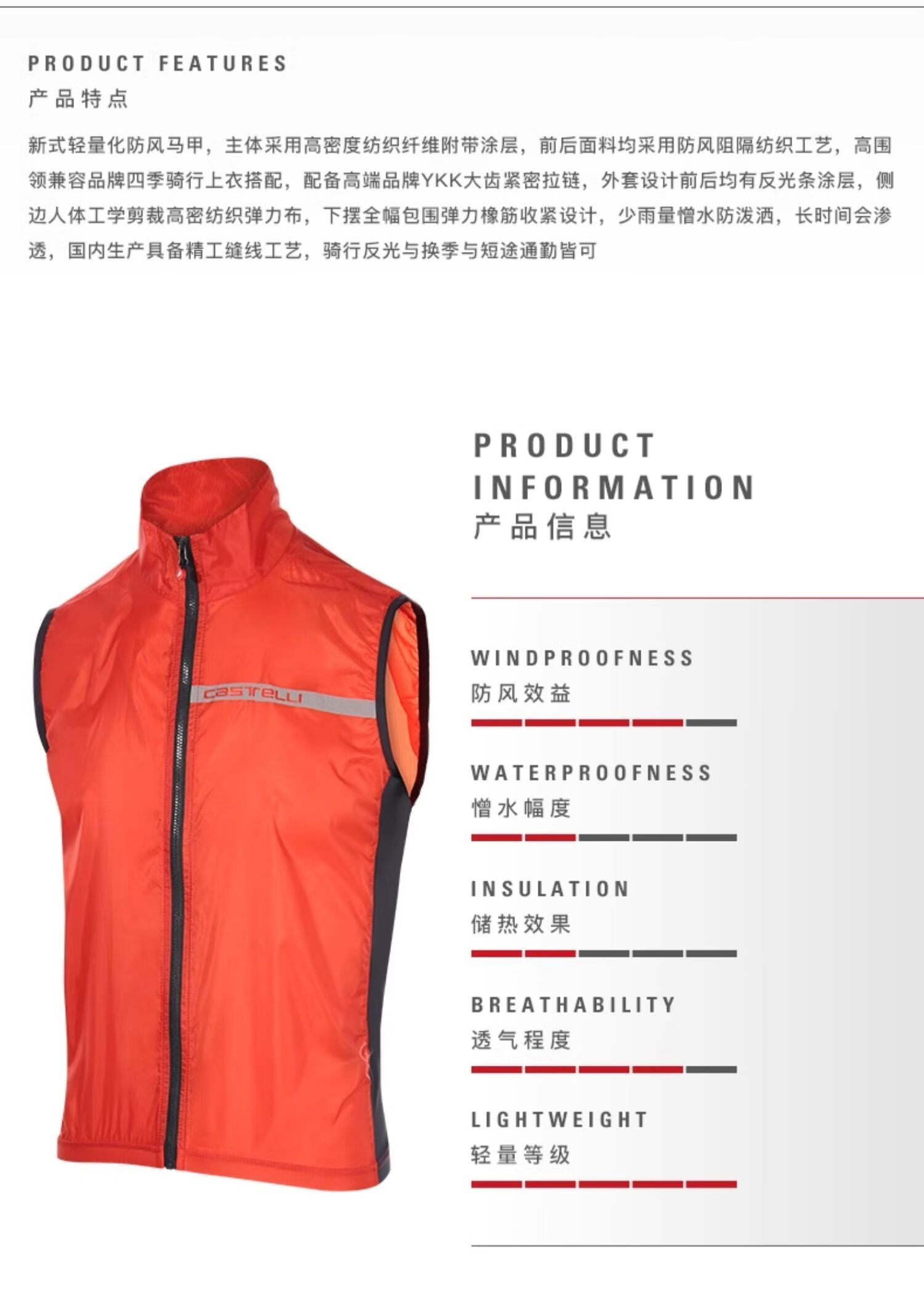 CASTELLI Scorpion men's spring and autumn windproof cycling jersey vest lightweight vest close-fitting professional tailoring 4521512 085 light black XS