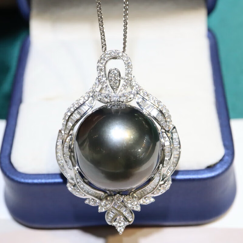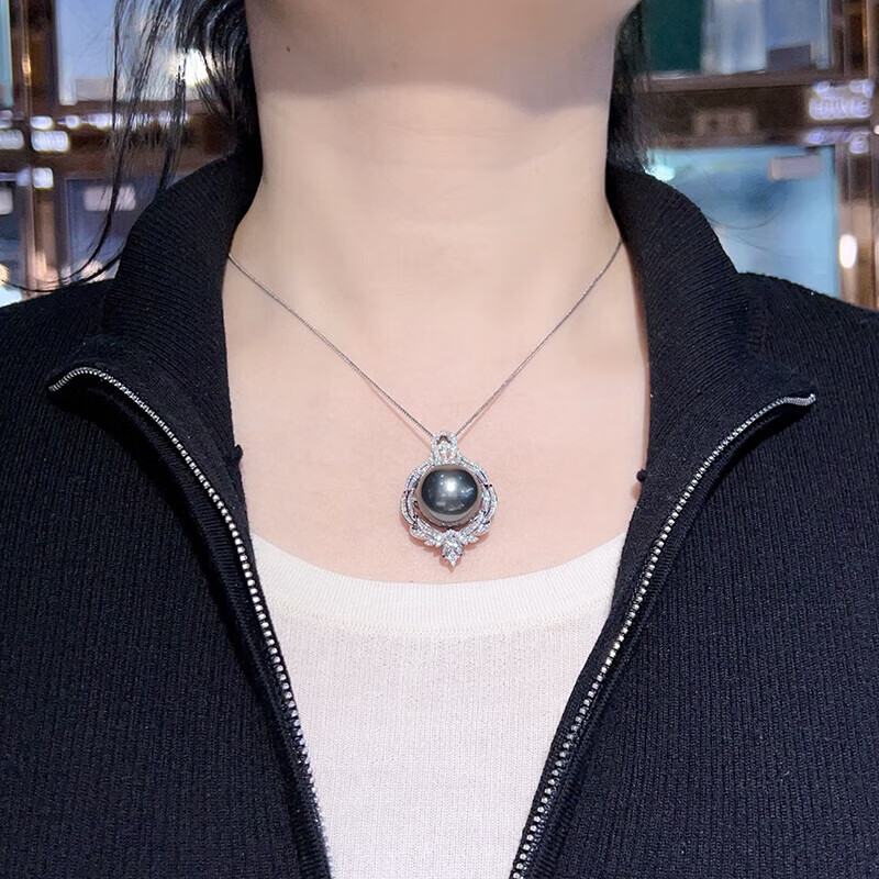 Zheng Xingya Black Pearl Pendant Seawater Necklace Gold Inlaid Diamond Temperament Clavicle Chain for Birthday Gift 17.8mm 7.8mm