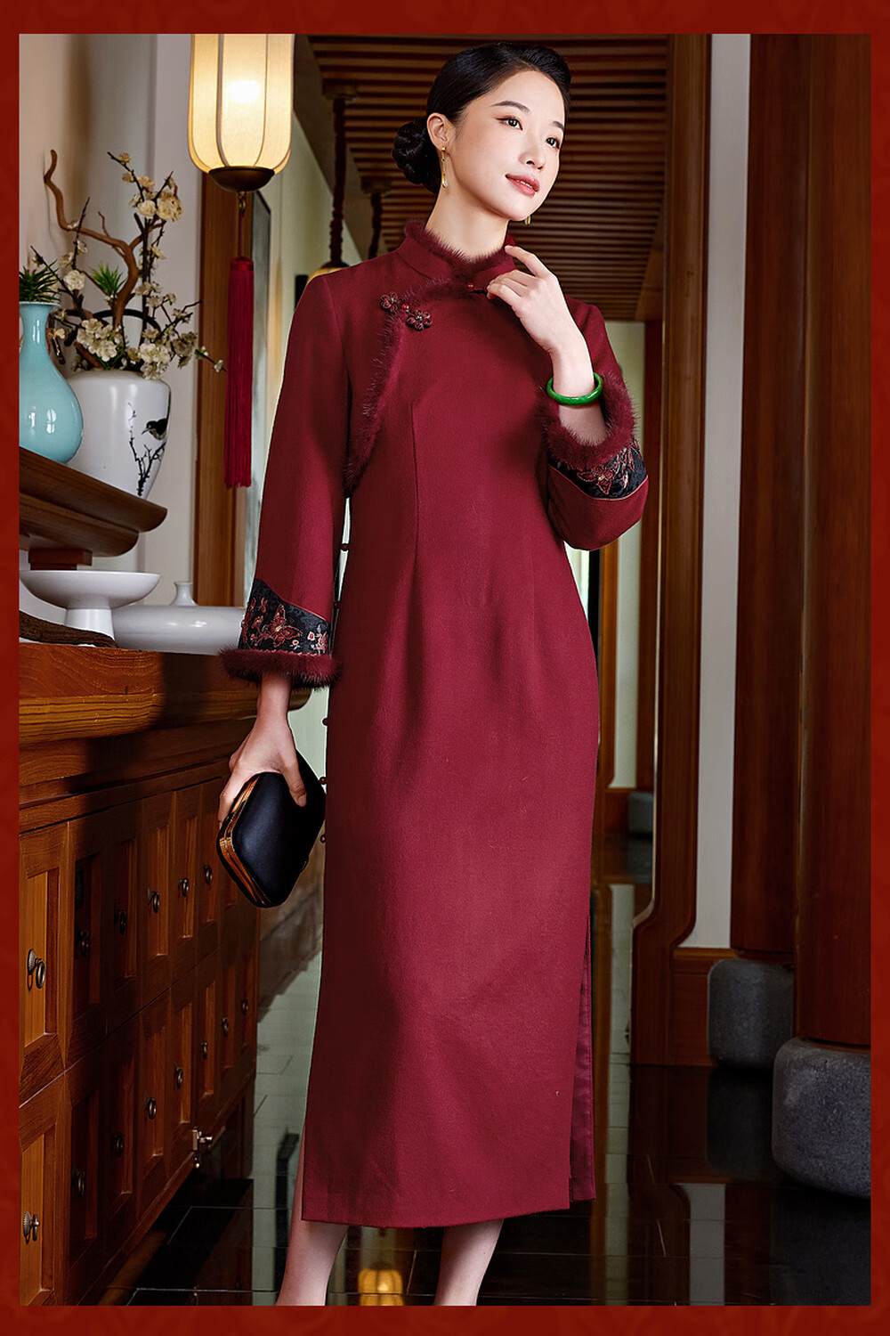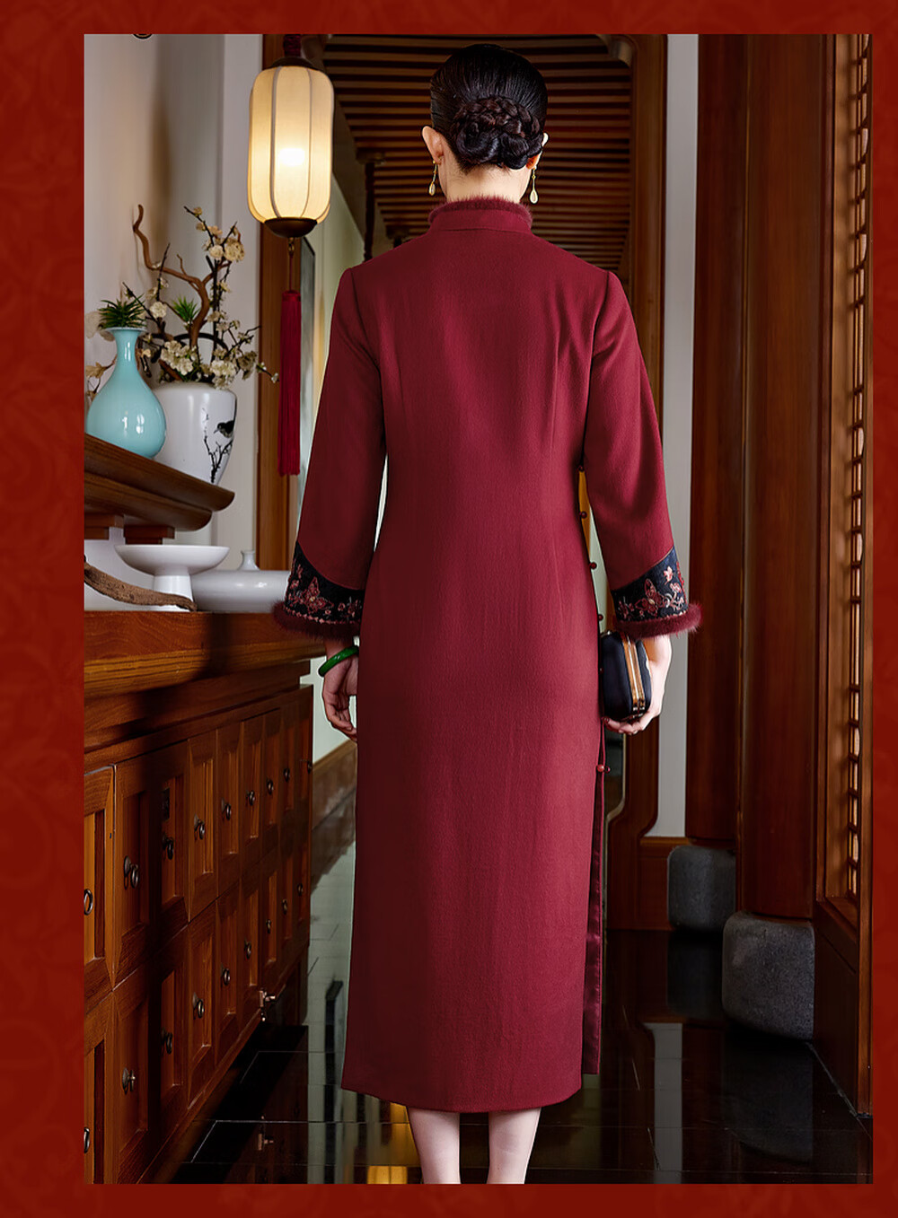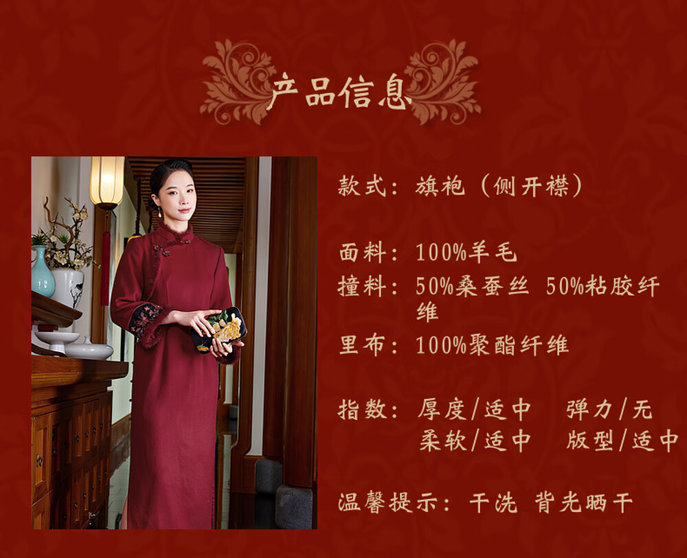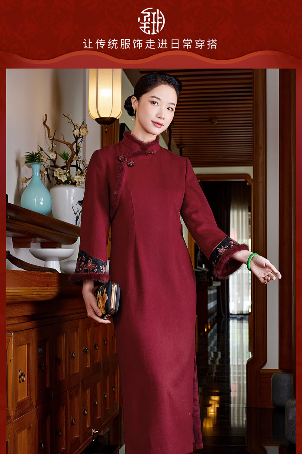 Xiyue original 100% wool woolen long cheongsam Chinese style embroidered classical high-end banquet dress autumn and winter red XL weight 115~125
