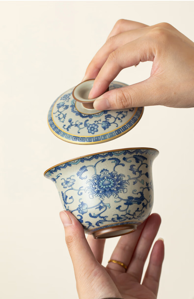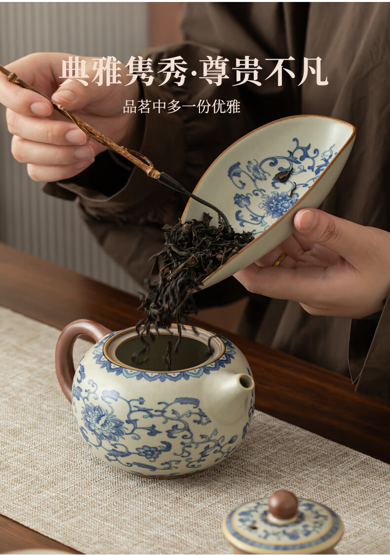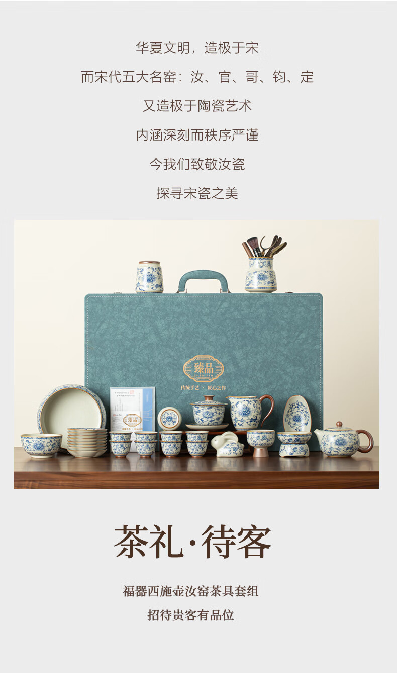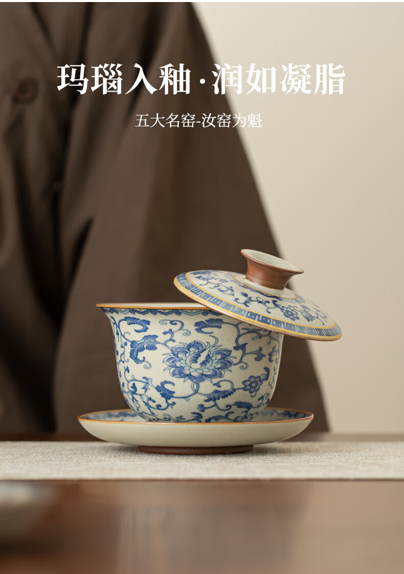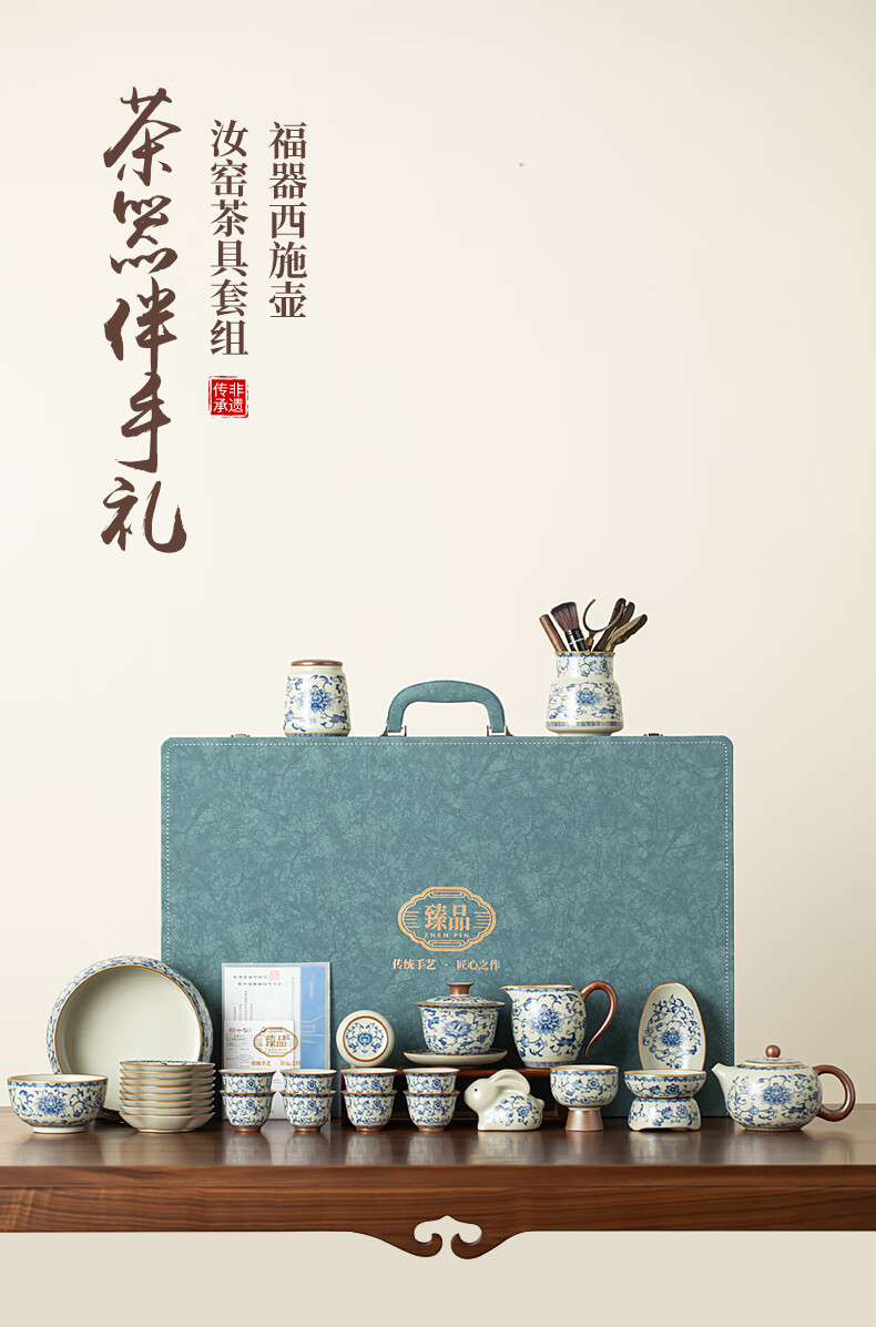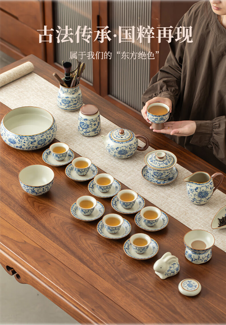 Fantu Ru Kiln Kung Fu Tea Set Hover Cover Bowl Xi Shi Complete Set of Tea Cups and Teapots Light Luxury High-end Master Class Gift Box Fu Xi Shi Pot Blue and White Lotus-Bell Cup Large Set 30 Pieces