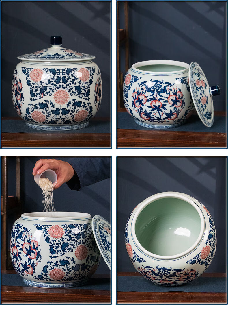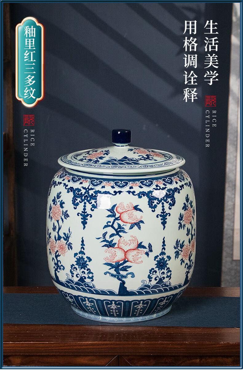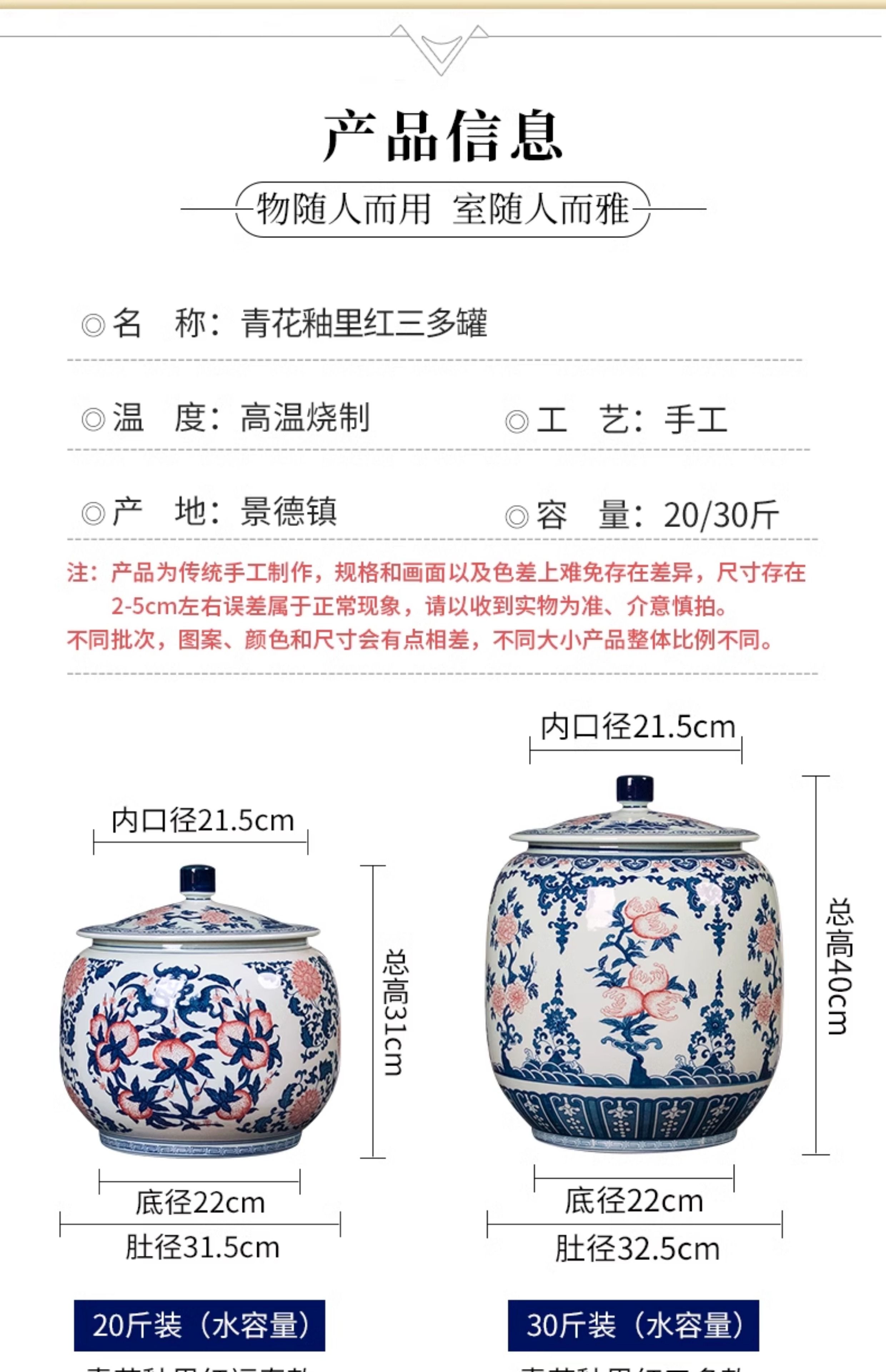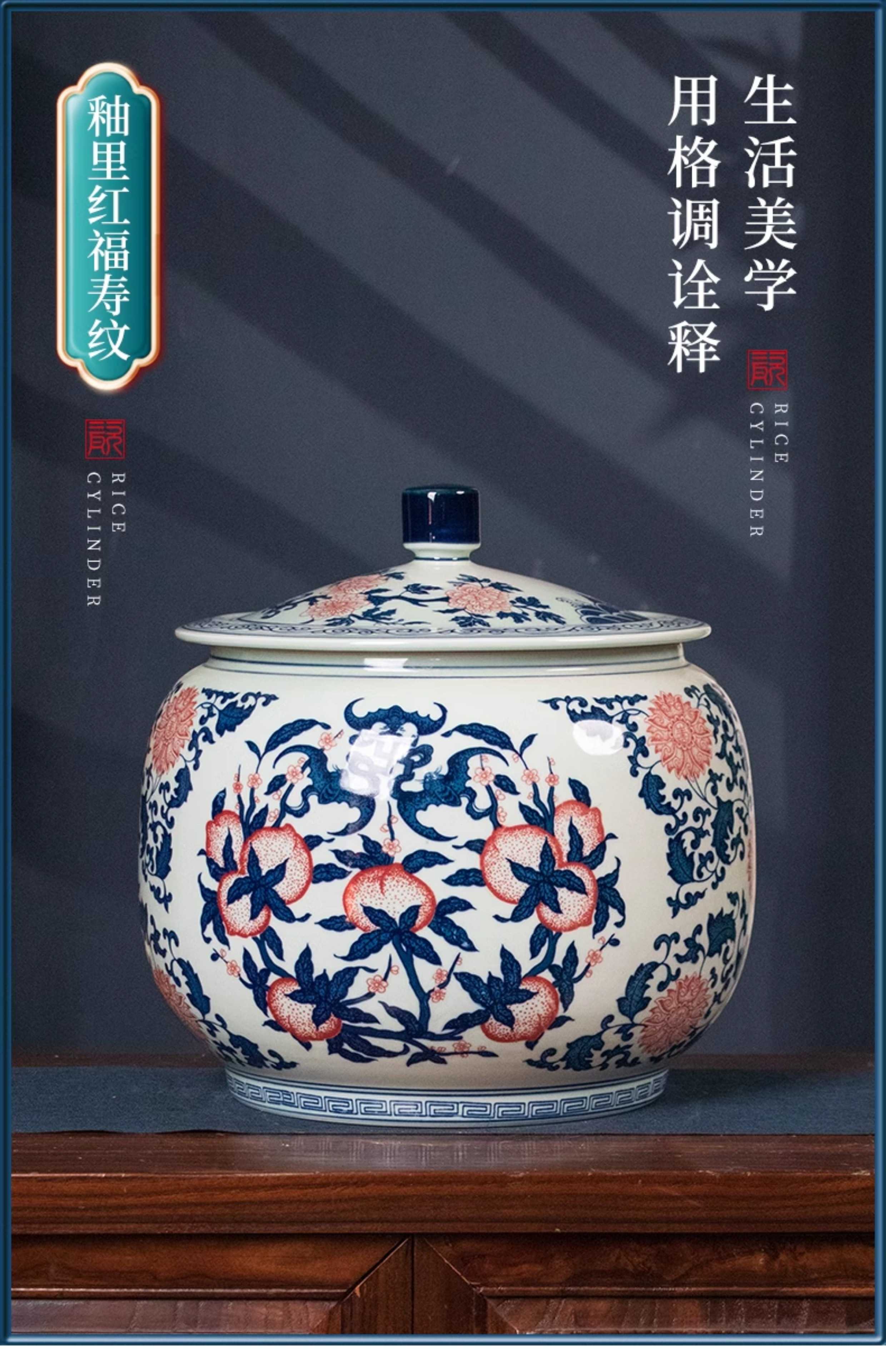 MEOD Jingdezhen ceramic rice jar Jingdezhen ceramic high-end tea jar rice cylinder noodles Flour bucket 20 Jin Jin equals 0.5 kg 30 moisture-proof 20 Jin Jin equals 0.5 kg Blue and white underglaze red blessing and longevity pattern Water capacity