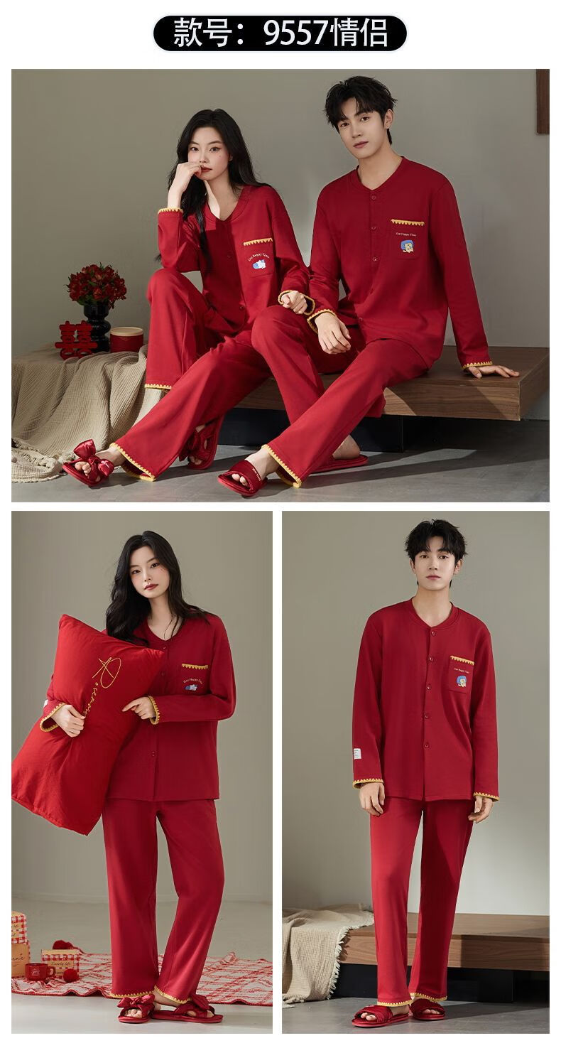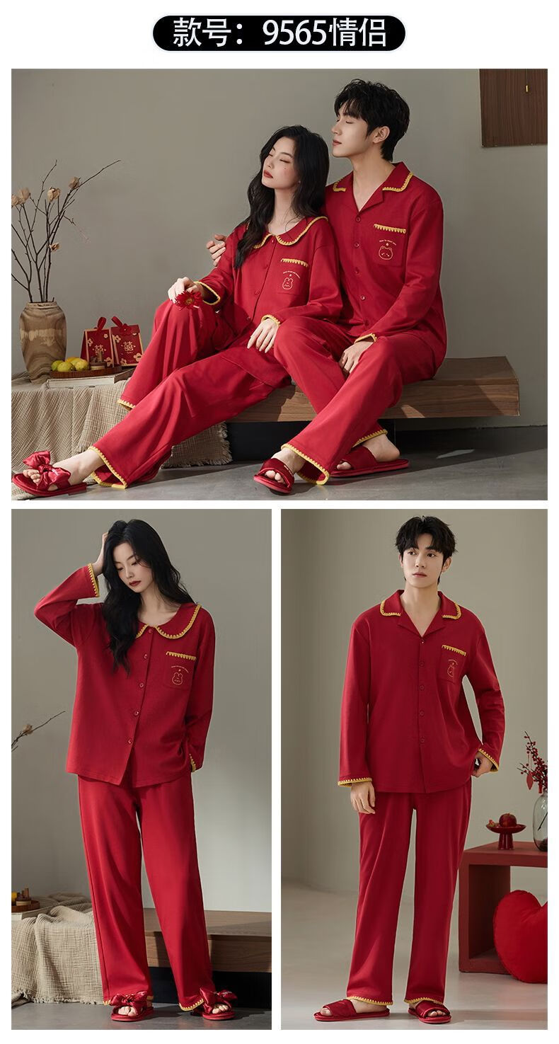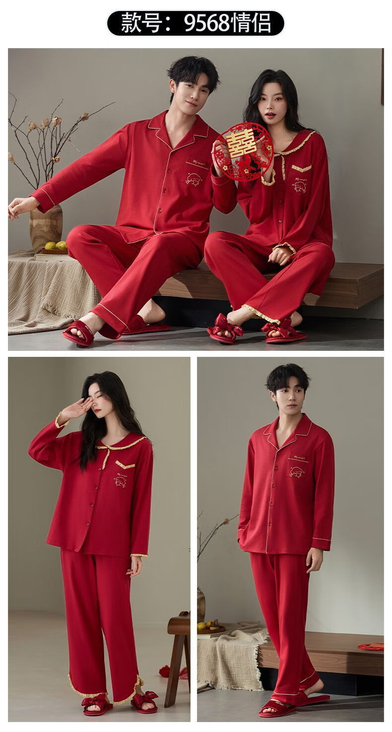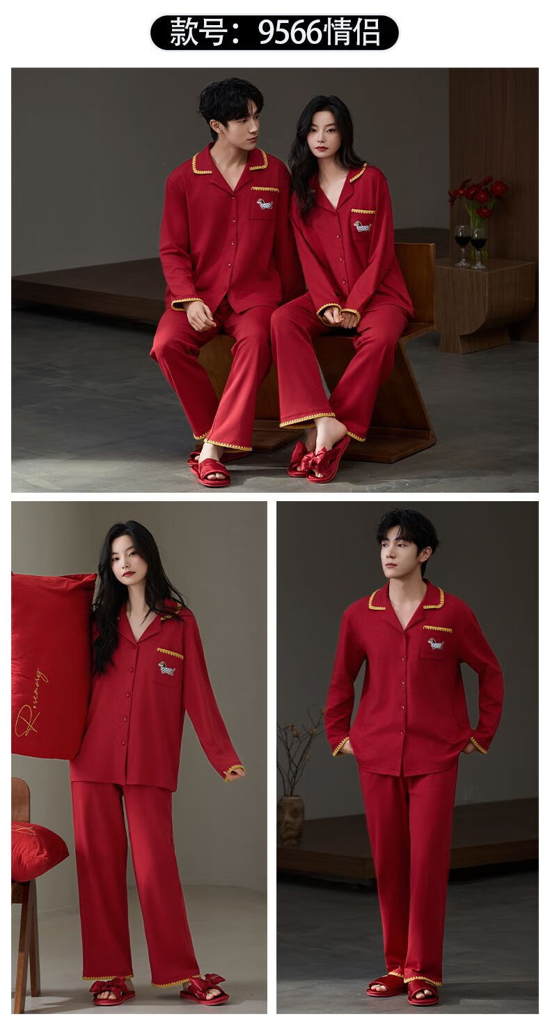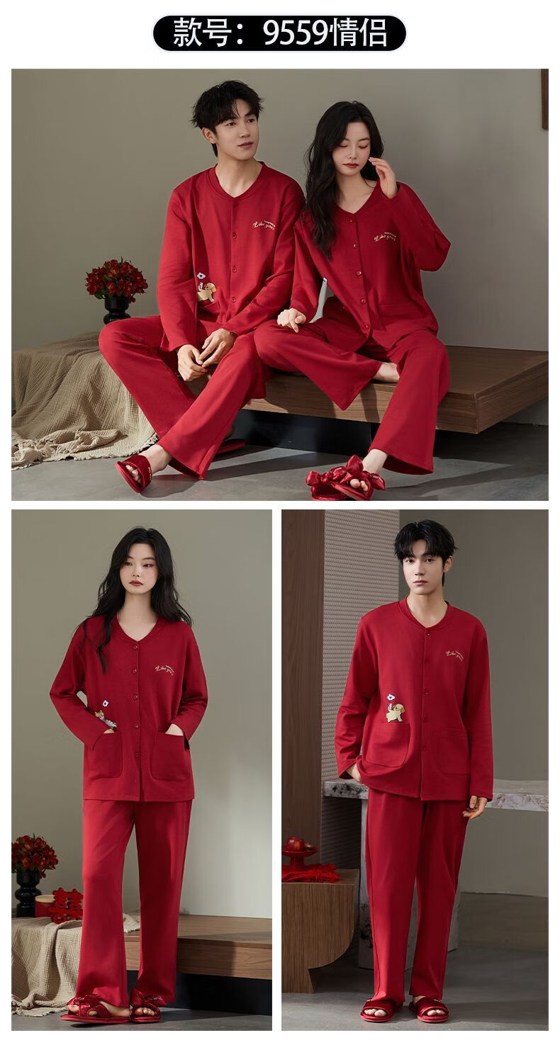 Modal Red Pajamas Spring and Autumn Wedding Newlyweds Couple Set Pure Cotton Home Clothes Animal Year Cardigan Set High Quality Couple 9557 M Women's
